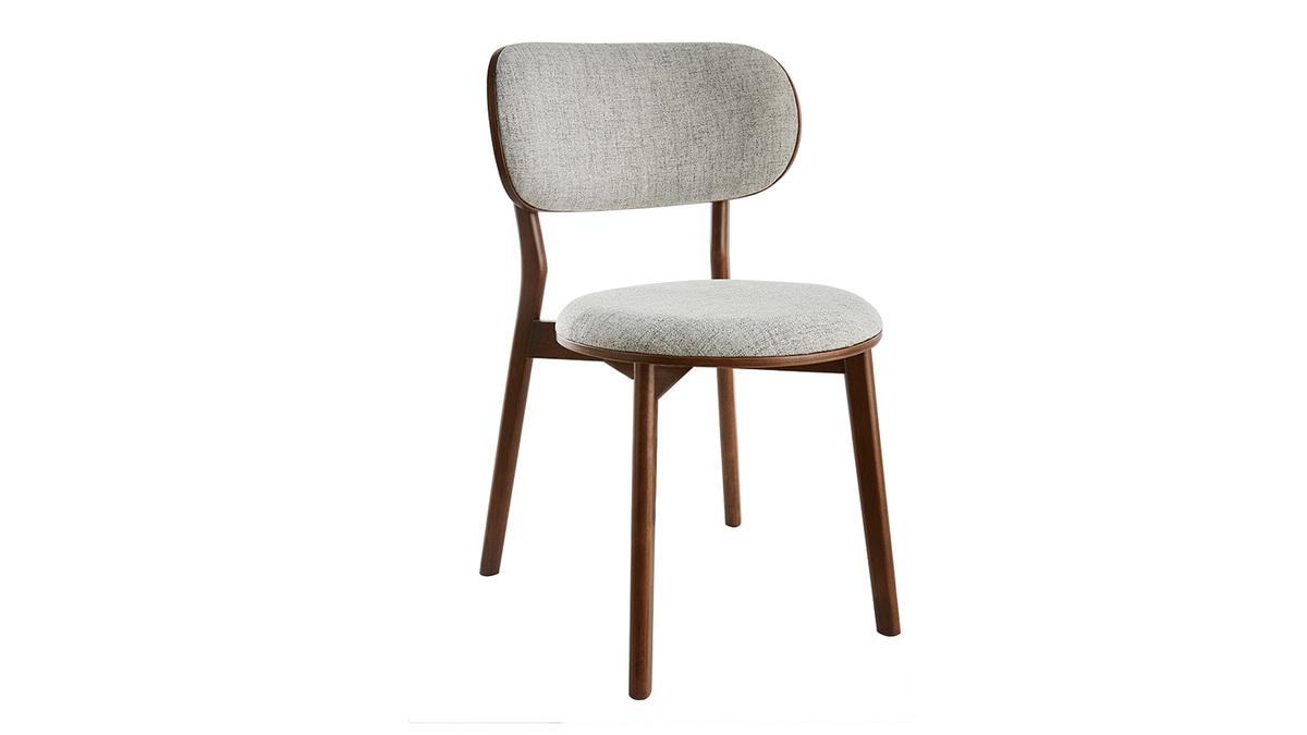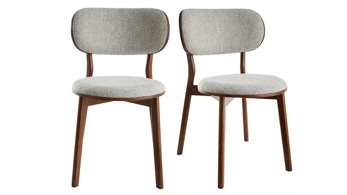 Chaises scandinaves en tissu gris clair et bois foncé noyer FAUVETTE livrées par lot de 2. Livrées prêtes à assembler.