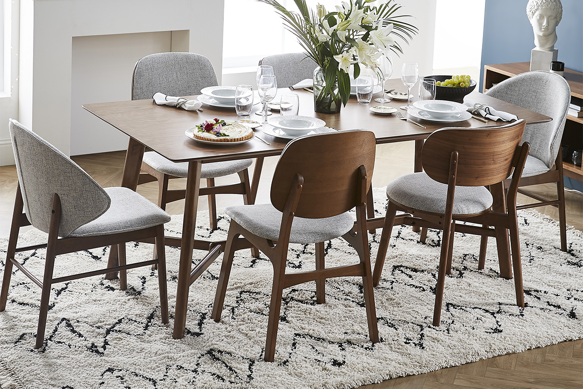 Pour un espace repas placé sous le signe de la douceur, on associera ces chaises scandinave en tissu et bois à une table à manger d'inspiration nordique à la ligne douce un brin rétro.