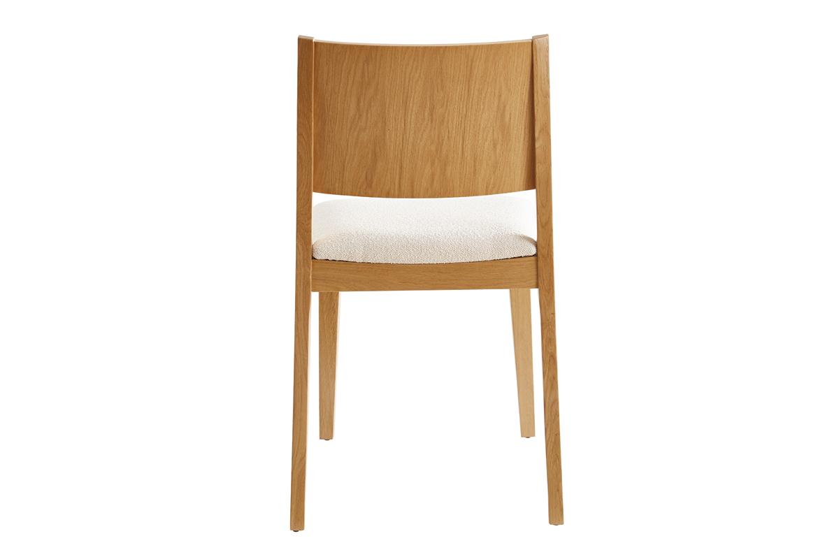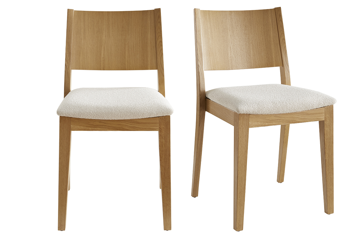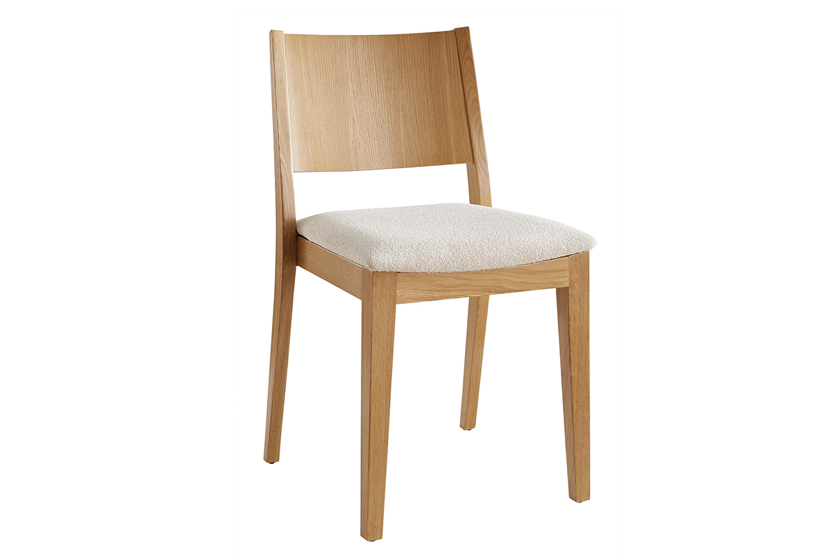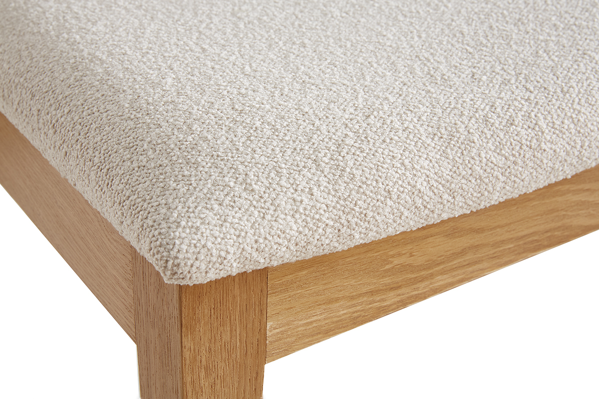Inspirée des codes vintage, la structure épurée en bois clair est modernisée par un élégant revêtement en tissu effet laine bouclée écru. Une association à la fois chic et sobre très réussie ! Si on imagine leurs silhouettes harmonieuses camper dans de nombreuses ambiances déco, ce duo de charme apportera une note rétro dans un coin repas à l'esprit dandy chic.