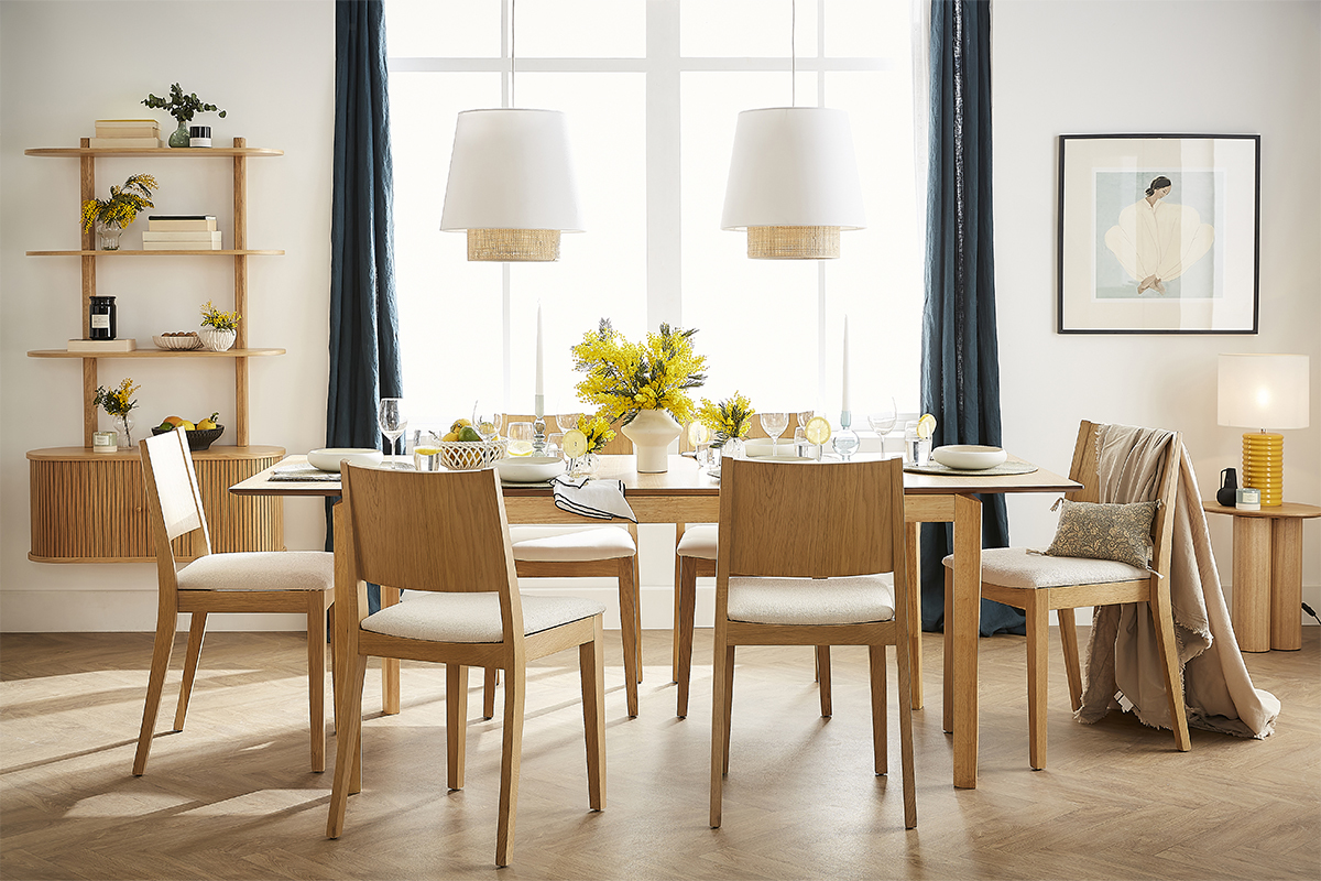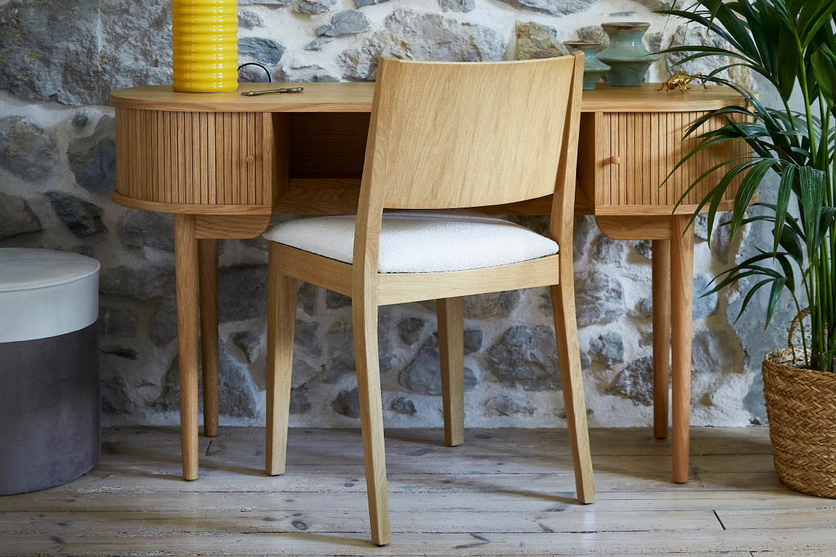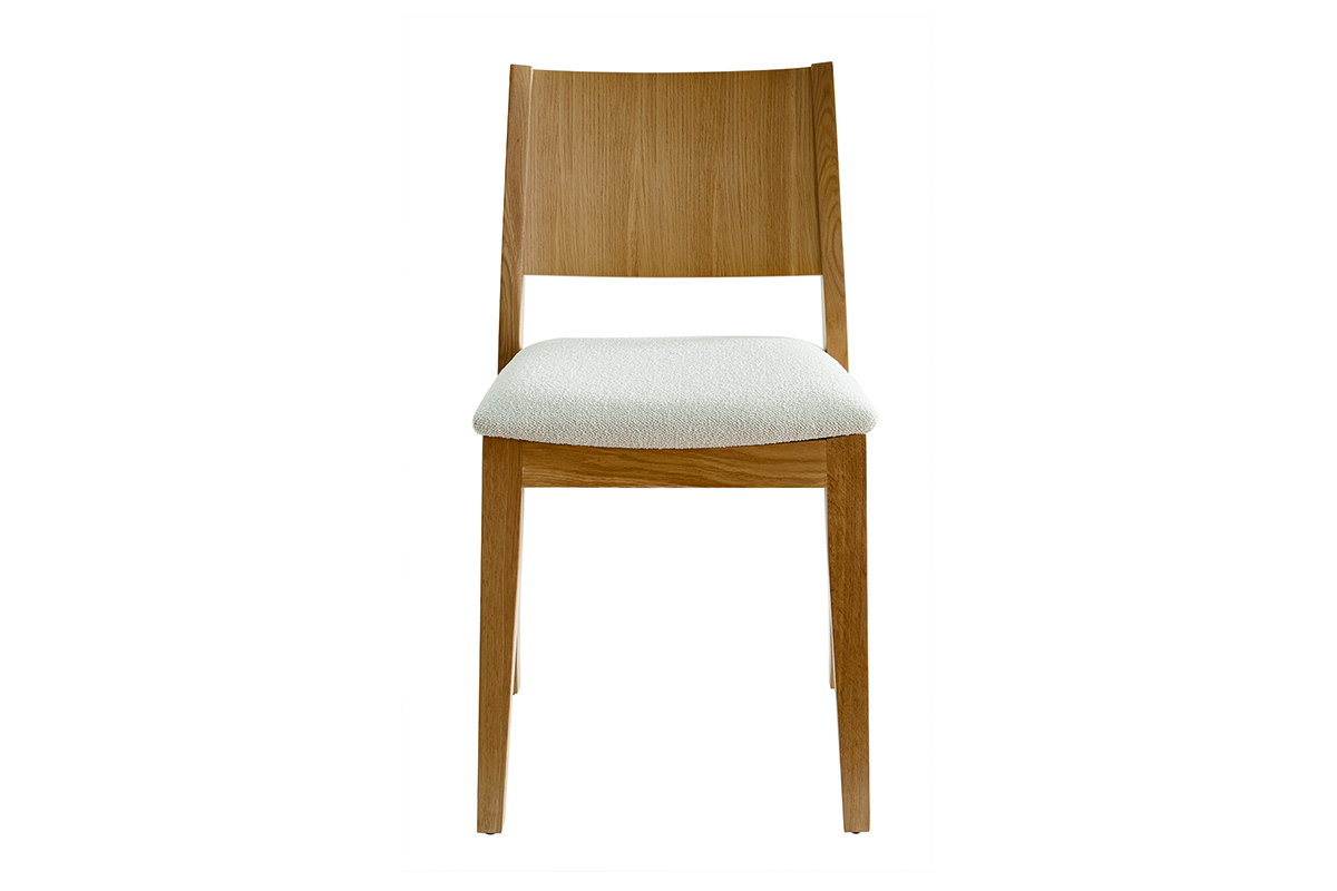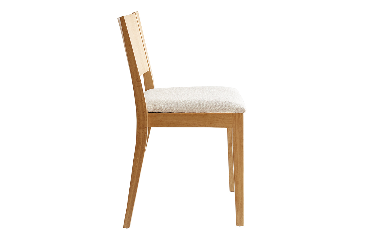 Inspirée des codes vintage, la structure épurée en bois clair est modernisée par un élégant revêtement en tissu effet laine bouclée écru. Une association à la fois chic et sobre très réussie ! Si on imagine leurs silhouettes harmonieuses camper dans de nombreuses ambiances déco, ce duo de charme apportera une note rétro dans un coin repas à l'esprit dandy chic.