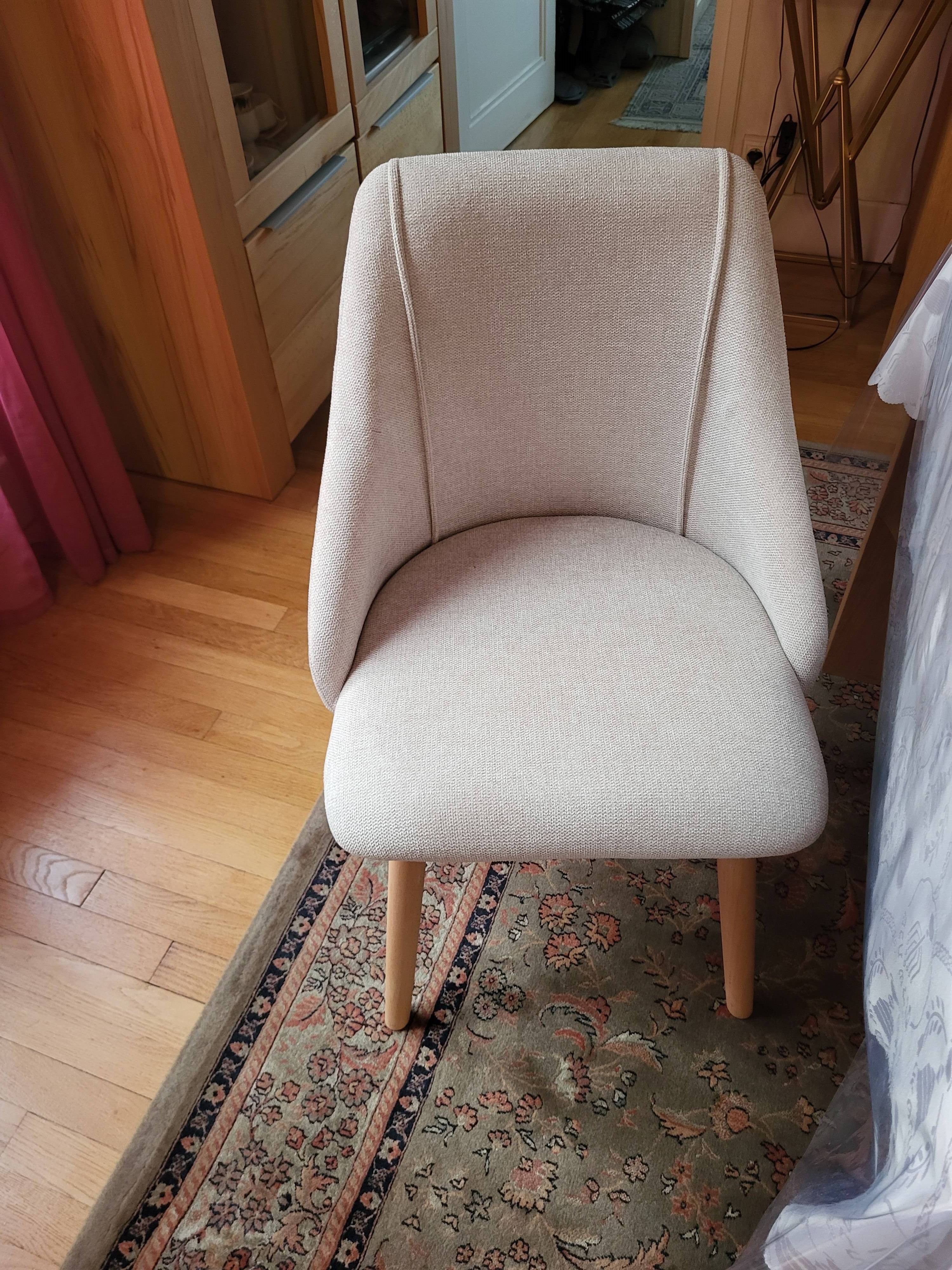 La trame du tissu effet velours texturé terracotta s'accorde parfaitement avec le piètement en hêtre massif.