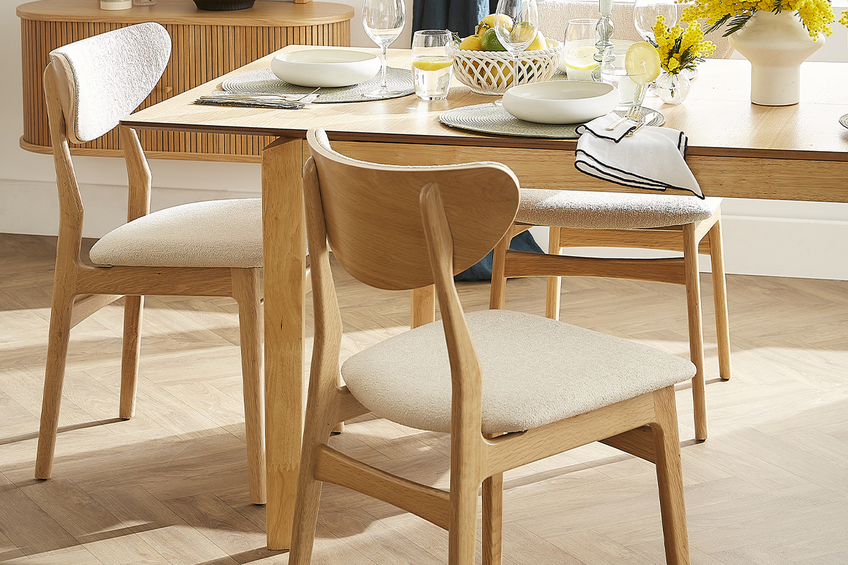 Avec les chaises scandinaves MAYA, courbes, bois clair et tissu bouclette ne forment plus qu'un !