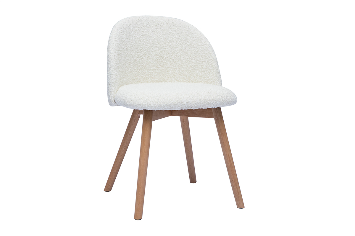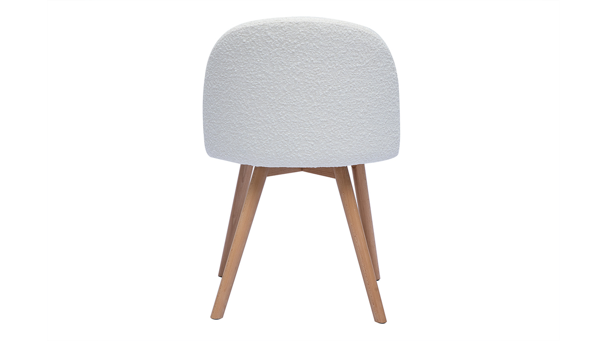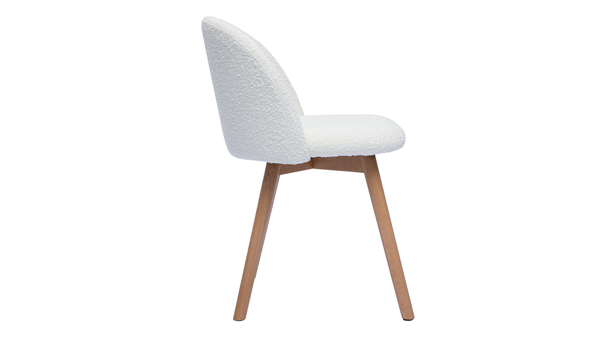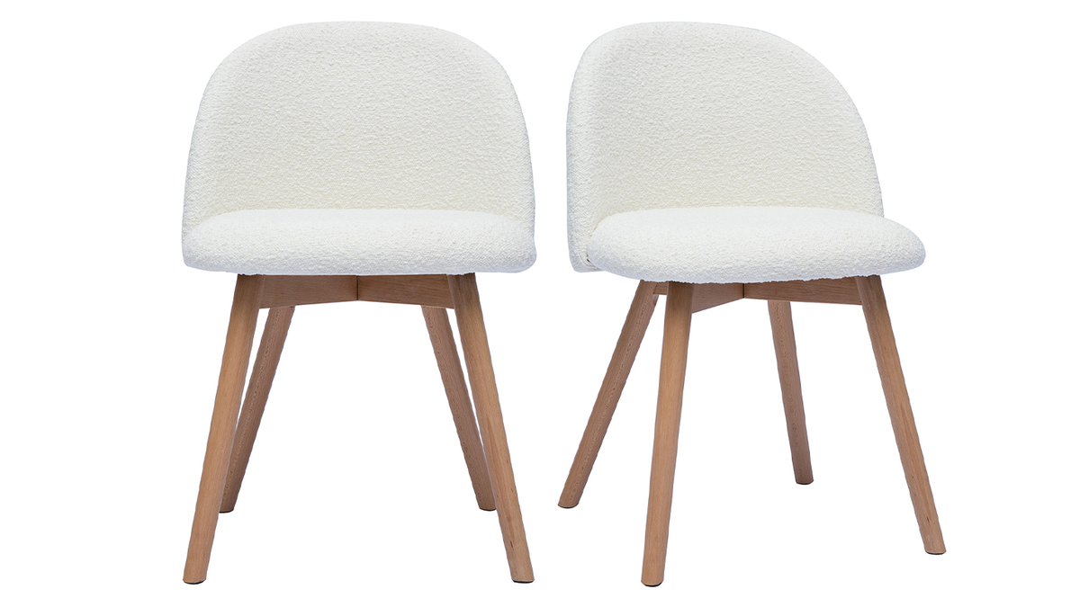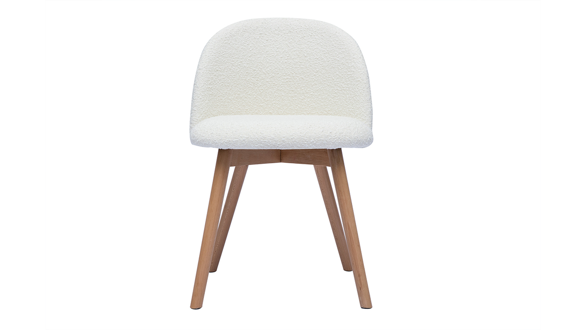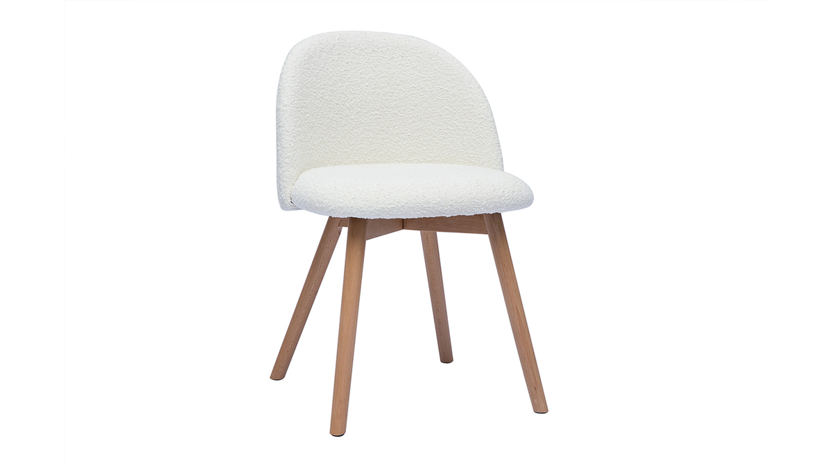 Tissu effet laine bouclée blanc, pieds en hêtre massif, lignes arrondies : ces chaises en bouclette et bois clair reflètent tout ce qui fait le charme du style nordique.