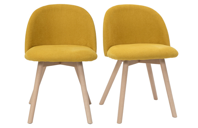 Tissu effet velours jaune mourtarde, pieds en hêtre massif, lignes arrondies : les chaises CELESTE reflètent tout ce qui fait le charme du style scandinave.