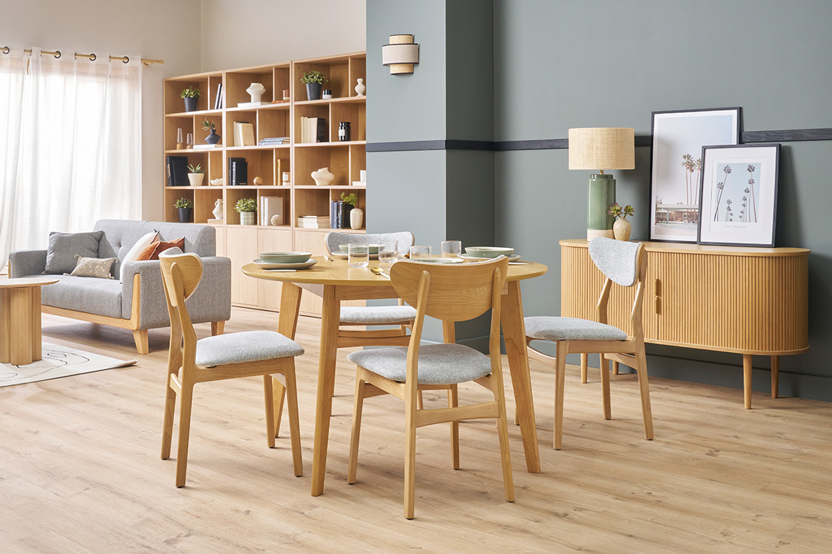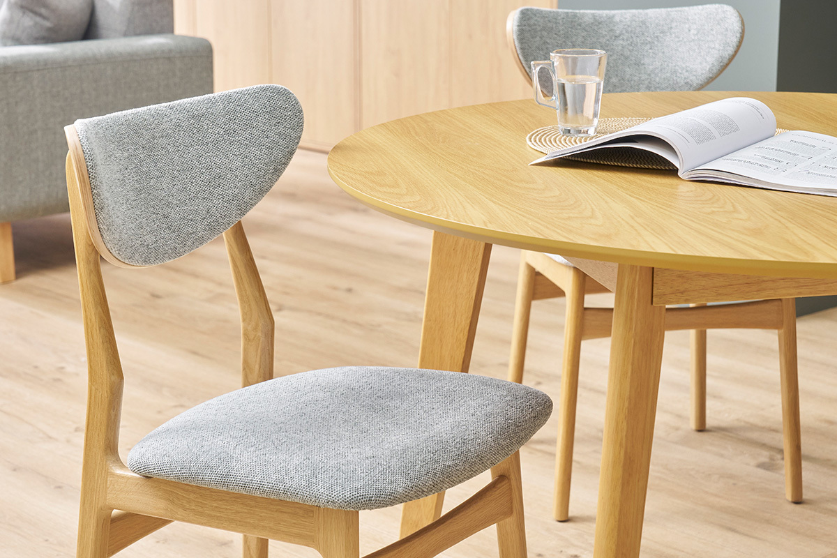 Avec les chaises scandinaves MAYA, courbes, bois clair et tissu effet velours texturé ne forment plus qu'un !