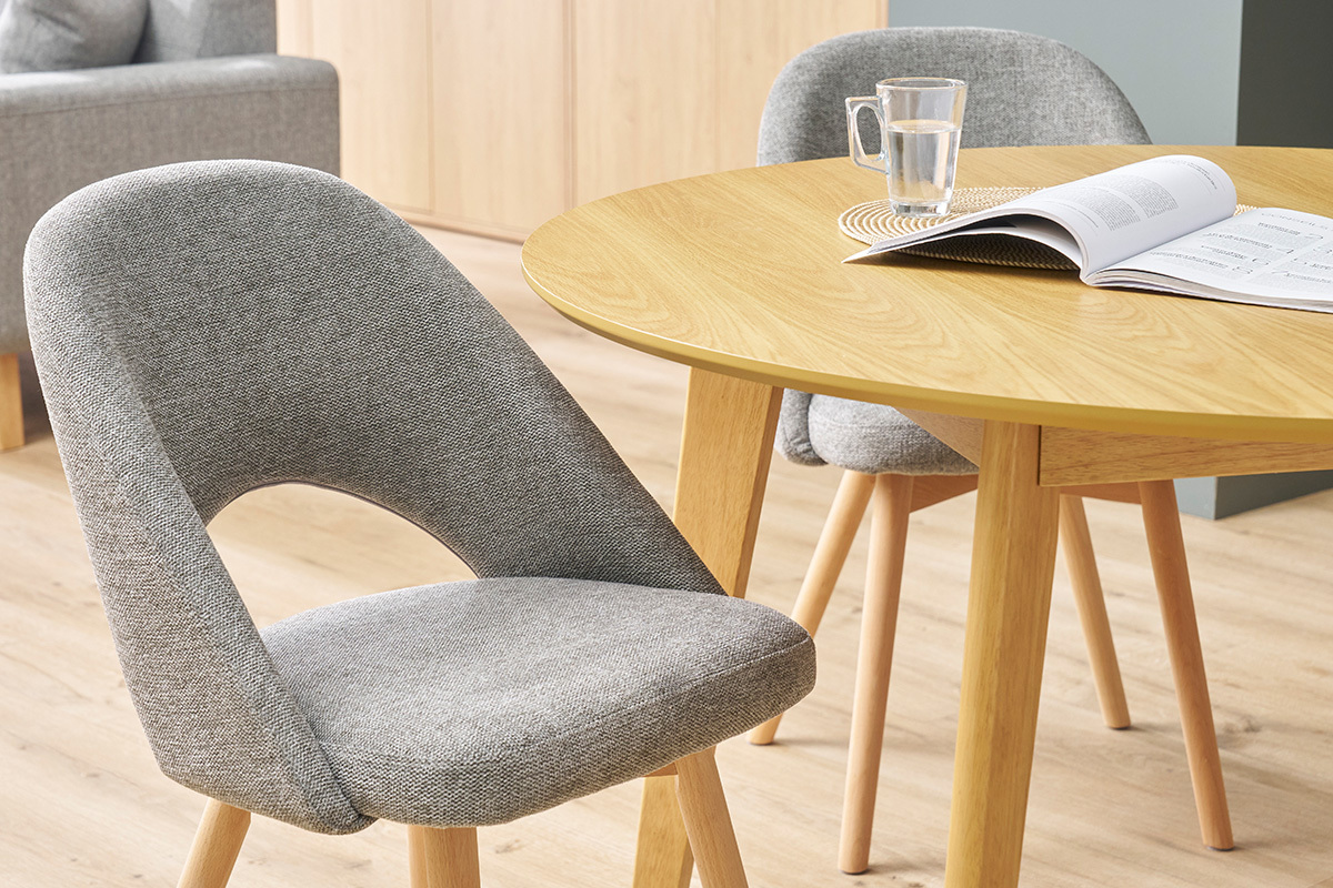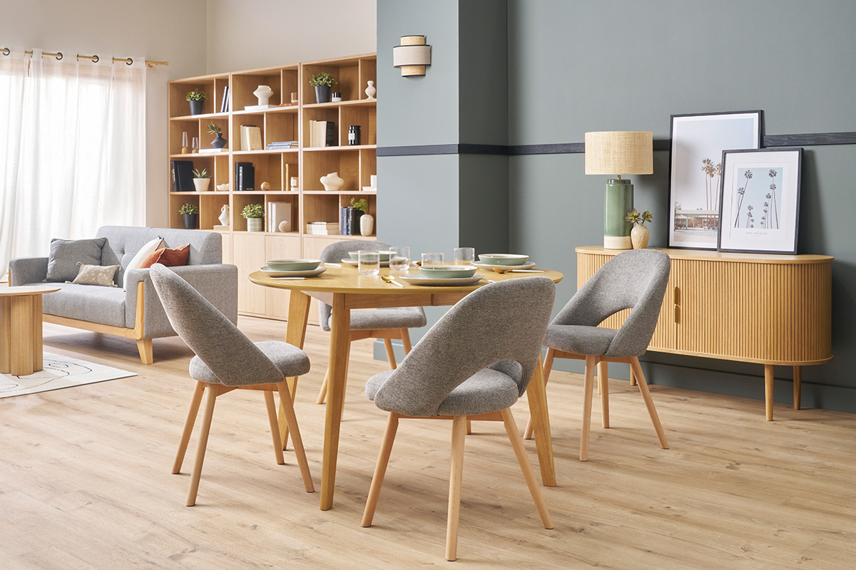 Proposées dans une jolie palette de couleurs, ces chaises en tissu gris se multiplient à l'envi autour de la table à manger.