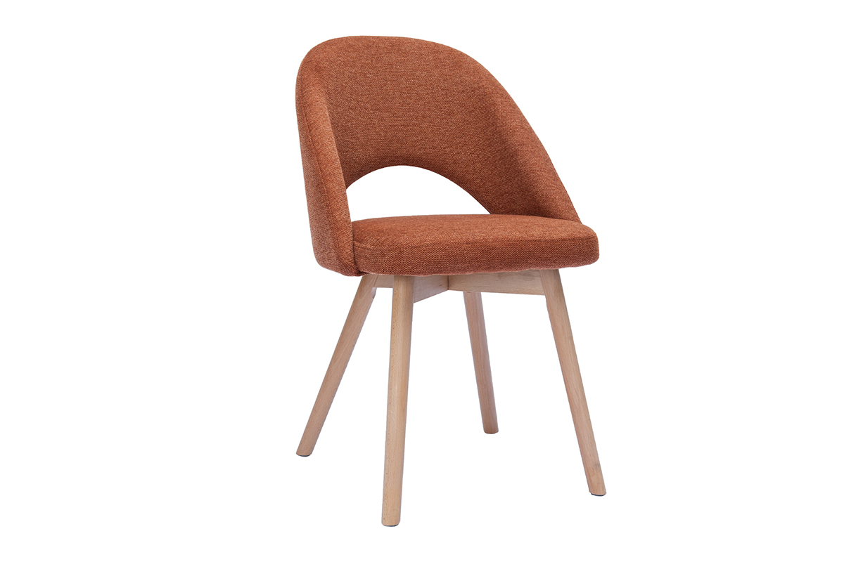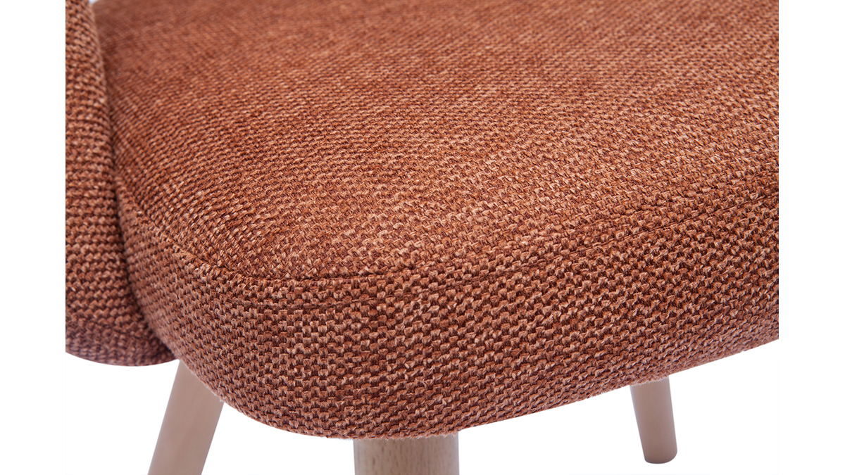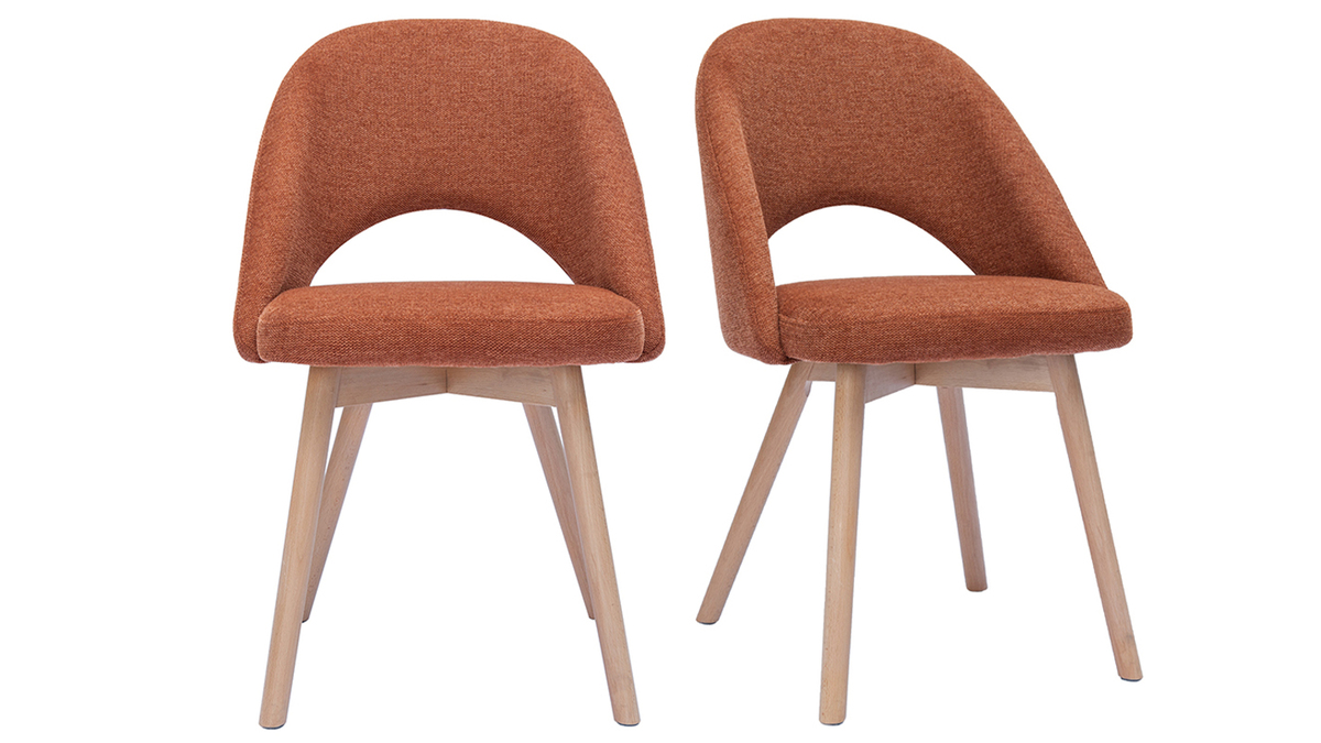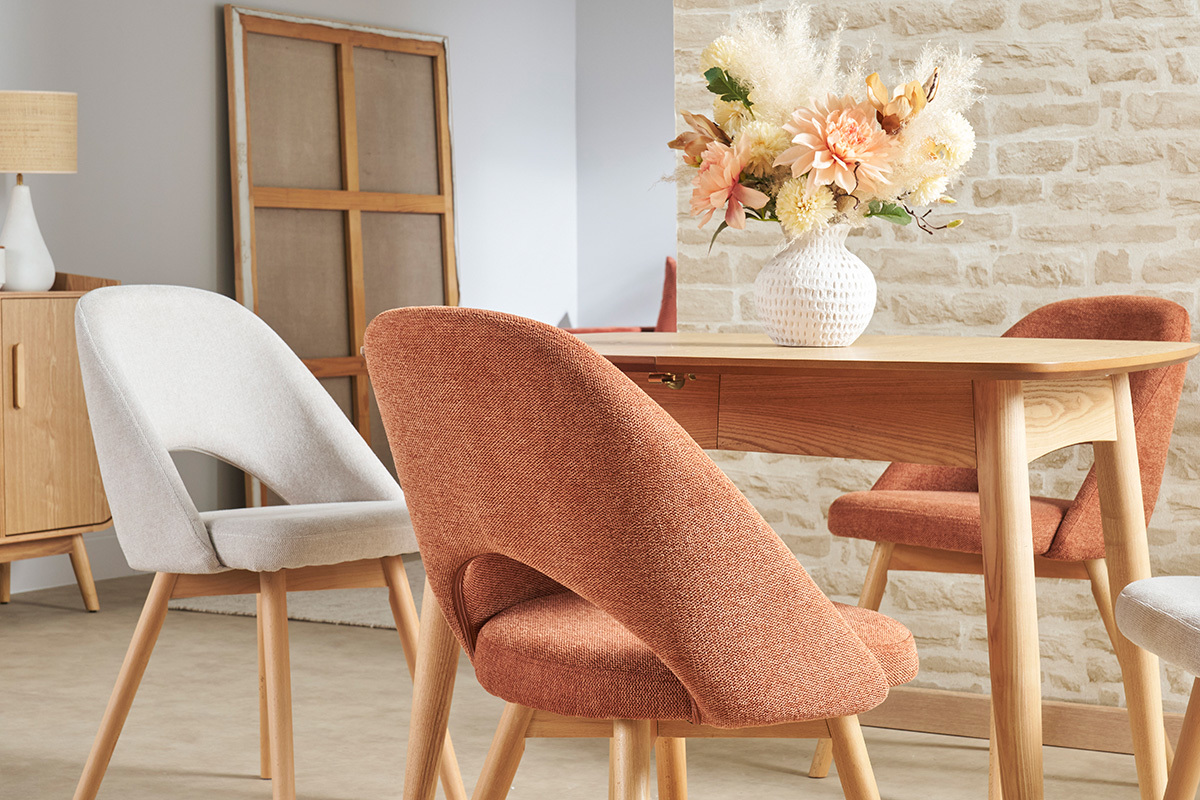 Les chaises COSETTE sont habillées d'un joli tissu effet velours texturé de couleur terre brûlée (100% polyester) qui répond parfaitement au piètement en hêtre massif. Associées à une table à manger en bois clair, ces chaises donneront le ton d'une atmosphère douce et chaleureuse.