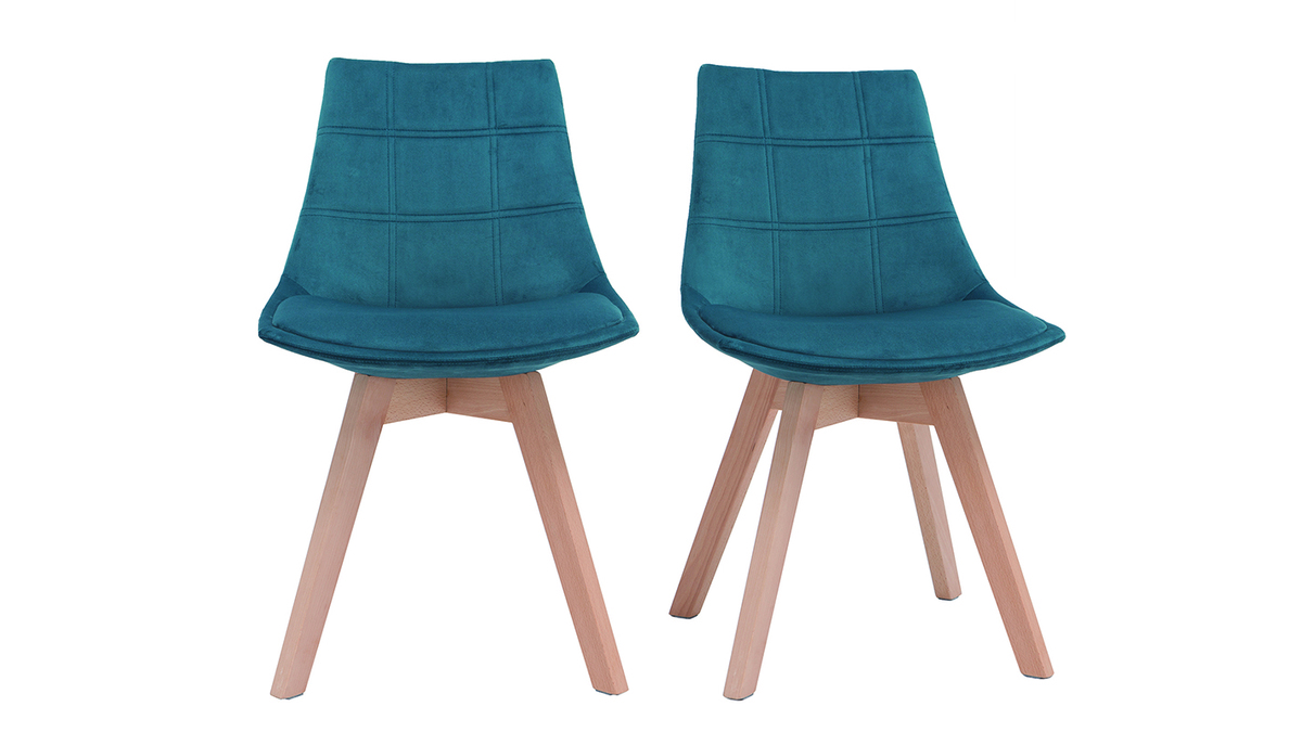 Si le piètement en hêtre massif assure stabilité et robustesse, le revêtement en tissu effet velours bleu pétrole (100% polyester) séduit quant à lui par son toucher réconfortant et très agréable. Rembourrées d'une agréable mousse densité 24 kg/m³, ces chaises de salle à manger seront parfaites pour profiter d'un excellent repas, confortablement installé !