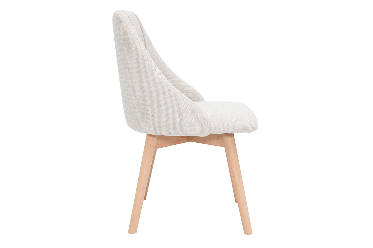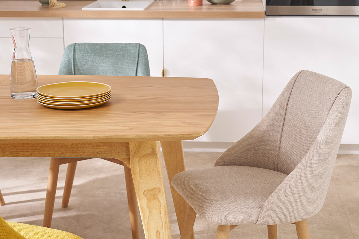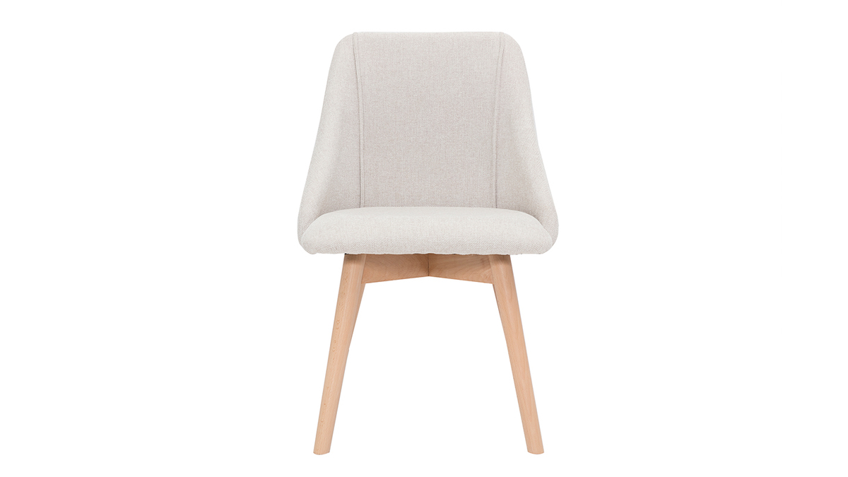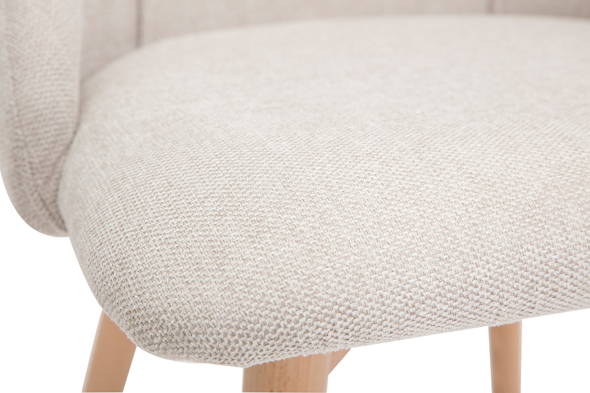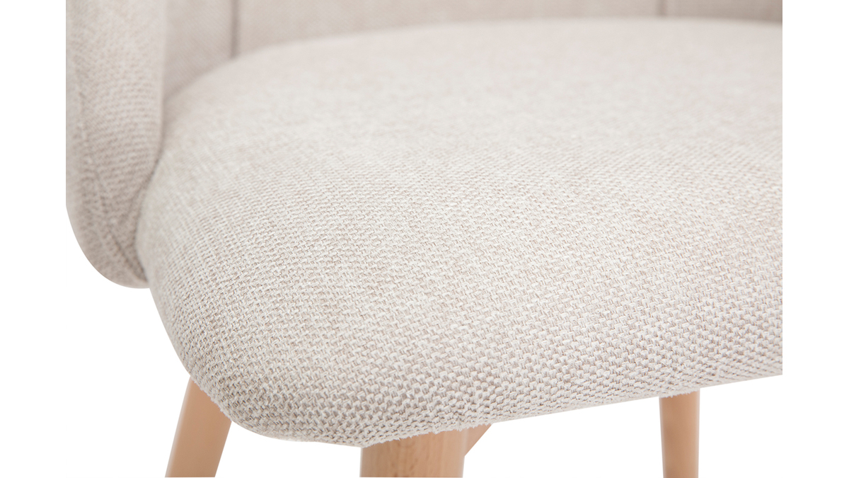 La trame du tissu effet velours texturé beige s'accorde parfaitement avec le piètement en hêtre massif.