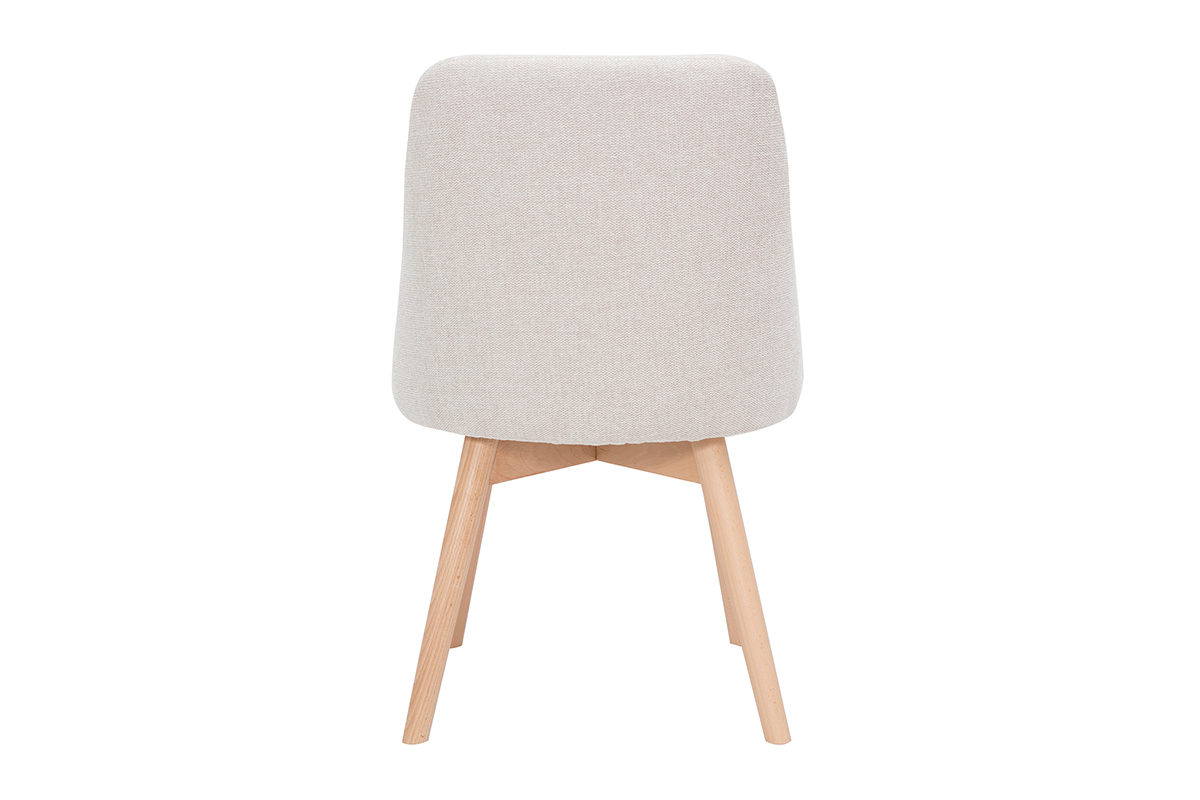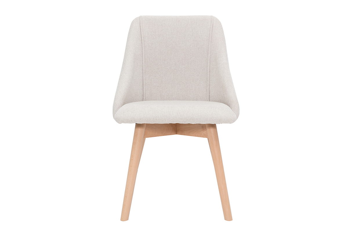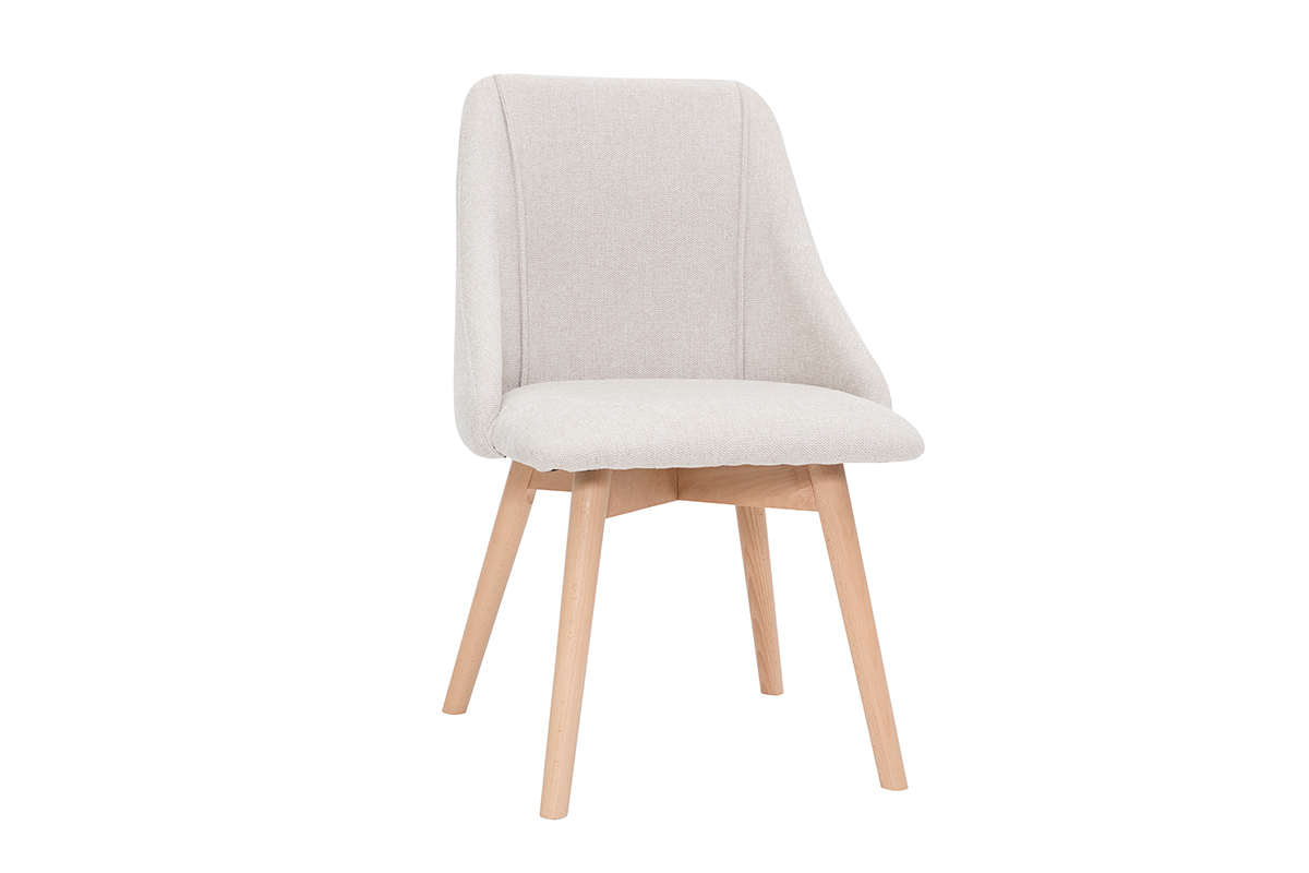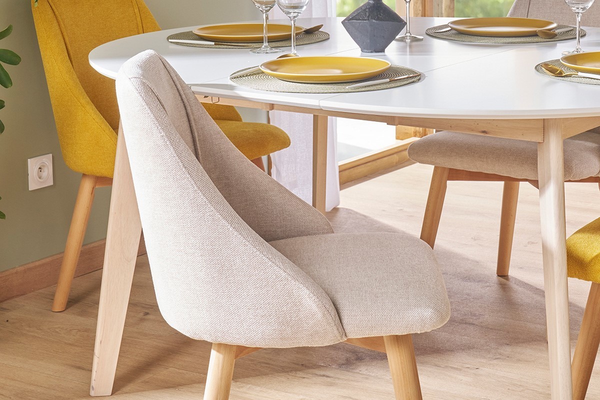 La trame du tissu effet velours texturé beige s'accorde parfaitement avec le piètement en hêtre massif.