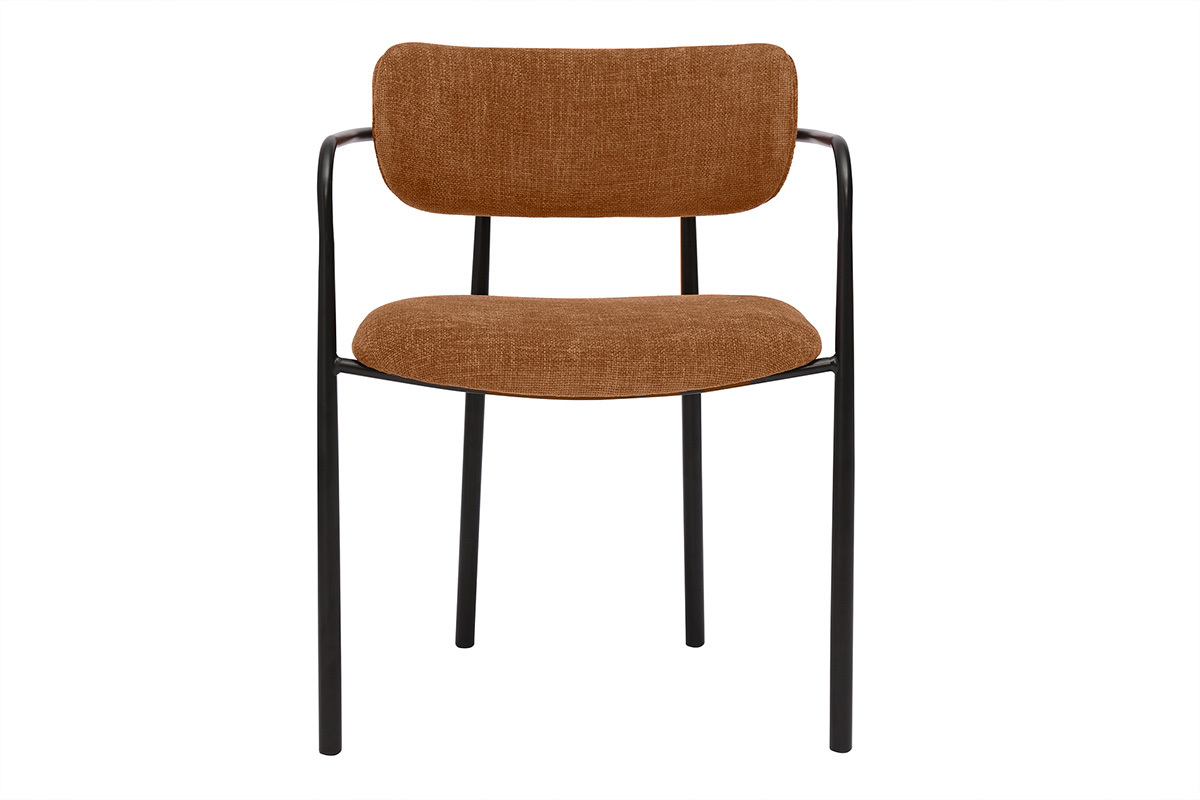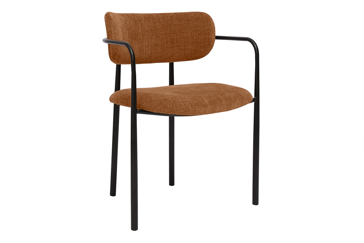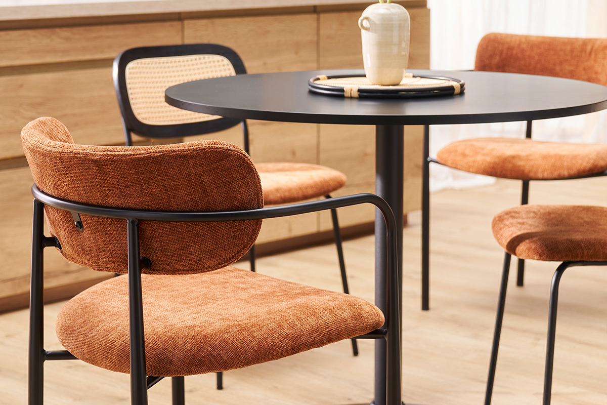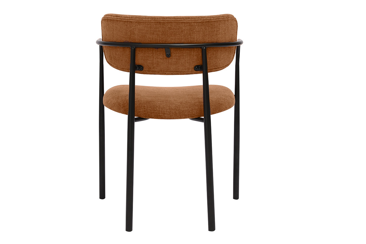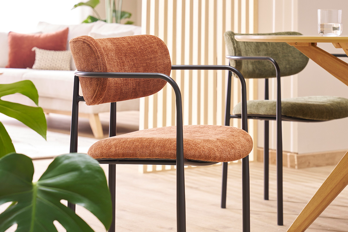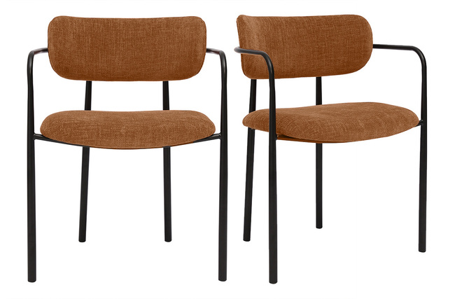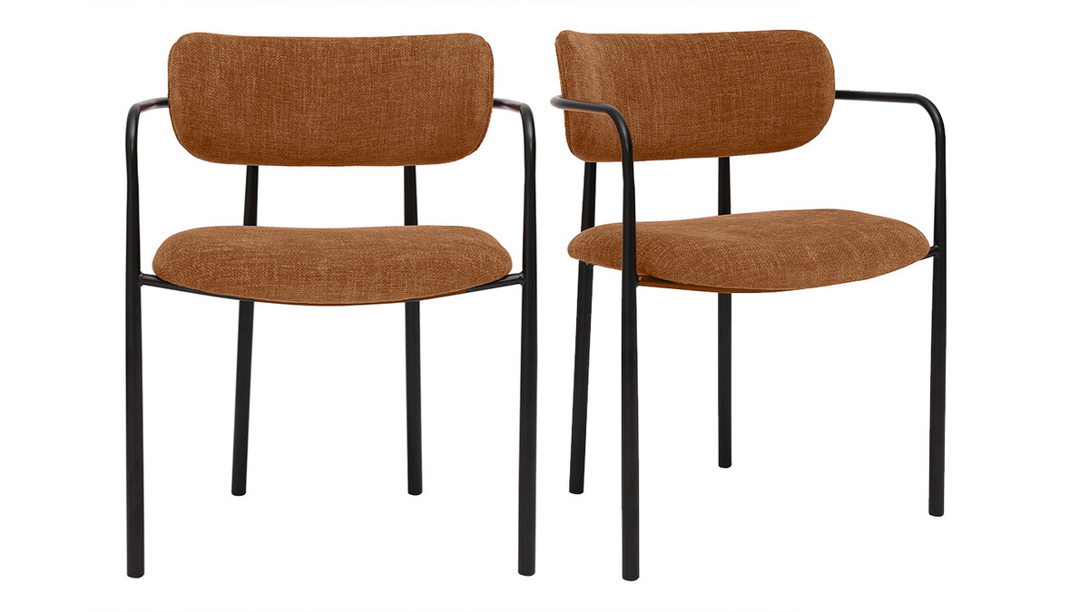 Ces assises se distinguent par leur silhouette épurée et leurs lignes modernes. Le cadre en métal noir confère une touche industrielle, tandis que l’assise et le dossier recouverts de tissu effet velours texturé ajoutent une sensation de luxe et de douceur. La teinte terre brûlée, chaleureuse et actuelle, s’intègre harmonieusement dans une grande variété de styles d’intérieur, du contemporain au vintage, en passant par le bohème ou le scandinave.
