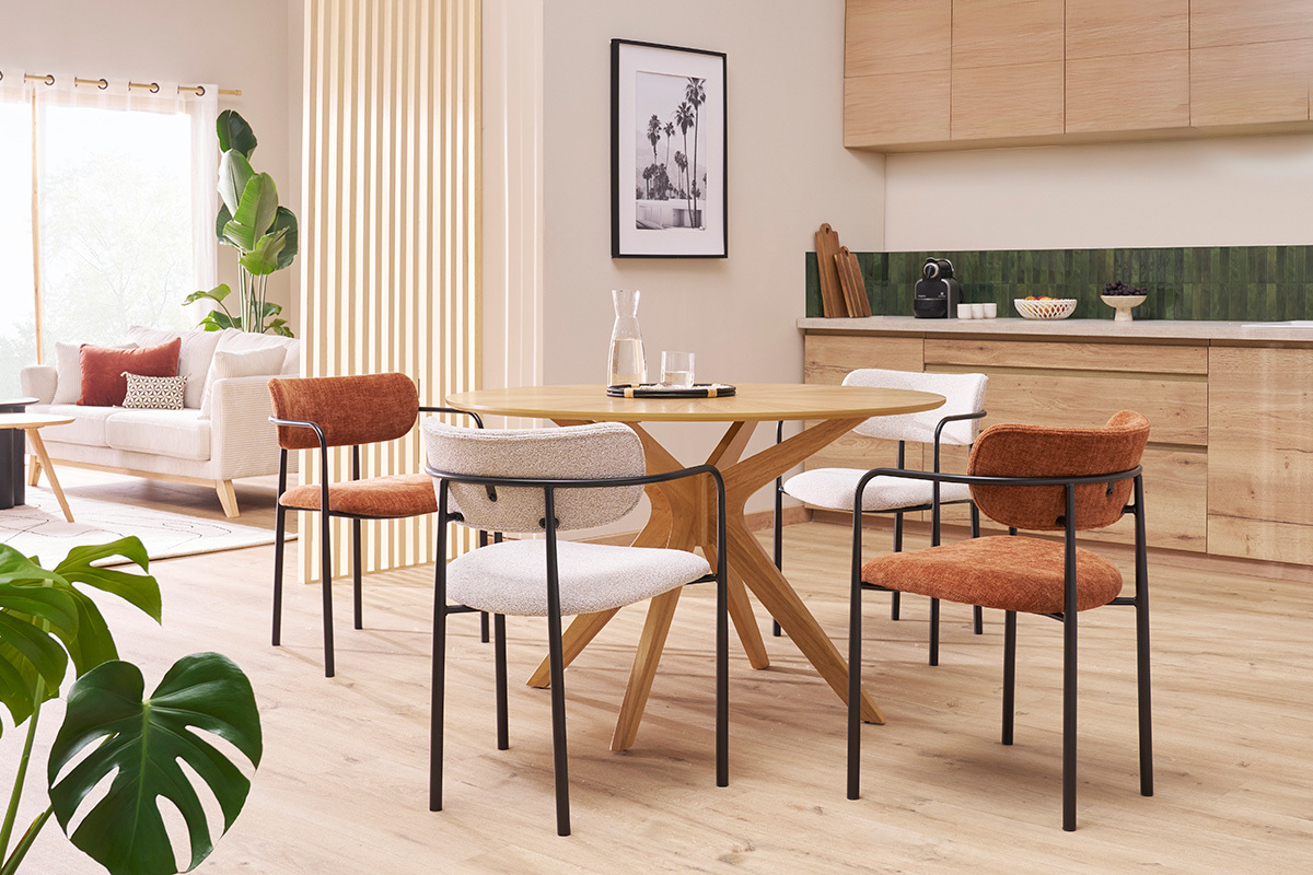 Grâce à leur revêtement et à leur teinte terre brûlée, ces chaises apportent une note chaleureuse et élégante à n’importe quel espace. Elles constituent un véritable point focal tout en s’harmonisant avec une large palette de couleurs et de matériaux, tels que le bois clair, le métal noir ou les tons neutres.