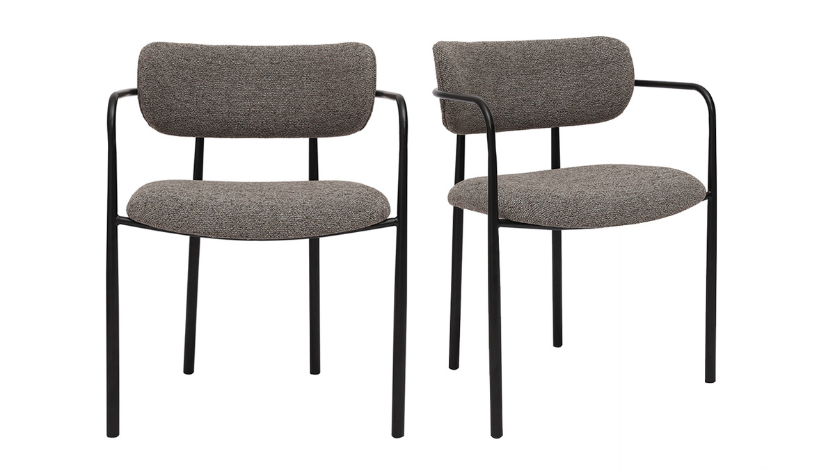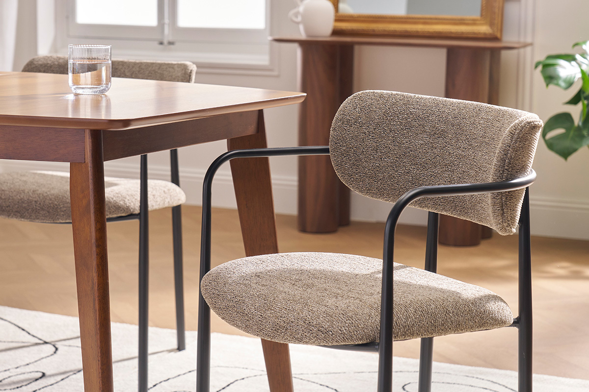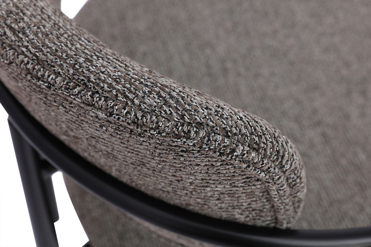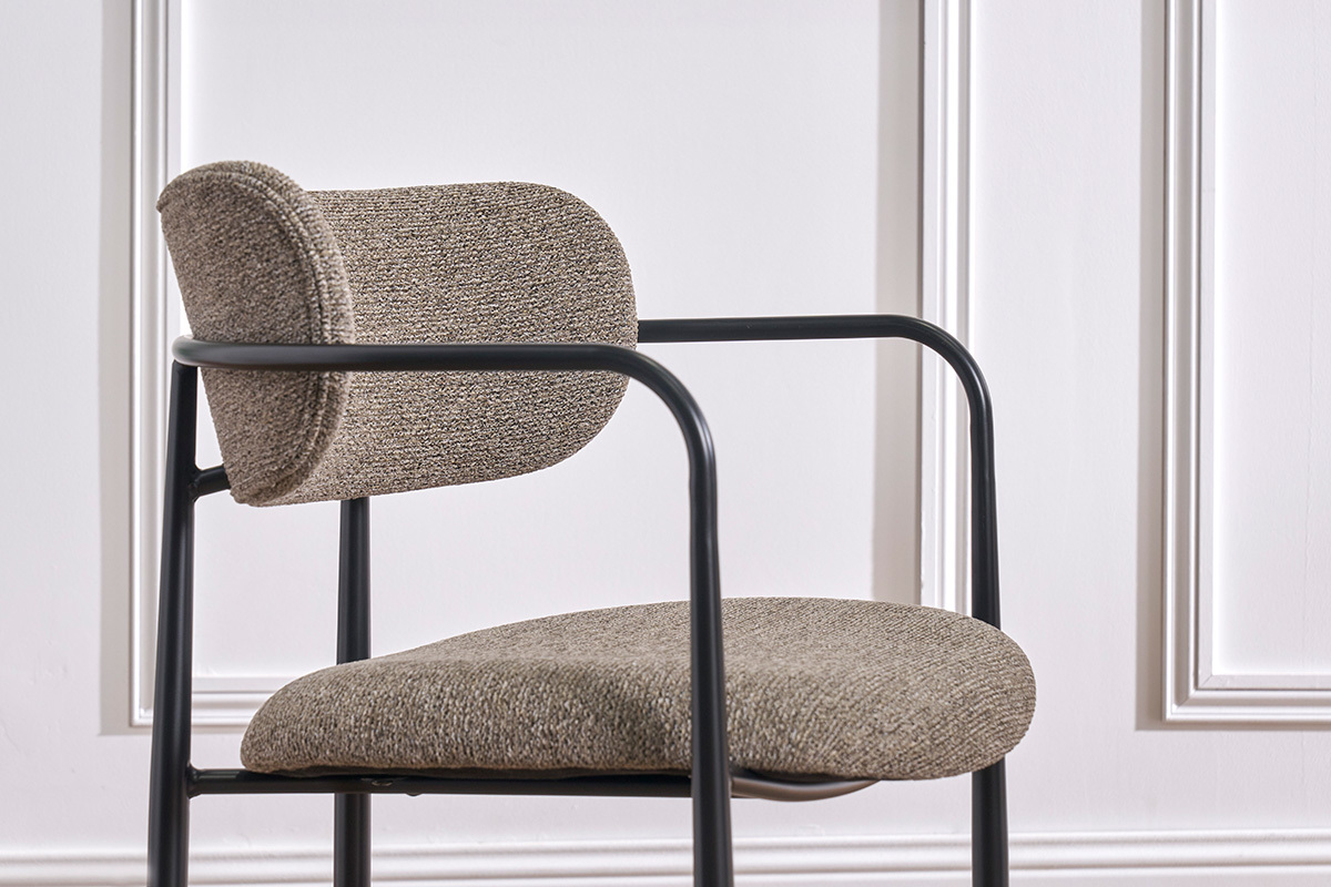 Ces assises se distinguent par leur silhouette épurée et leurs lignes modernes. Le cadre en métal noir confère une touche industrielle, tandis que l’assise et le dossier recouverts de tissu effet velours texturé ajoutent une sensation de luxe et de douceur. La teinte taupe, chaleureuse et actuelle, s’intègre harmonieusement dans une grande variété de styles d’intérieur, du contemporain au vintage, en passant par le bohème ou le scandinave.