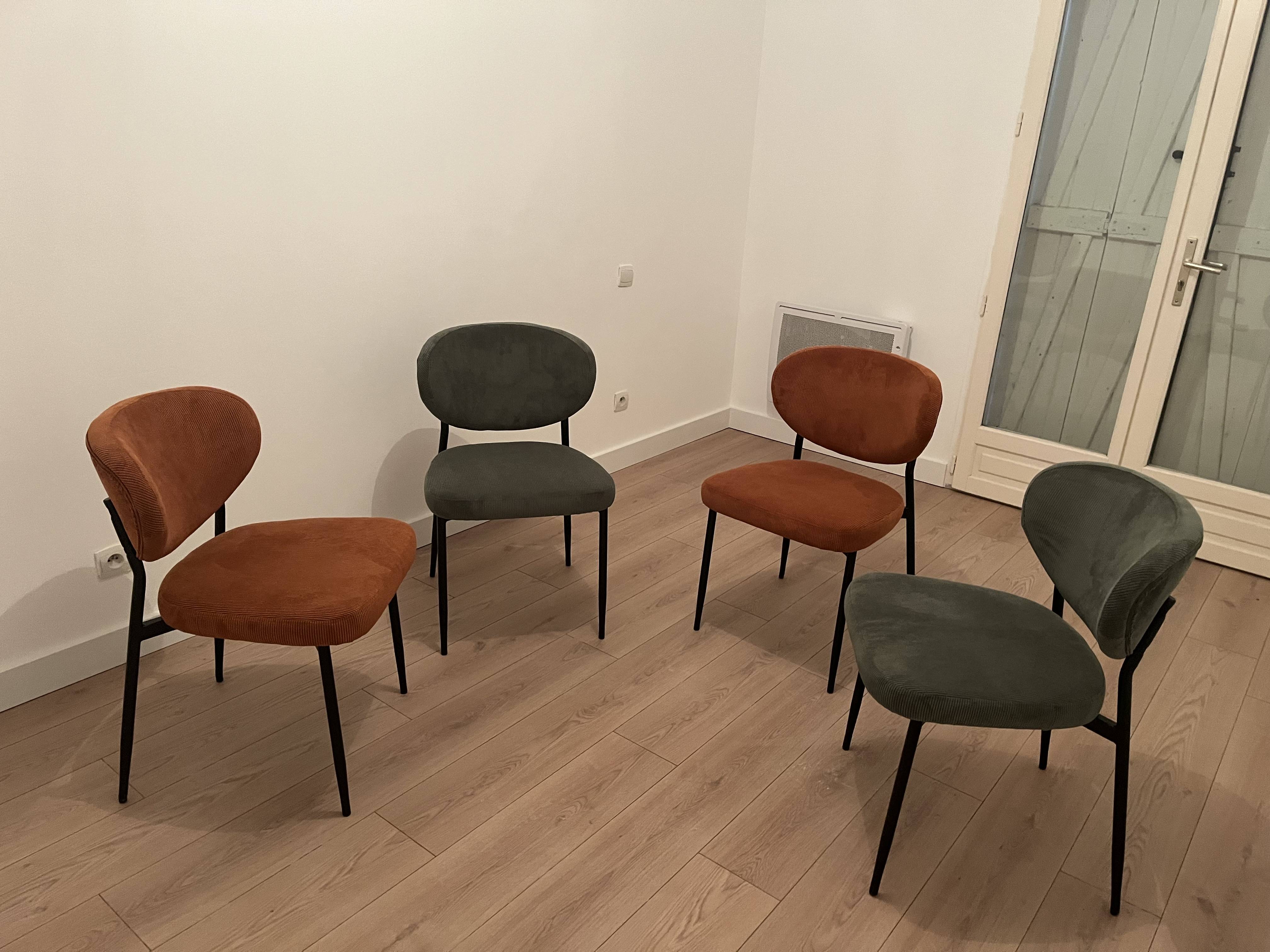 Chaises couleur terre brûlée vendues par lot de 2. Livrées prêtes à monter, montage simple, seul le piètement est à fixer.