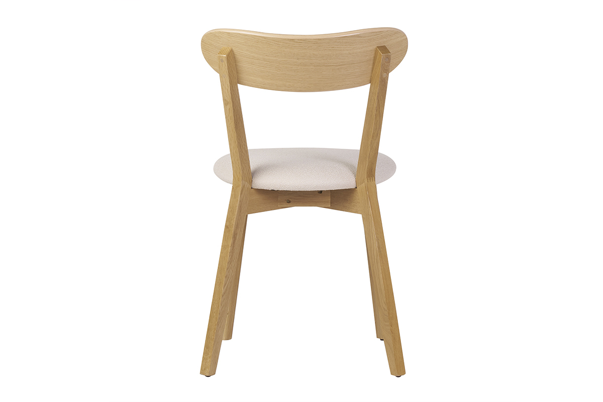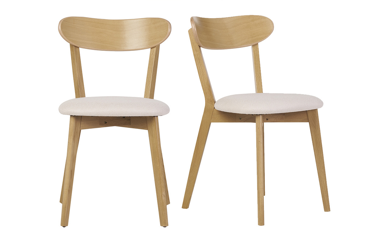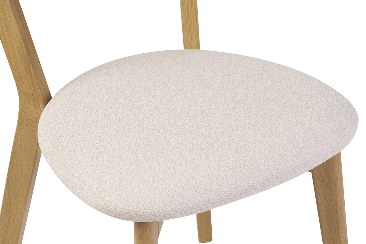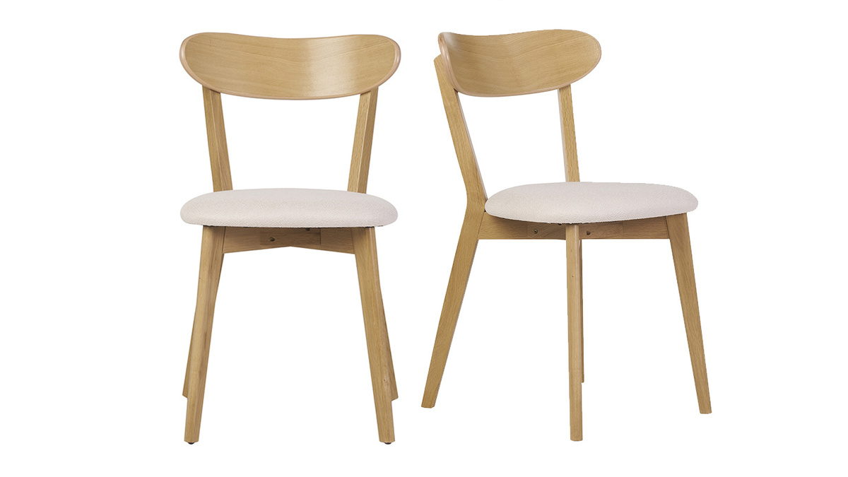 Fabriquées en contreplaqué chêne, ces petites chaises aux dimensions L44 x P56 x H82 cm sont à la fois légères et robustes. Elles se déplacent en un clin d'oeil selon nos besoins et se nettoient très facilement à l'aide d'un chiffon doux légèrement humide. Leur dossier courbé et leur assise rembourrée (densité de la mousse 35 Kg/m3) garantissent un excellent confort pour un usage quotidien. L'assise est habillée d'un revêtement en tissu effet laine bouclée blanc (100% polyester) qui contraste à merveille avec le bois clair. Le vernis transparent apposé sur le chêne plaqué nourrit et protège le bois.