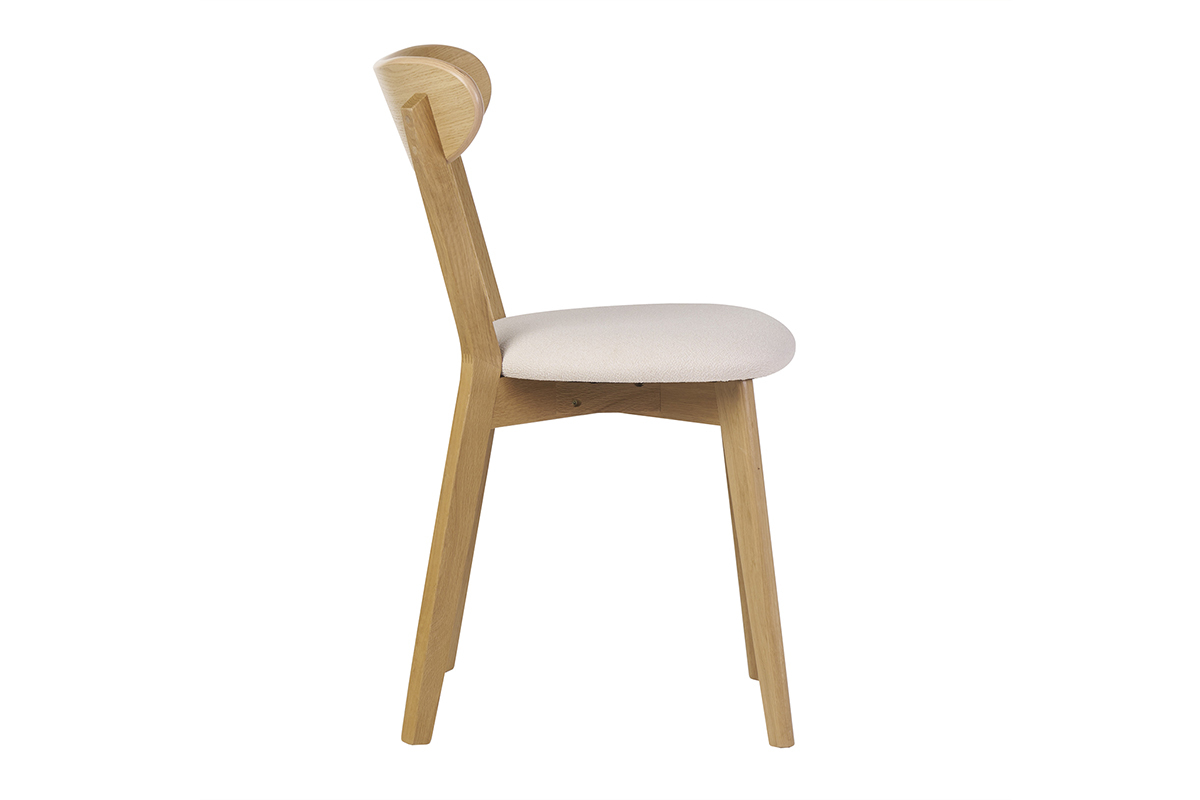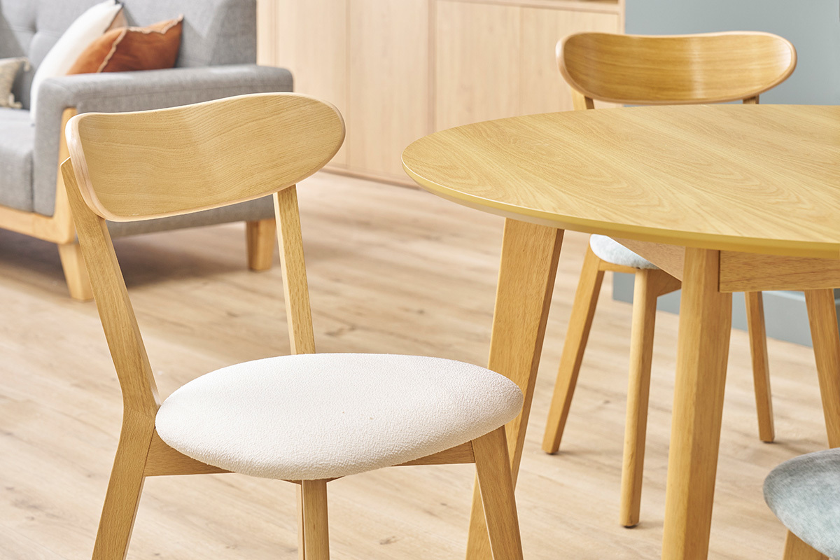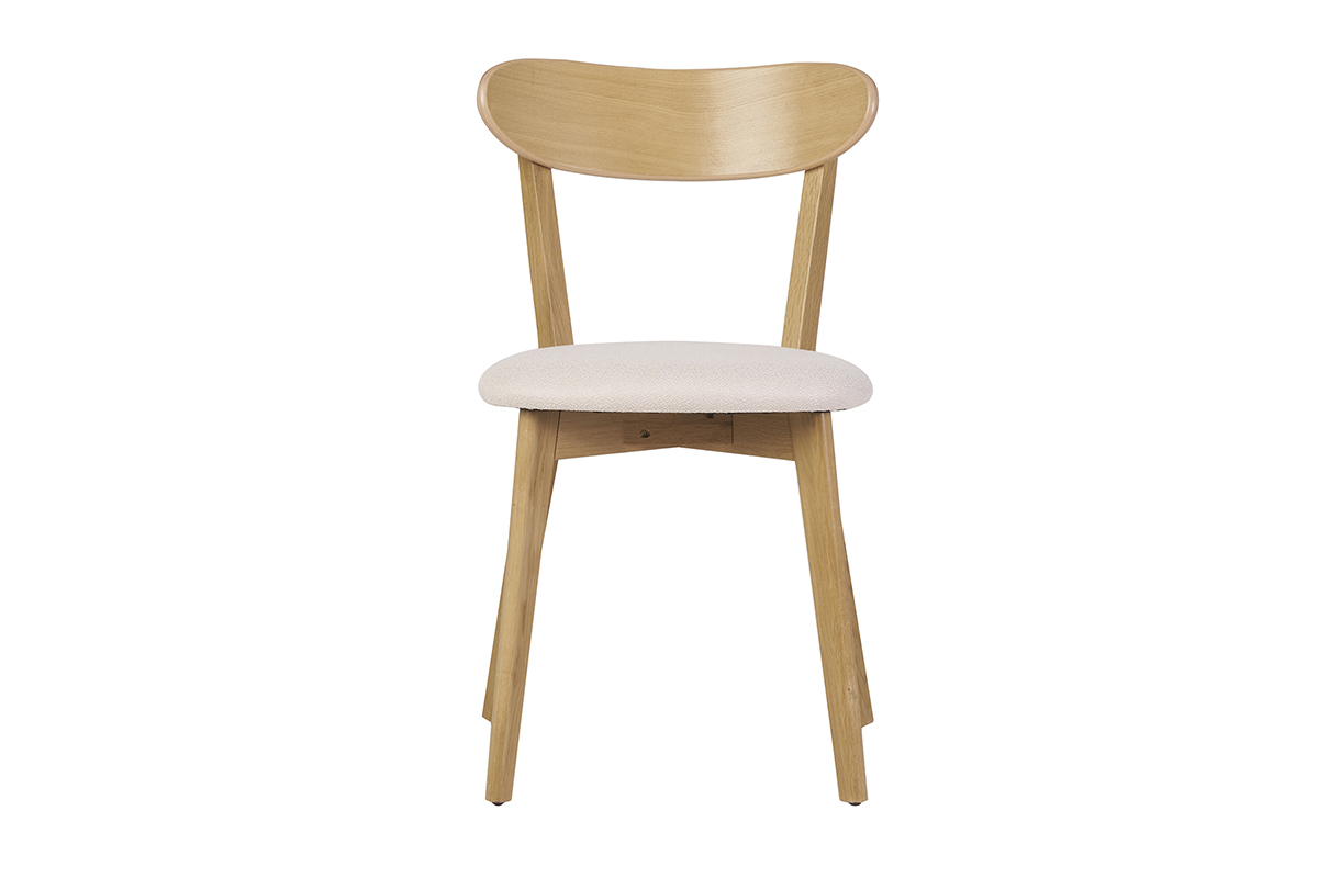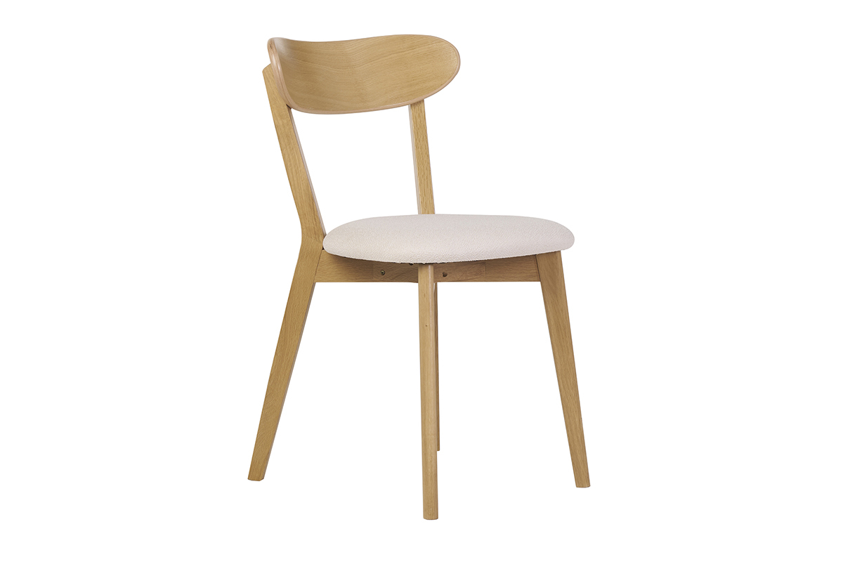 Fabriquées en contreplaqué chêne, ces petites chaises aux dimensions L44 x P56 x H82 cm sont à la fois légères et robustes. Elles se déplacent en un clin d'oeil selon nos besoins et se nettoient très facilement à l'aide d'un chiffon doux légèrement humide. Leur dossier courbé et leur assise rembourrée (densité de la mousse 35 Kg/m3) garantissent un excellent confort pour un usage quotidien. L'assise est habillée d'un revêtement en tissu effet laine bouclée blanc (100% polyester) qui contraste à merveille avec le bois clair. Le vernis transparent apposé sur le chêne plaqué nourrit et protège le bois.