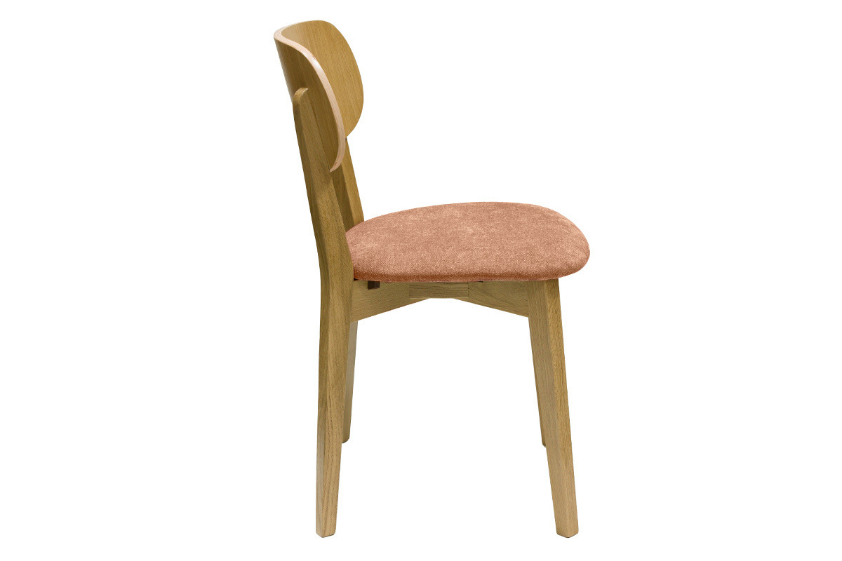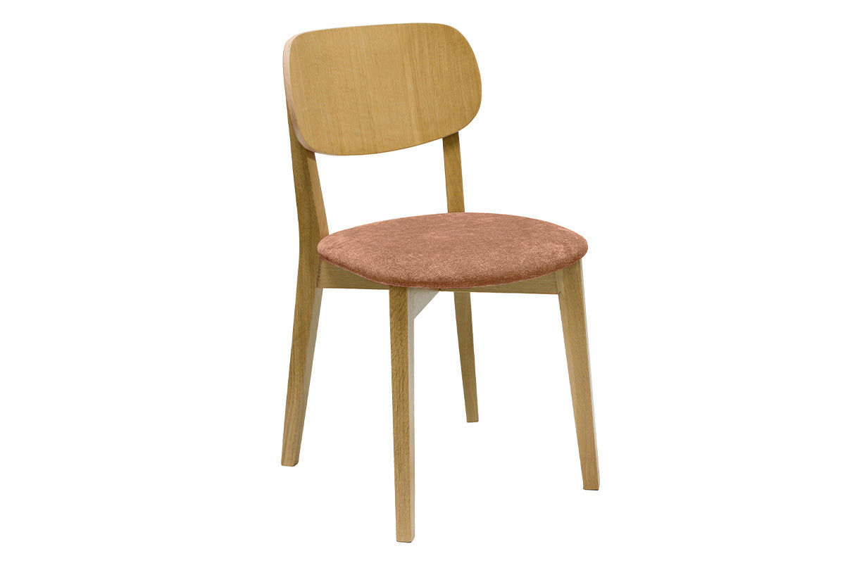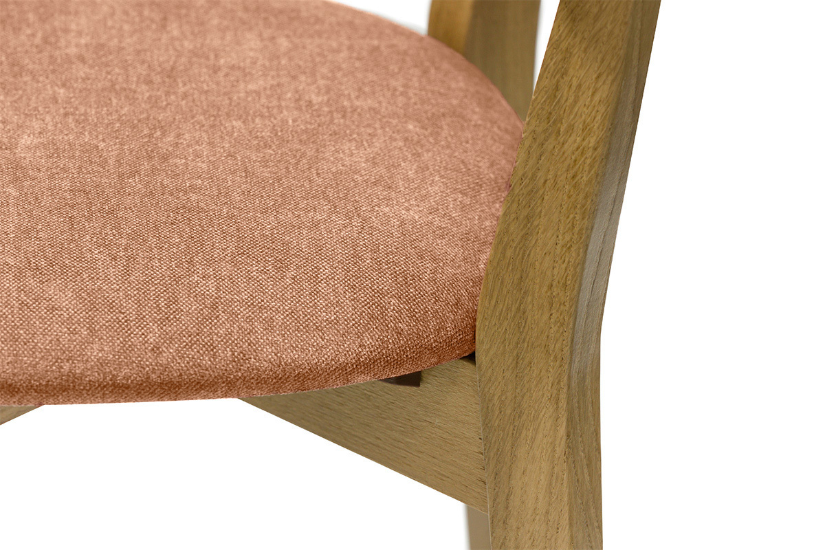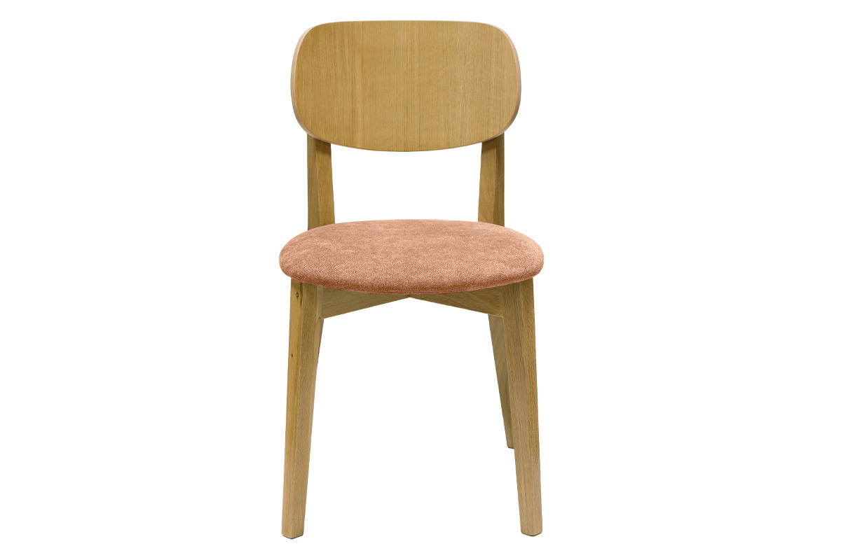 Les chaises LUCIA s'inscrivent dans la lignée du design scandinave des années 50. Loin des effets de mode, ces chaises en bois clair s'intègrent dans de nombreux styles d'intérieurs. Le dossier contreplaqué chêne courbé et l'assise rembourrée (densité de la mousse 35 Kg/m³) offrent un excellent confort. Le joli revêtement en tissu effet velours terracotta (100% polyester) qui habille l'assise s'accorde à merveille avec la structure en bois et le piètement en chêne massif.