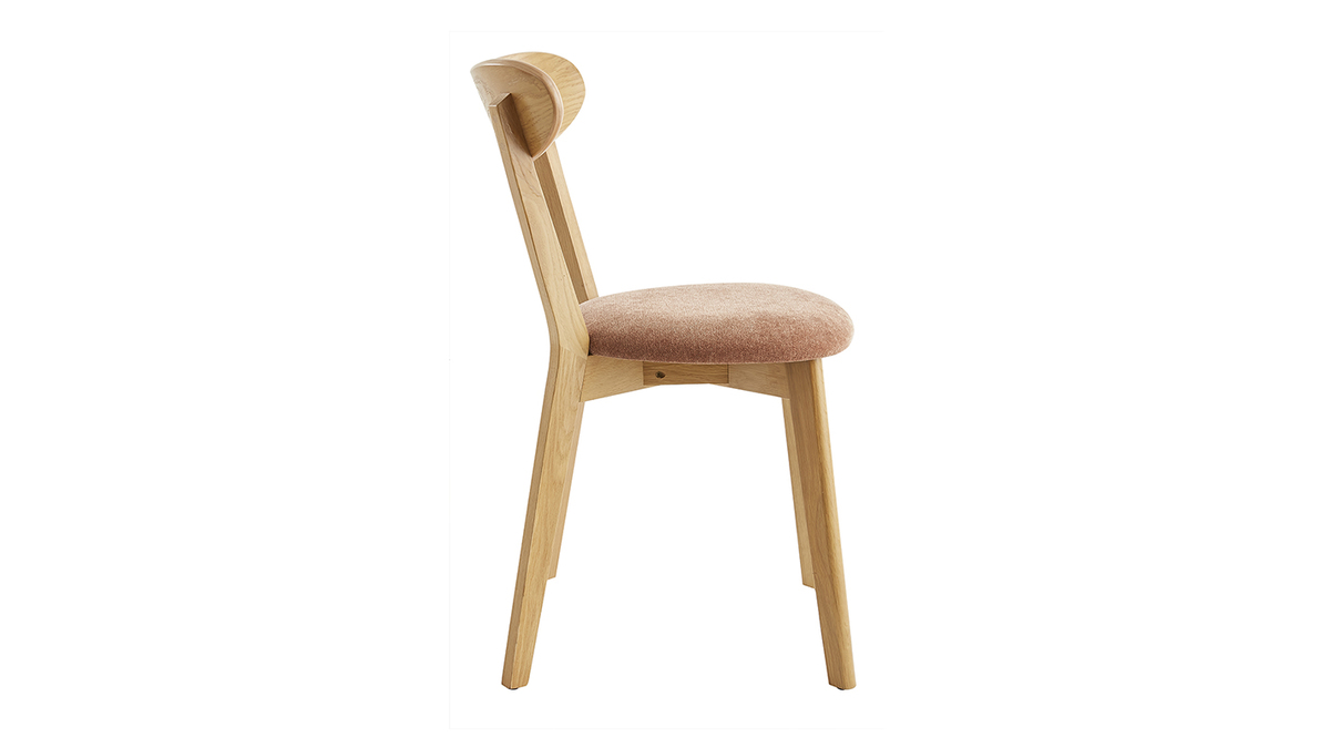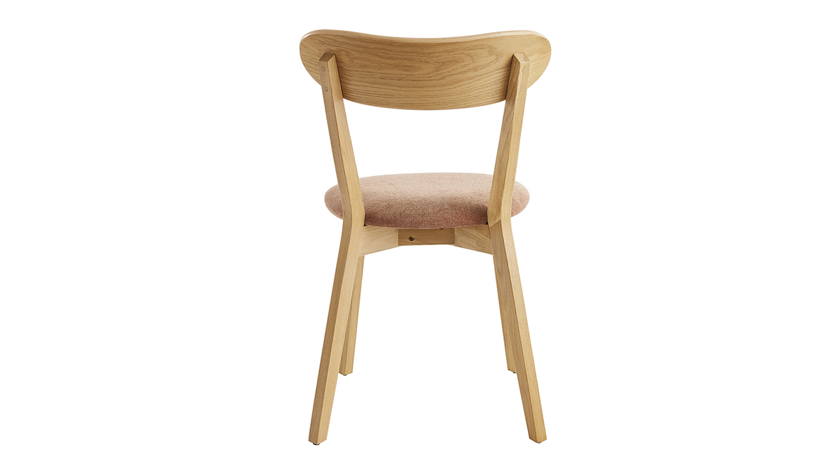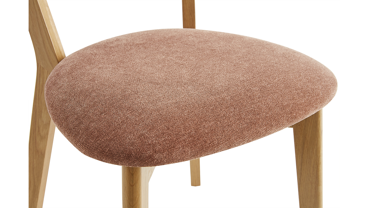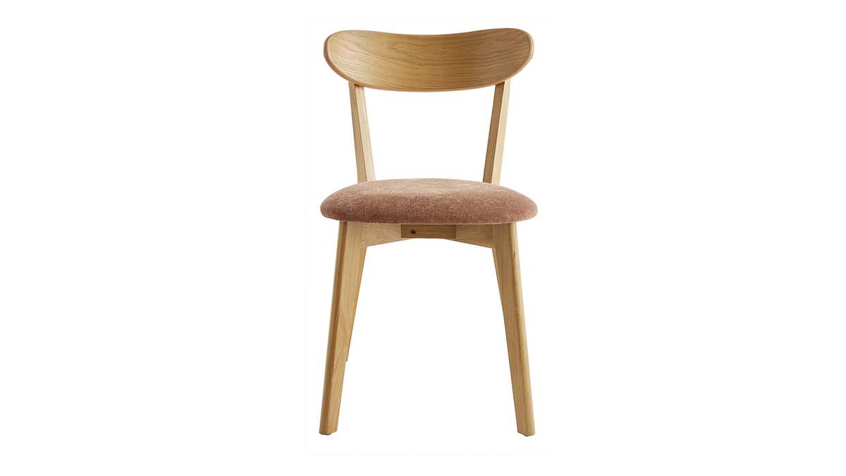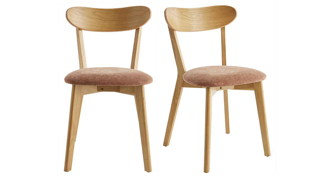 Fabriquées en contreplaqué chêne, ces petites chaises aux dimensions L44 x P56 x H82 cm sont à la fois légères et robustes. Elles se déplacent en un clin d'oeil selon nos besoins et se nettoient très facilement à l'aide d'un chiffon doux légèrement humide. Leur dossier courbé et leur assise rembourrée (densité de la mousse 35 Kg/m3) garantissent un exellent confort pour un usage quotidien. L'assise est habillée d'un revêtement en tissu effet velours terre brûlée (100% polyester) qui contraste à merveille avec le bois clair. Le vernis transparent apposé sur le chêne plaqué nourrit et protège le bois.