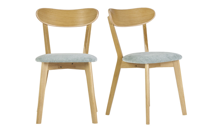 Fabriquées en contreplaqué chêne, ces petites chaises aux dimensions L44 x P56 x H82 cm sont à la fois légères et robustes. Elles se déplacent en un clin d'oeil selon nos besoins et se nettoient très facilement à l'aide d'un chiffon doux légèrement humide. Leur dossier courbé et leur assise rembourrée (densité de la mousse 35 Kg/m3) garantissent un exellent confort pour un usage quotidien. L'assise est habillée d'un revêtement tissu effet velours vert céladon (100% polyester) qui contraste à merveille avec le bois clair. Le vernis transparent apposé sur le chêne plaqué nourrit et protège le bois.