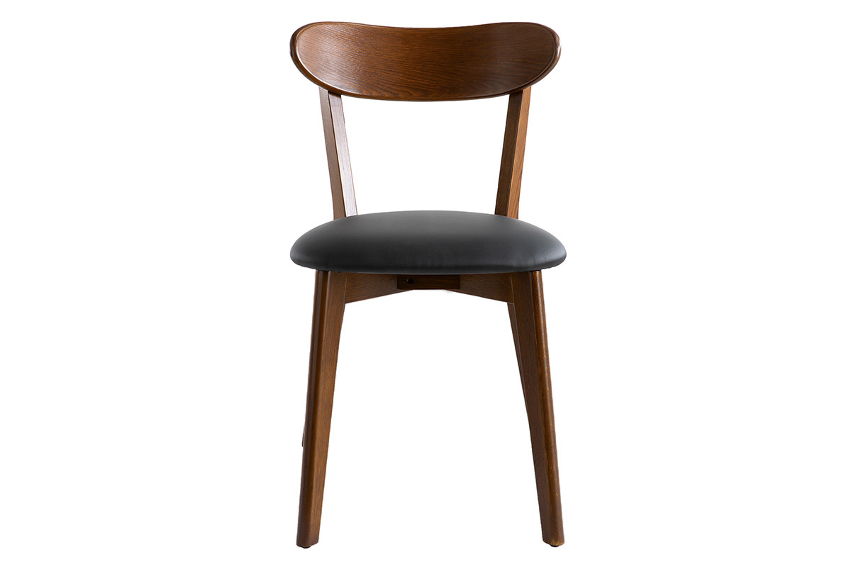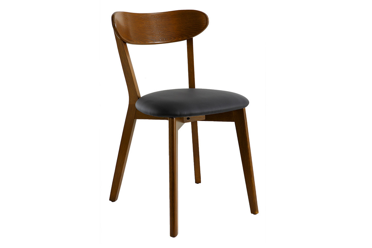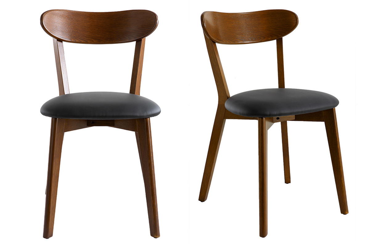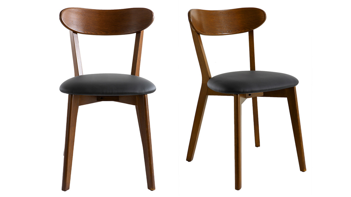 Fabriquées en contreplaqué chêne teinté noyer, ces petites chaises aux dimensions L44 x P56 x H82 cm sont à la fois légères et robustes. Elles se déplacent en un clin d'oeil selon nos besoins et se nettoient très facilement à l'aide d'un chiffon doux légèrement humide. Leur dossier courbé et leur assise rembourrée (densité de la mousse 35 Kg/m3) garantissent un exellent confort pour un usage quotidien. L'assise est habillée d'un revêtement noir (100% polyuréthane) qui se marie à merveille avec le bois foncé. Le vernis transparent apposé sur le chêne plaqué nourrit et protège le bois.