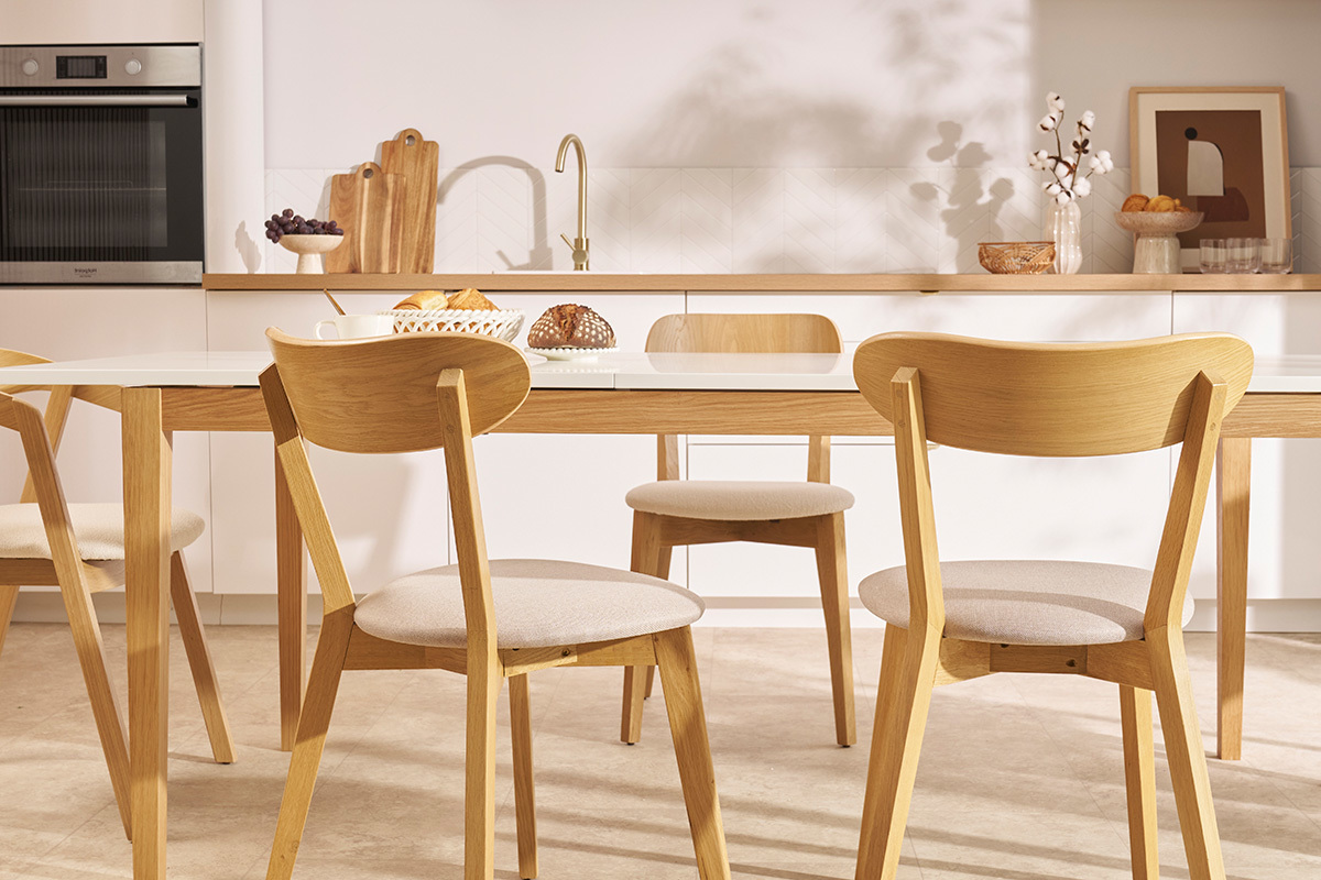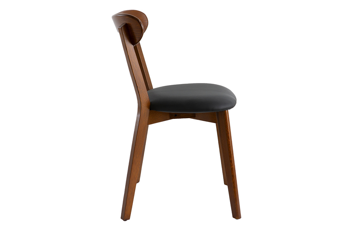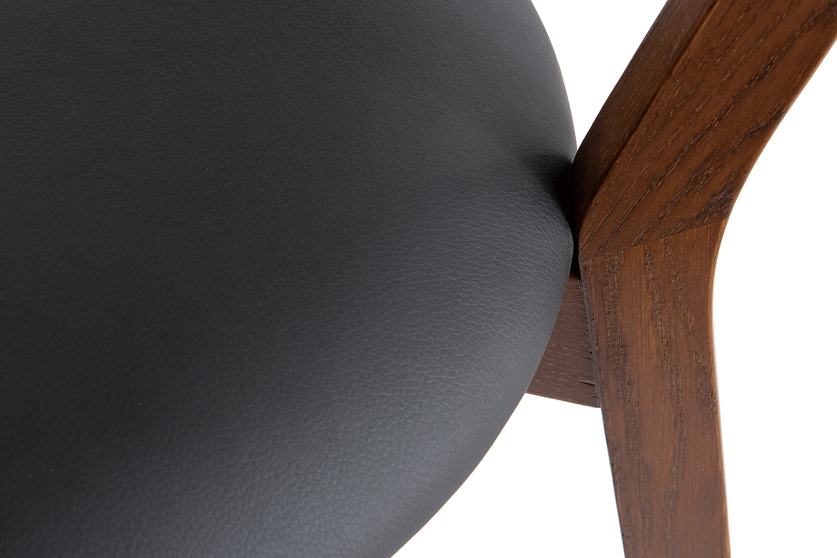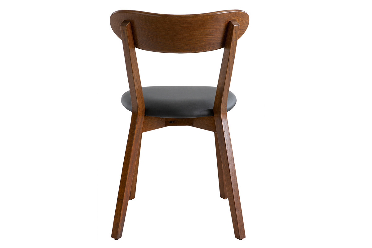 Fabriquées en contreplaqué chêne teinté noyer, ces petites chaises aux dimensions L44 x P56 x H82 cm sont à la fois légères et robustes. Elles se déplacent en un clin d'oeil selon nos besoins et se nettoient très facilement à l'aide d'un chiffon doux légèrement humide. Leur dossier courbé et leur assise rembourrée (densité de la mousse 35 Kg/m3) garantissent un exellent confort pour un usage quotidien. L'assise est habillée d'un revêtement noir (100% polyuréthane) qui se marie à merveille avec le bois foncé. Le vernis transparent apposé sur le chêne plaqué nourrit et protège le bois.