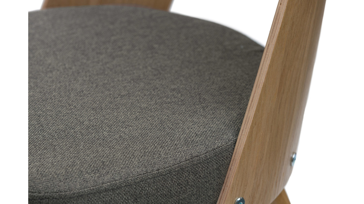 On adore le look fifties de ces chaises légères et robustes. Avec leur design tout en courbes, elles sont le résultat d'un joli travail sur la matière. Le dossier en contreplaqué courbé forme une enveloppe protectrice tandis que l'assise rembourrée (densité de la mousse 35 Kg/m3) garantit un excellent confort pour un usage quotidien. L'assise est habillée d'un joli tissu marron (100% polyester) qui se marie à merveille avec le bois. Sur le chêne plaqué est apposé un vernis transparent qui nourrit et protège le bois.