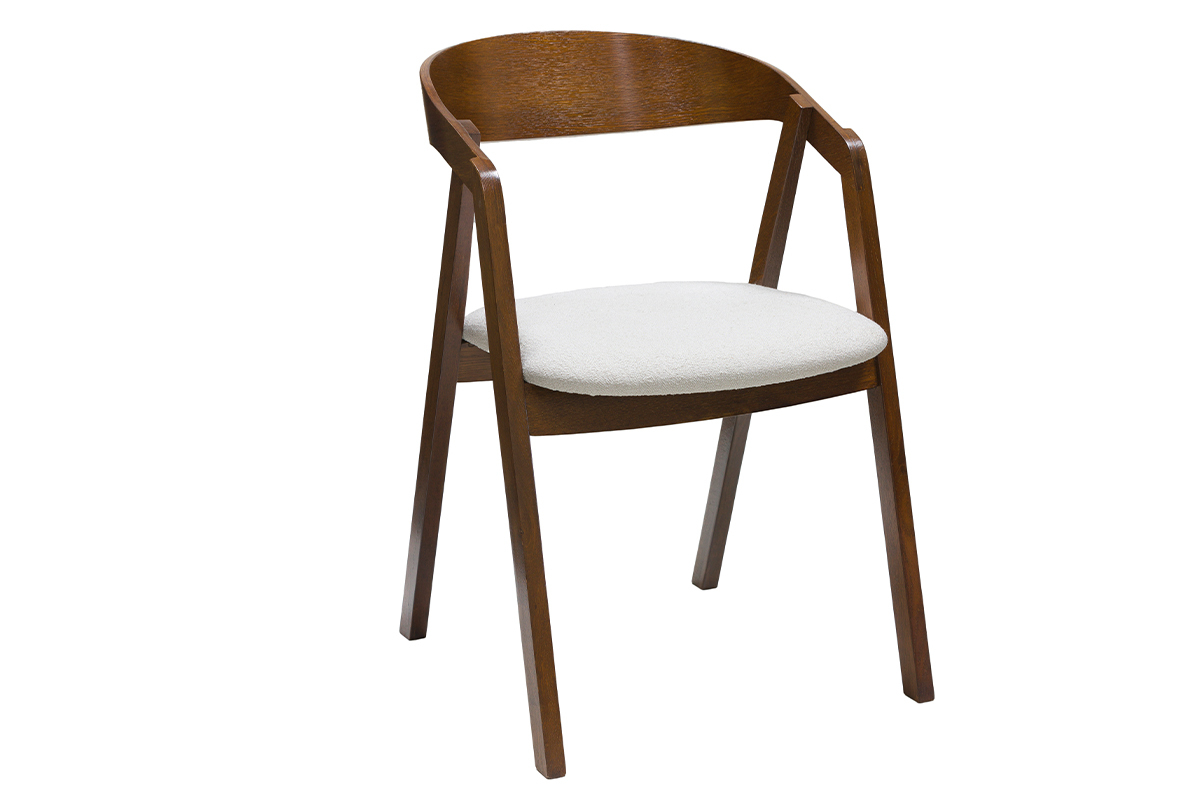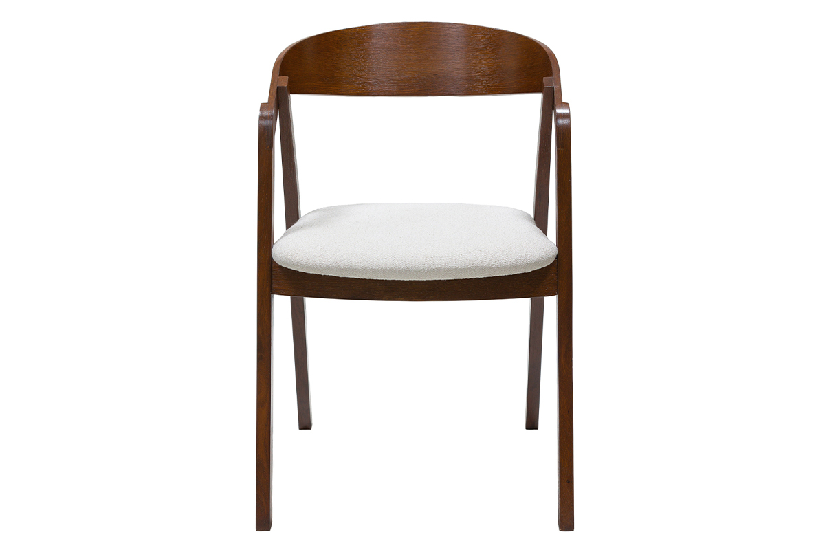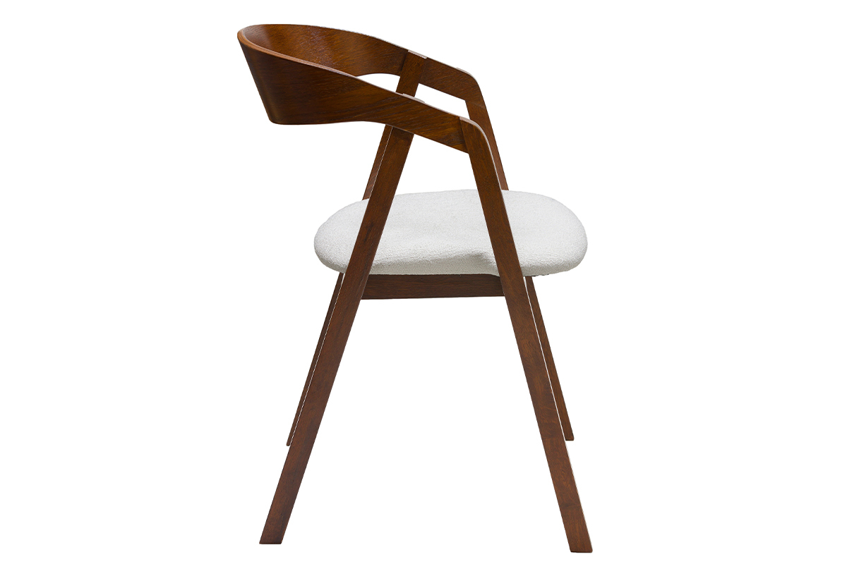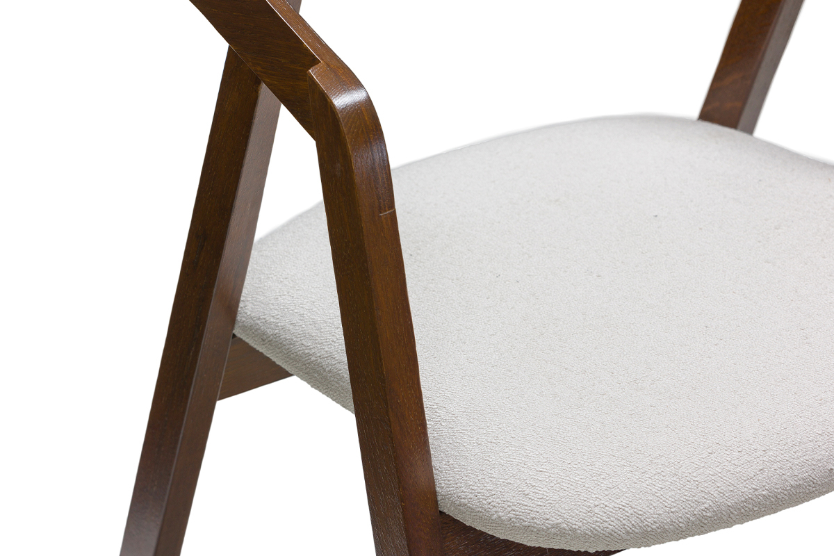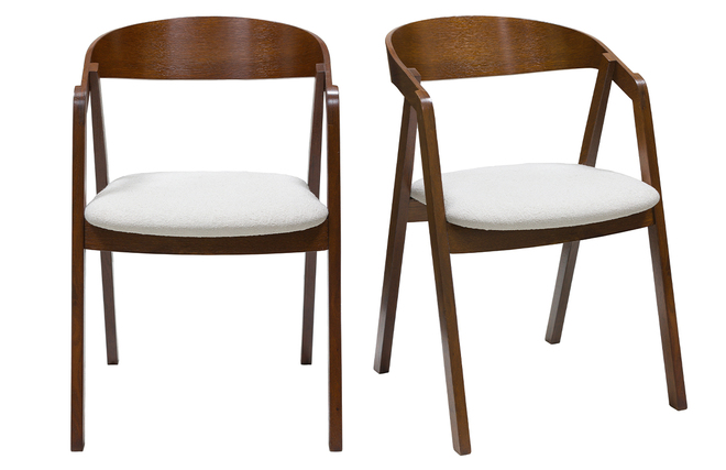 Élégant compromis entre la chaise et le fauteuil, ces chaises en bois avec accoudoirs se composent d'une structure aux volumes épurés en chêne massif teinté noyer (pieds) et contreplaqué chêne (dossier) qui offre une excellente prise en main. Aussi agréable à l'oeil qu'au toucher, l'assise rembourrée de mousse se pare d'un revêtement résistant en tissu effet laine bouclée (100% polyester). Idéal pour épouser le galbe du dos, le dossier courbé résolument enveloppant unis ses courbes aux lignes franches de quatre pieds. Travaillés avec originalité, ces derniers offrent une grande stabilité à l'ensemble.