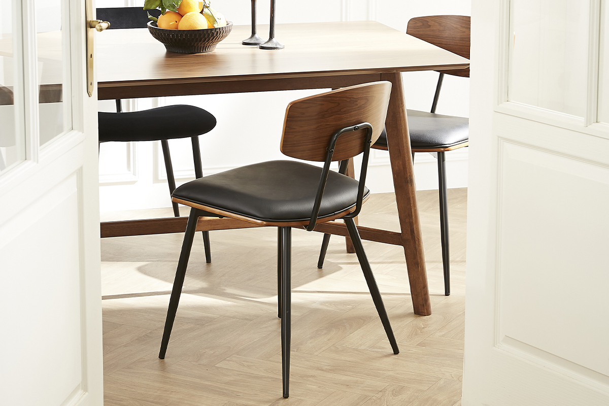 Les pieds en métal noir sont non seulement esthétiques, mais également très résistants. Ils assurent une excellente stabilité et confèrent à ces chaises une durabilité à toute épreuve. Par ailleurs, la finition soignée du bois de noyer garantit une longévité optimale, tout en facilitant leur intégration dans votre espace de vie. Ces chaises ont été conçues pour résister aux usages quotidiens tout en conservant leur aspect neuf au fil du temps.