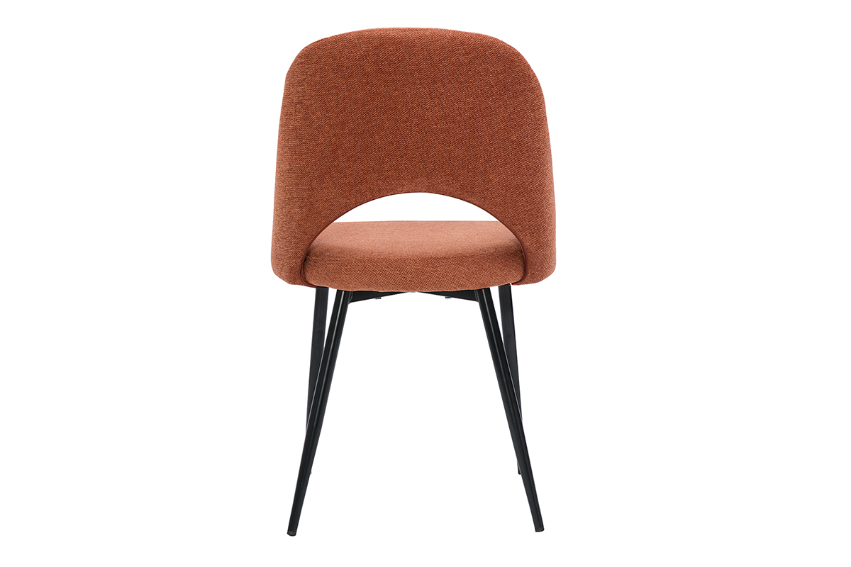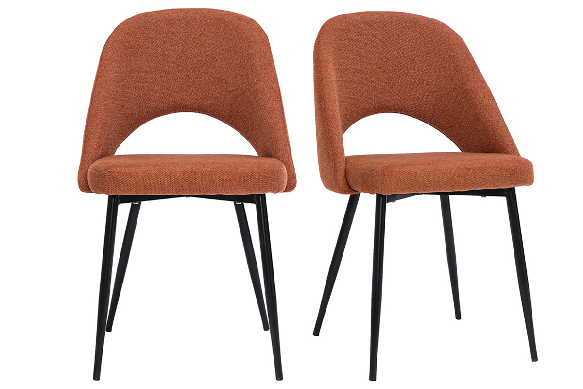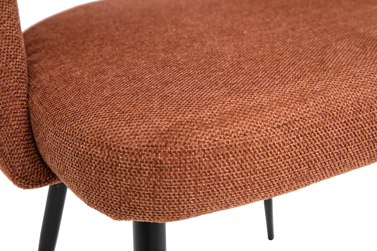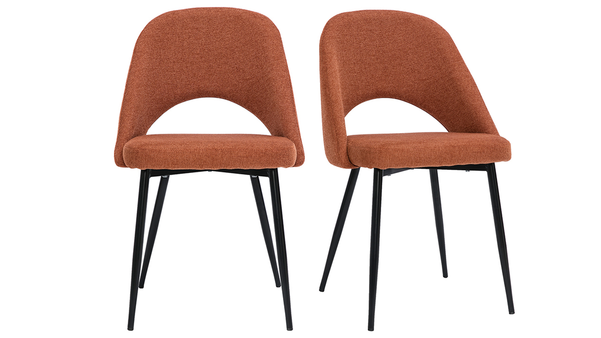 Ces assises au charme subtilement rétro sont synonymes de convivialité et de partage. Leur tissu effet velours texturé (100% polyester) se décline dans un coloris terre brûlée, rappel de la couleur terracotta, une teinte chaleureuse et envoutante. Les pieds fuselés en métal noir apportent de la légèreté à la silhouette et s'accordent aisément avec tous les styles de tables à manger.