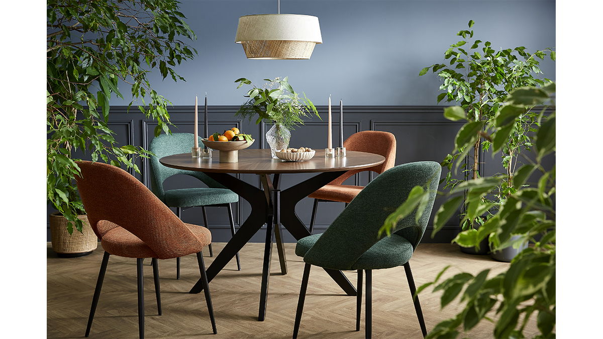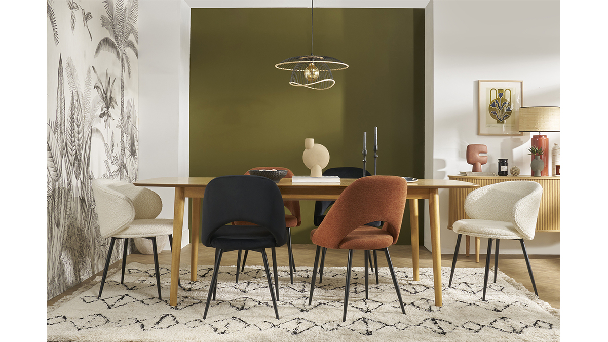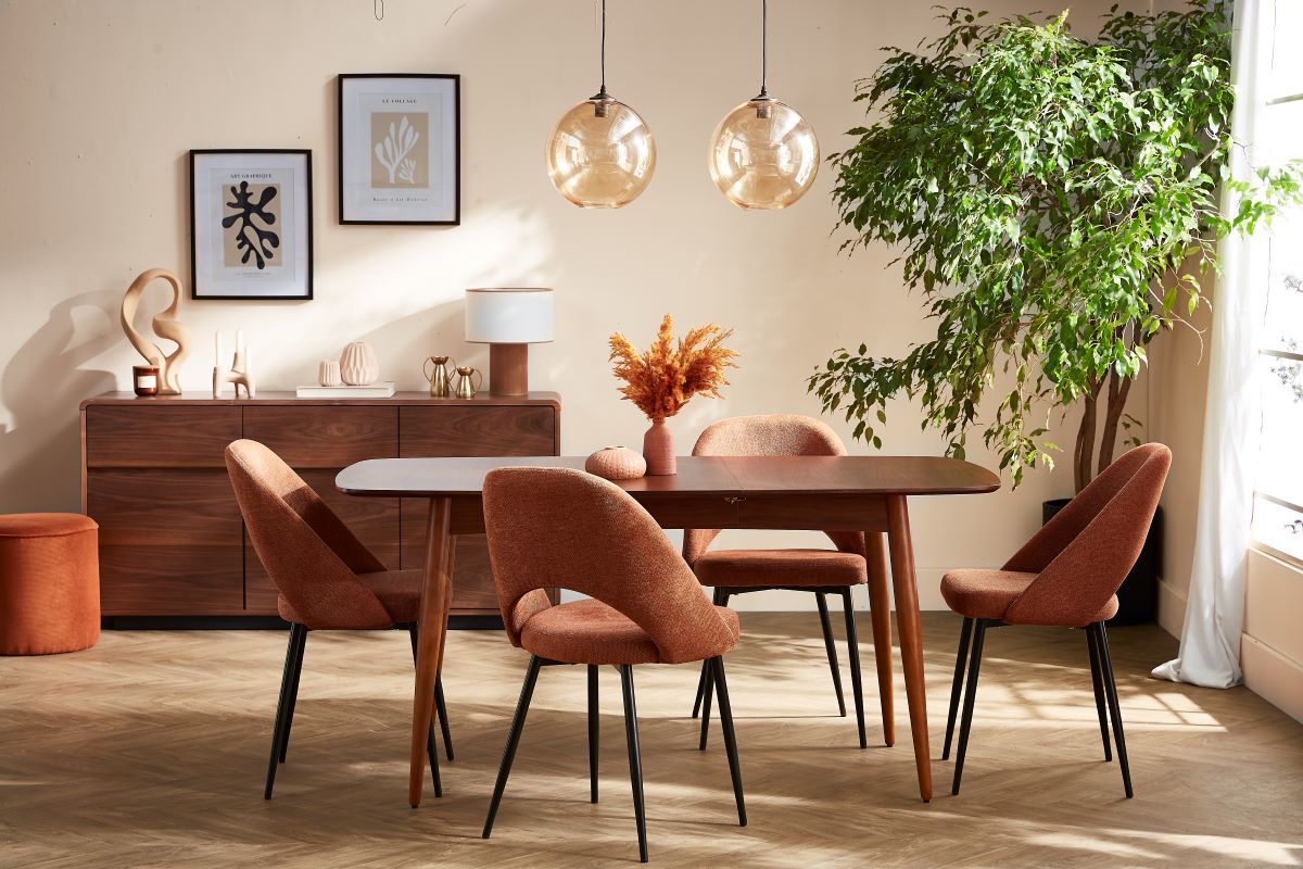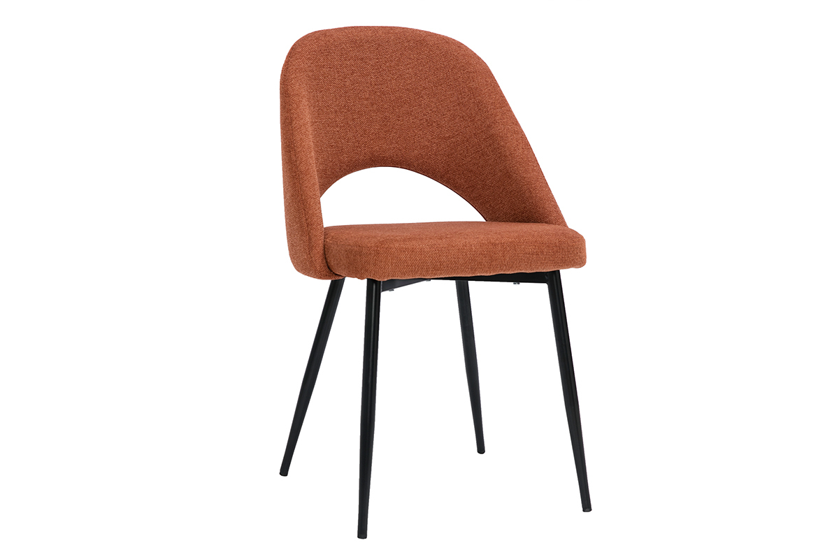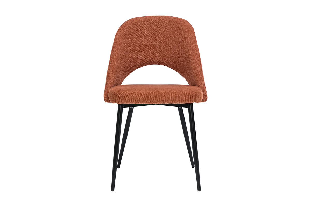 Ces assises au charme subtilement rétro sont synonymes de convivialité et de partage. Leur tissu effet velours texturé (100% polyester) se décline dans un coloris terre brûlée, rappel de la couleur terracotta, une teinte chaleureuse et envoutante. Les pieds fuselés en métal noir apportent de la légèreté à la silhouette et s'accordent aisément avec tous les styles de tables à manger.