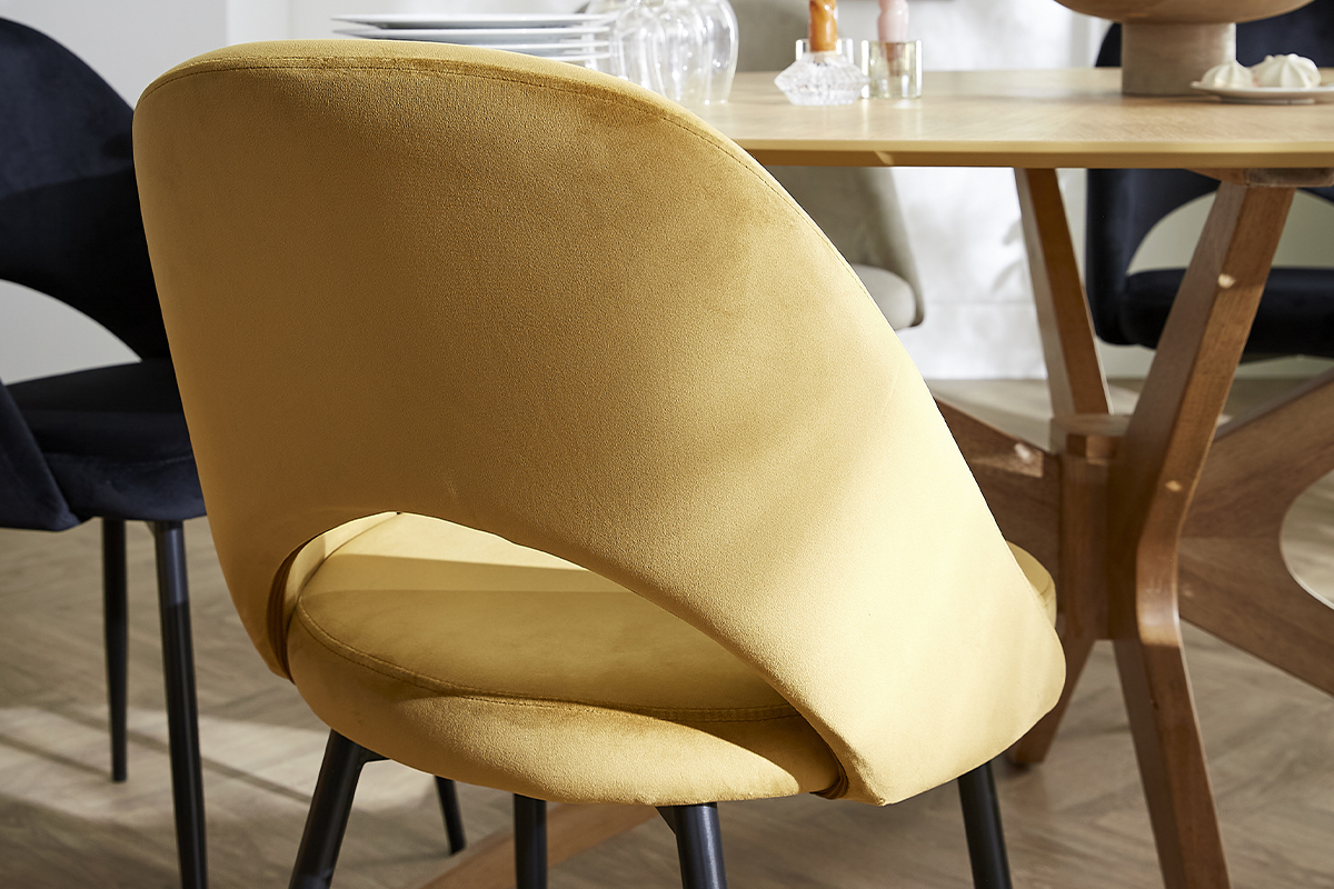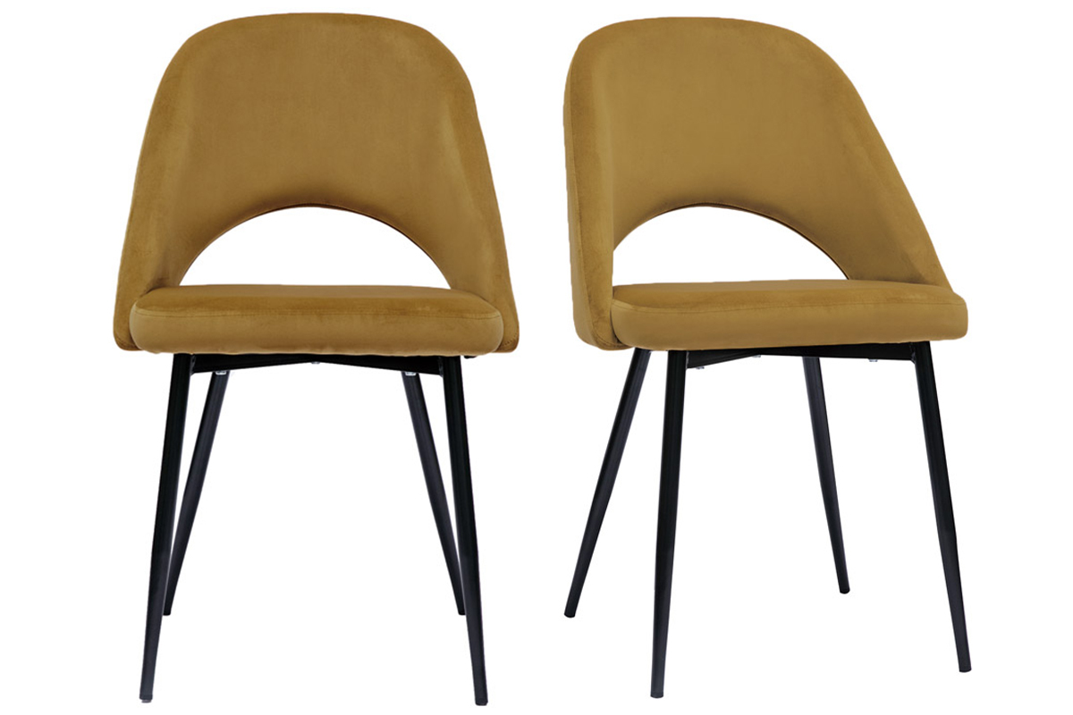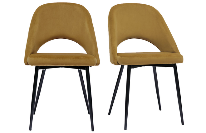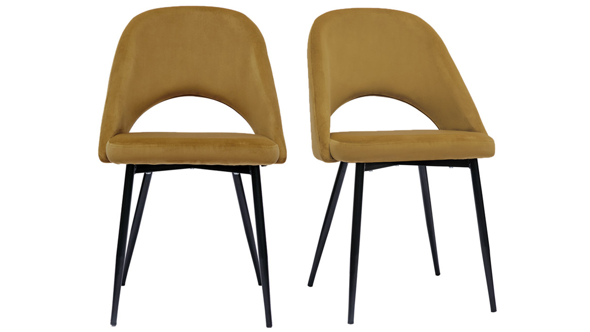 Ces assises au charme subtilement rétro sont synonymes de convivialité et de partage. Leur joli revêtement en velours (100% polyester) se décline en couleur bronze, une teinte aussi envoûtante qu'élégante. Les pieds fuselés en métal noir apportent de la légèreté à la silhouette et s'accordent aisément avec tous les styles de tables à manger.