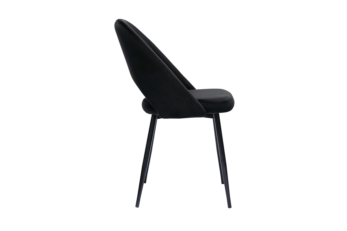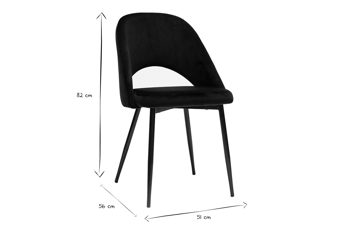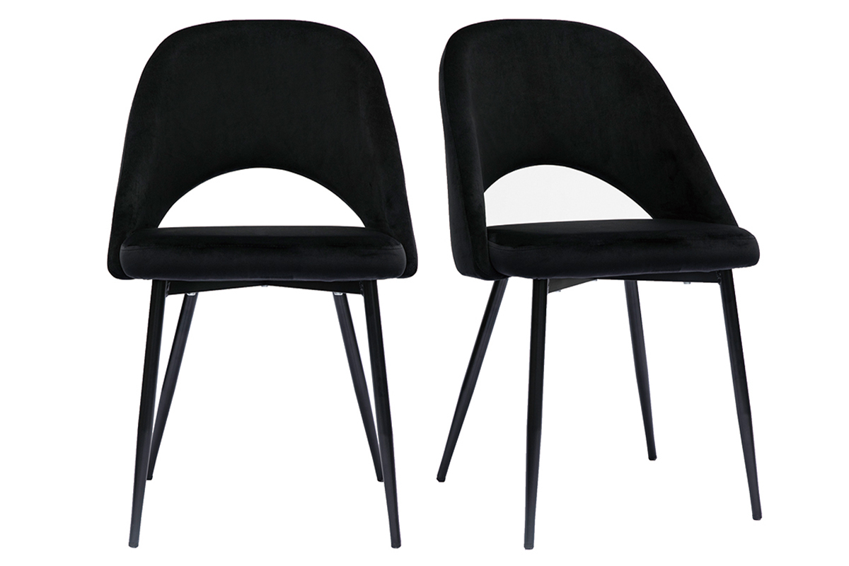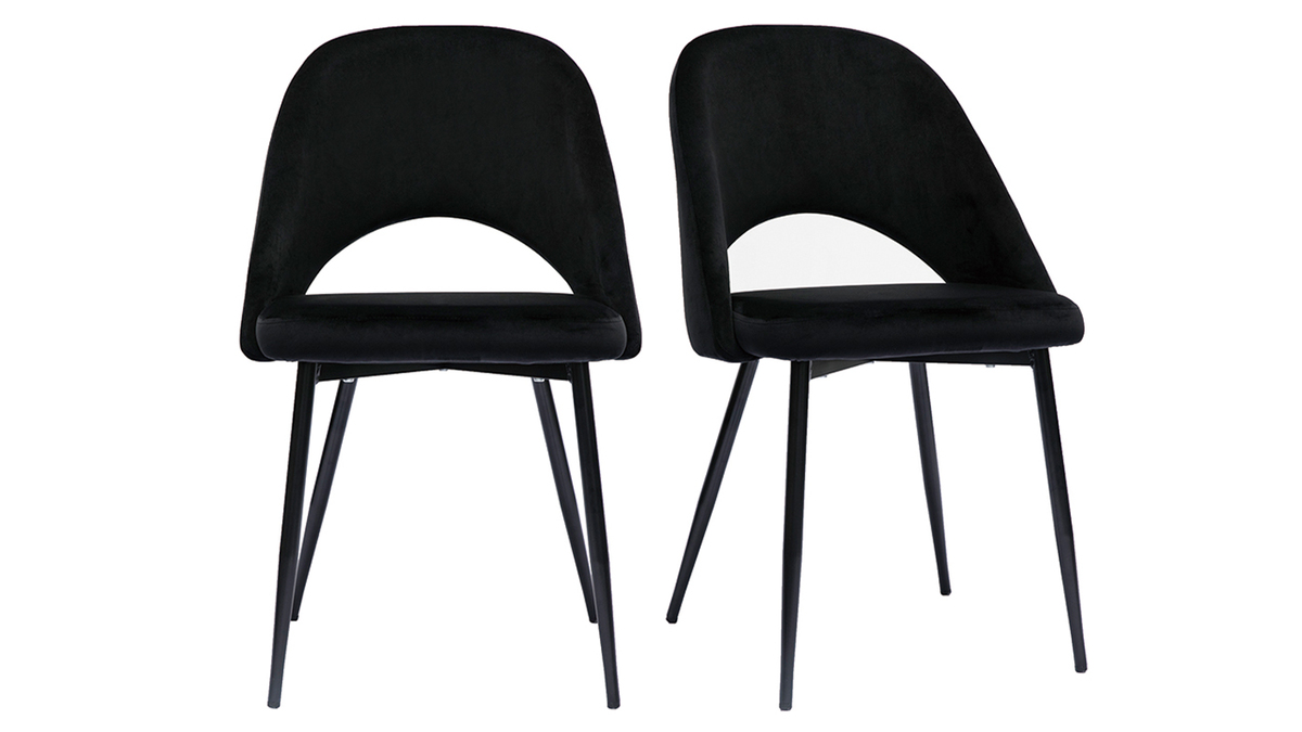 Ces assises au charme subtilement rétro sont synonymes de convivialité et de partage. Leur revêtement en tissu velours (100% polyester) se décline en noir, une teinte sobre et élégante par excellence. Les pieds fuselés en métal noir apportent de la légèreté à la silhouette et s'accordent aisément avec tous les styles de tables à manger.