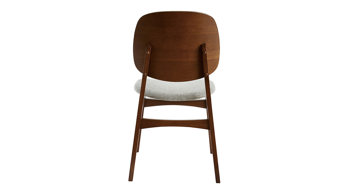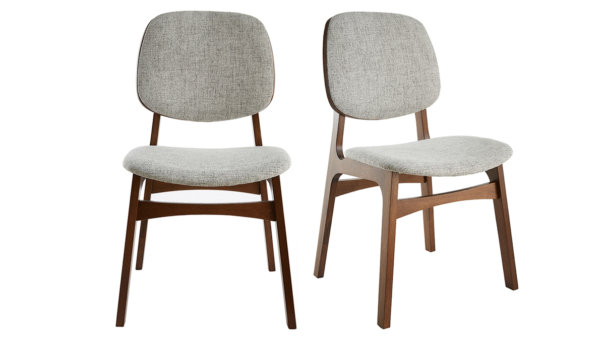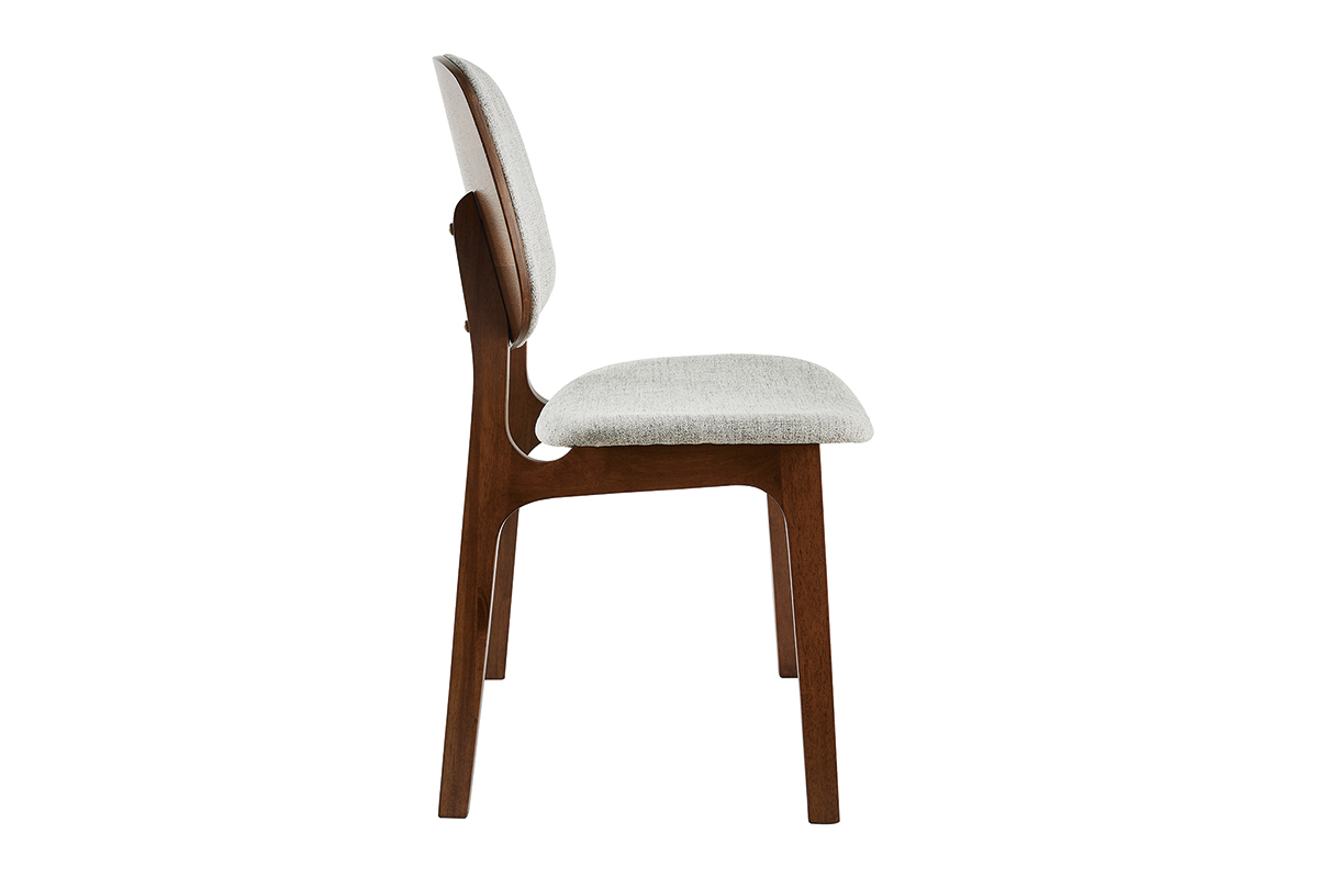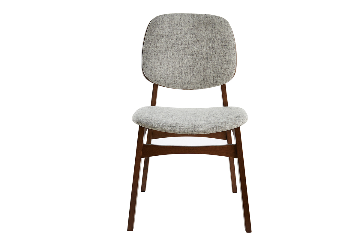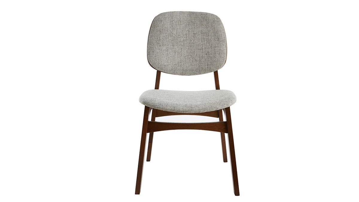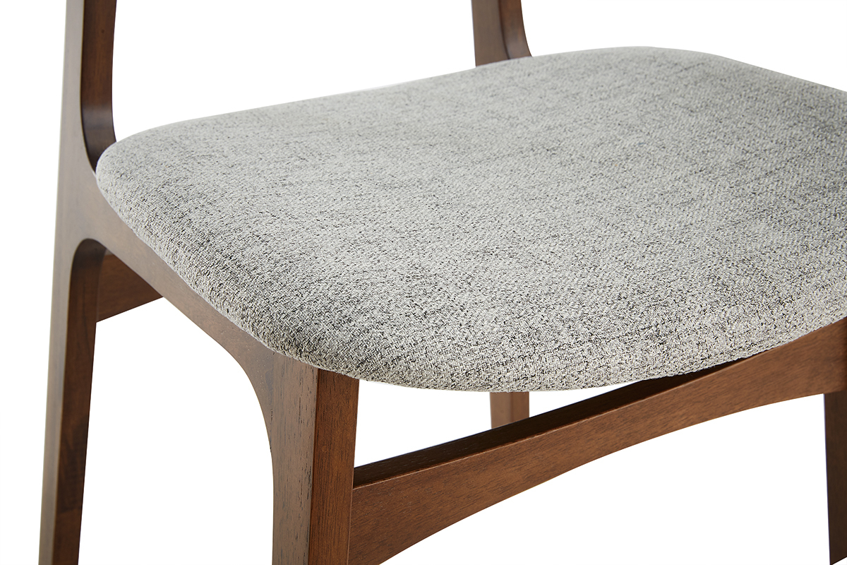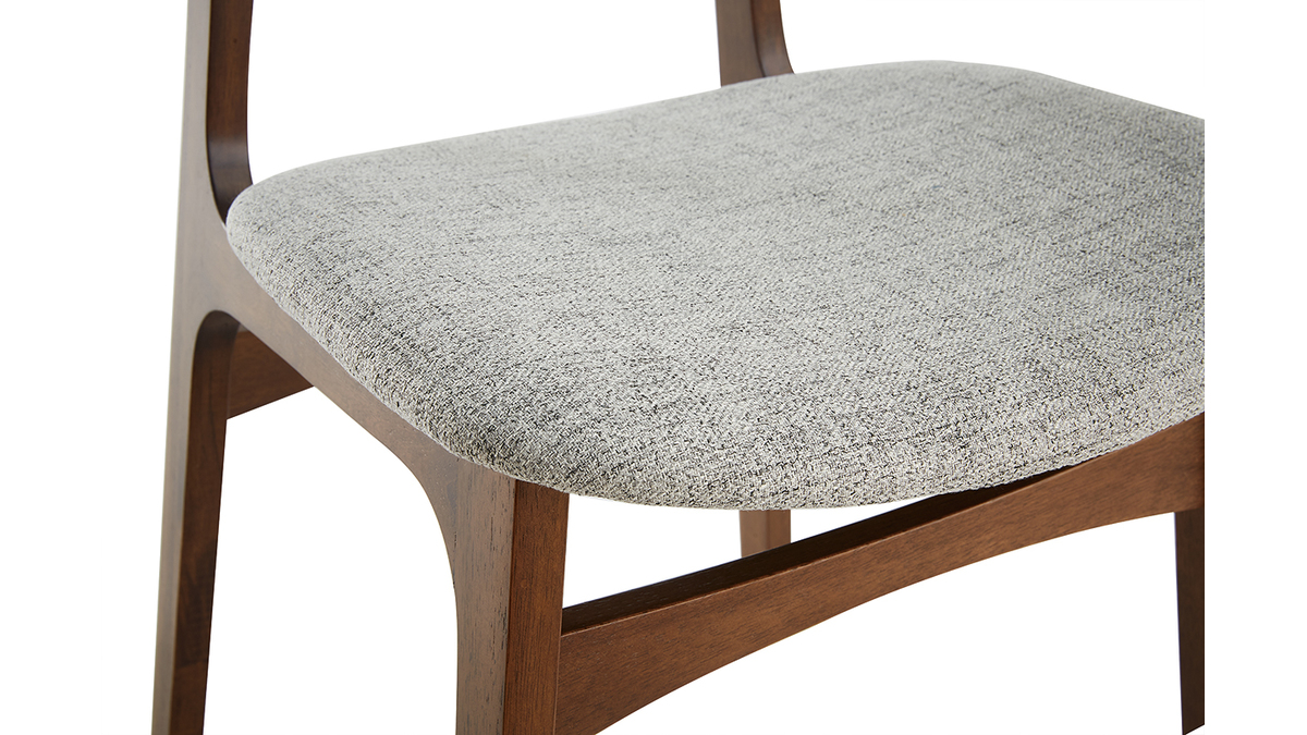 Sous des lignes à l'inspiration vintage tout en rondeur, ce modèle inspiré des 50's se démarque par un joli jeu de matières ! Les tonalités chaudes de la structure en bois foncé contrastent élégamment avec le revêtement en tissu gris clair. Une finition textile agréable au toucher qui apportera de la douceur à votre coin repas. Volumes maîtrisés et design sobre : ces chaises vintage s'envisagent dans de nombreuses ambiances déco et tiendront une place de choix dans un coin repas à l'ambiance rétro.