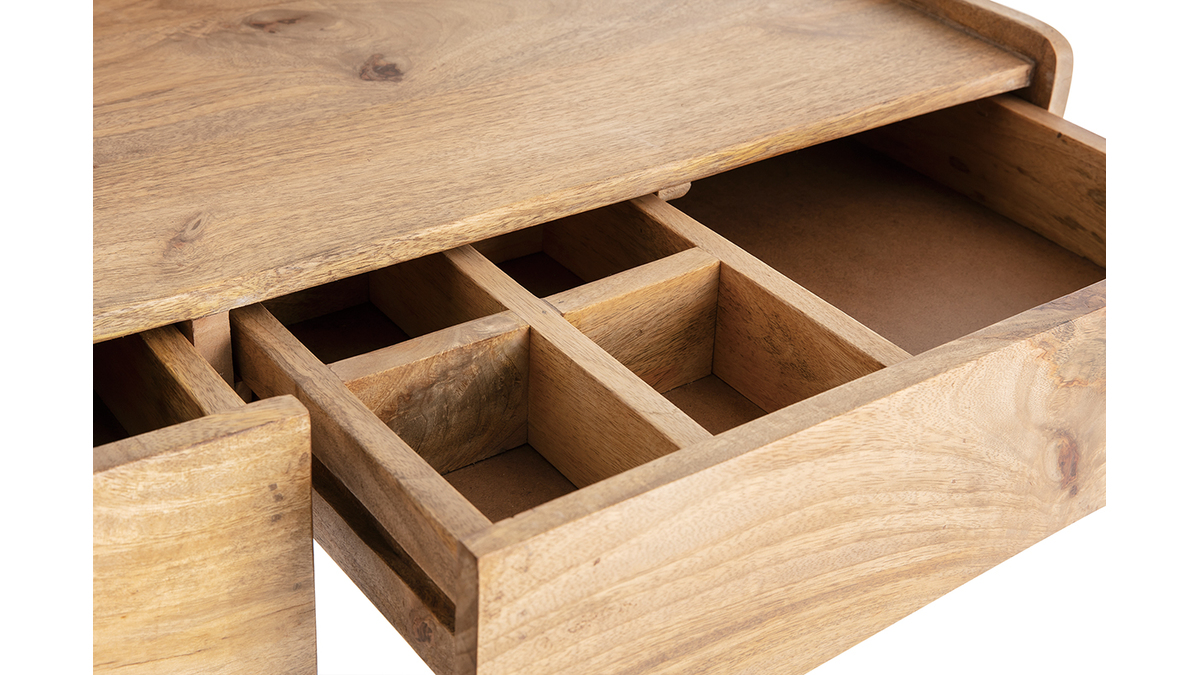 Parce qu'une coiffeuse est un meuble conçu spécialement pour le bien-être, le modèle MATAHARI permet de garder à portée de mains tout le nécessaire pour se sentir bien. Il a été équipé de deux tiroirs dont un compartimenté et son miroir amovible peut s'accrocher au mur.