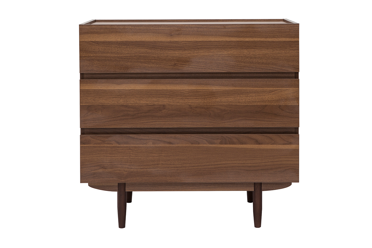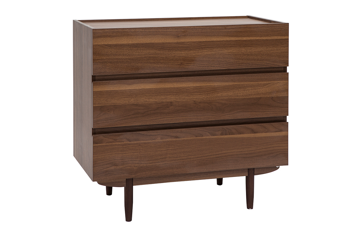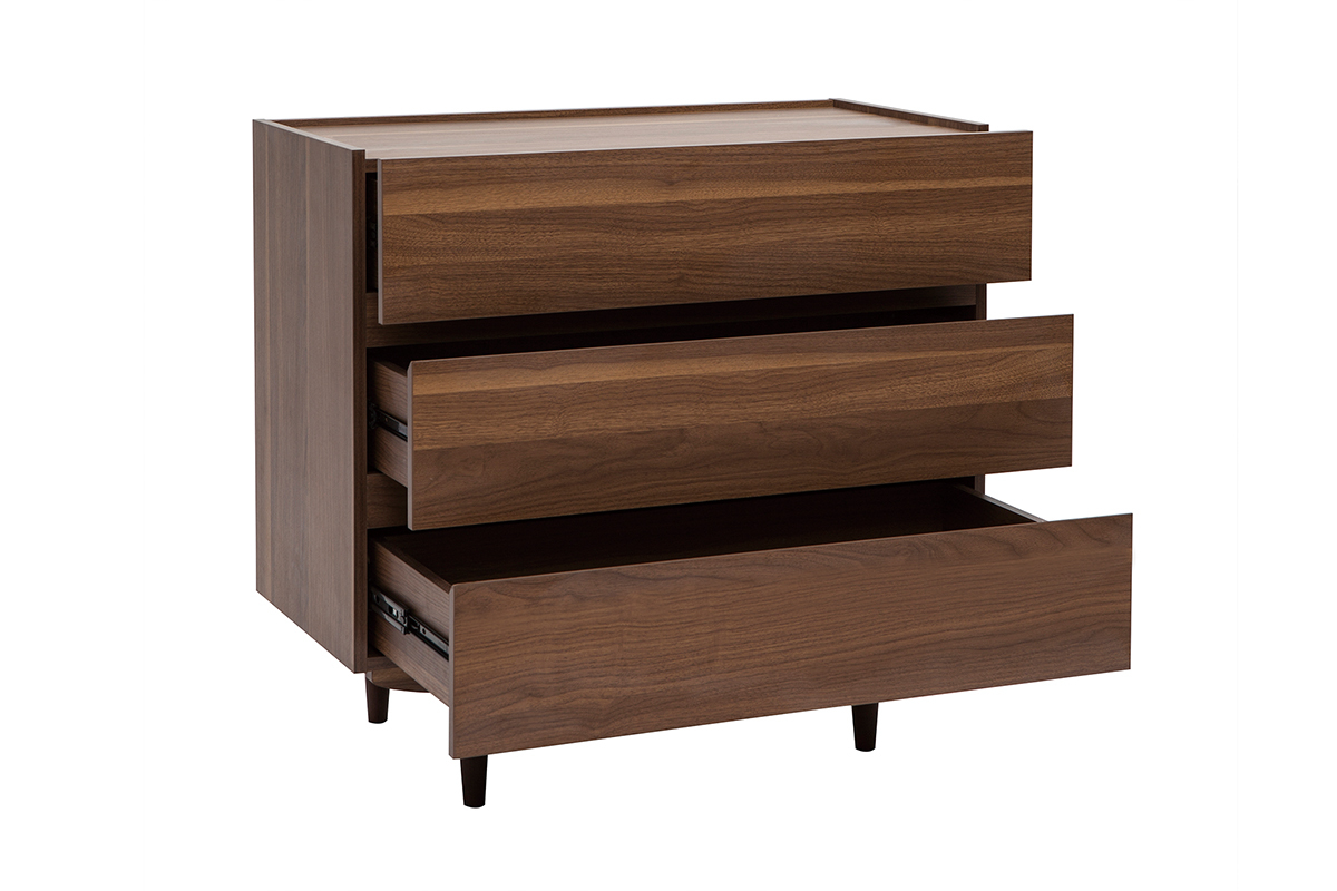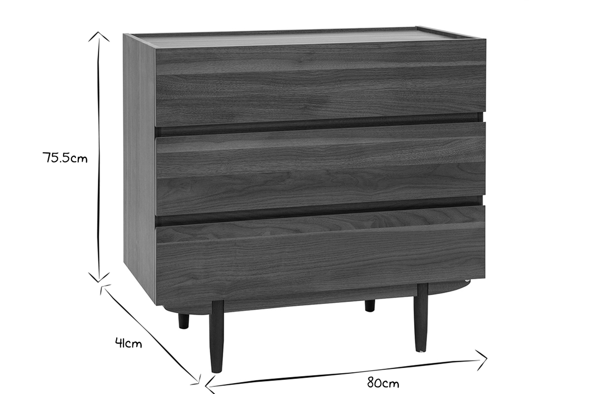Commode finition bois foncé noyer 3 tiroirs L80 cm SANAA livrée prête à assembler.