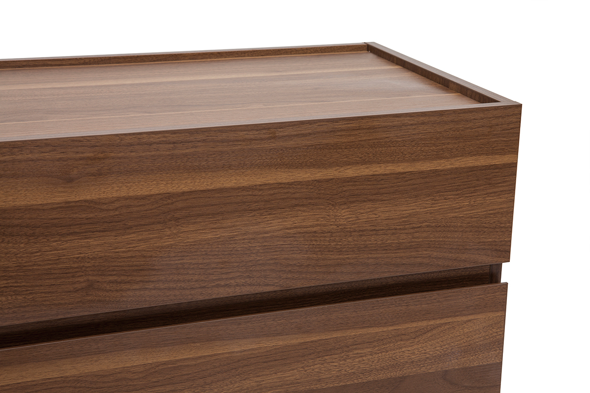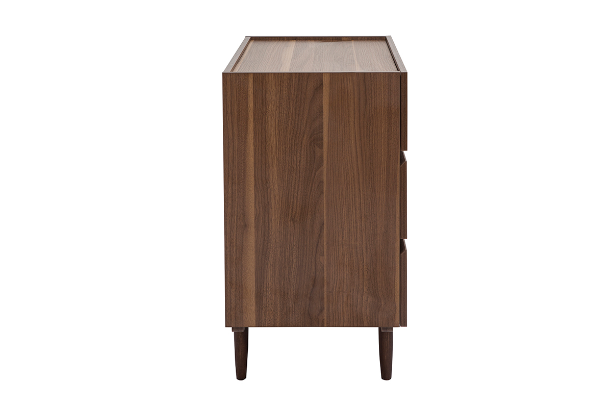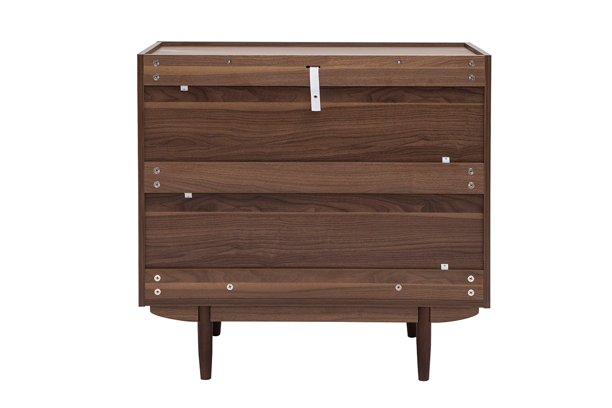 Faite pour durer, cette commode 3 tiroirs est composée d'une structure en panneaux de fibres de bois mélaminé finition noyer supportée par un piètement stable et robuste en hévéa massif teinté noyer.