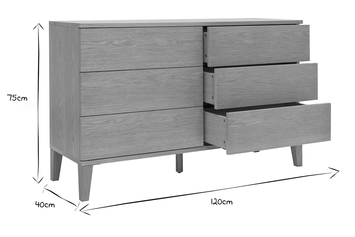 Initialement pensée pour la chambre, cette commode basse peut également faire office de buffet dans un salon. Avec son esthétique minimaliste, elle a été conçue sur un principe simple : maximiser la fonctionnalité tout en minimisant la perte d'espace. Peu profonde, elle offre ainsi une belle capacité de rangement avec ses 6 tiroirs (dimensions intérieures : L53.5 x P28.5 x H12.5 cm).