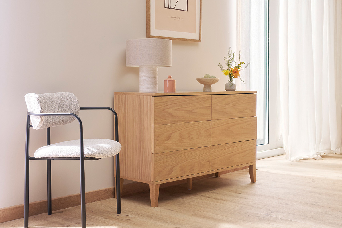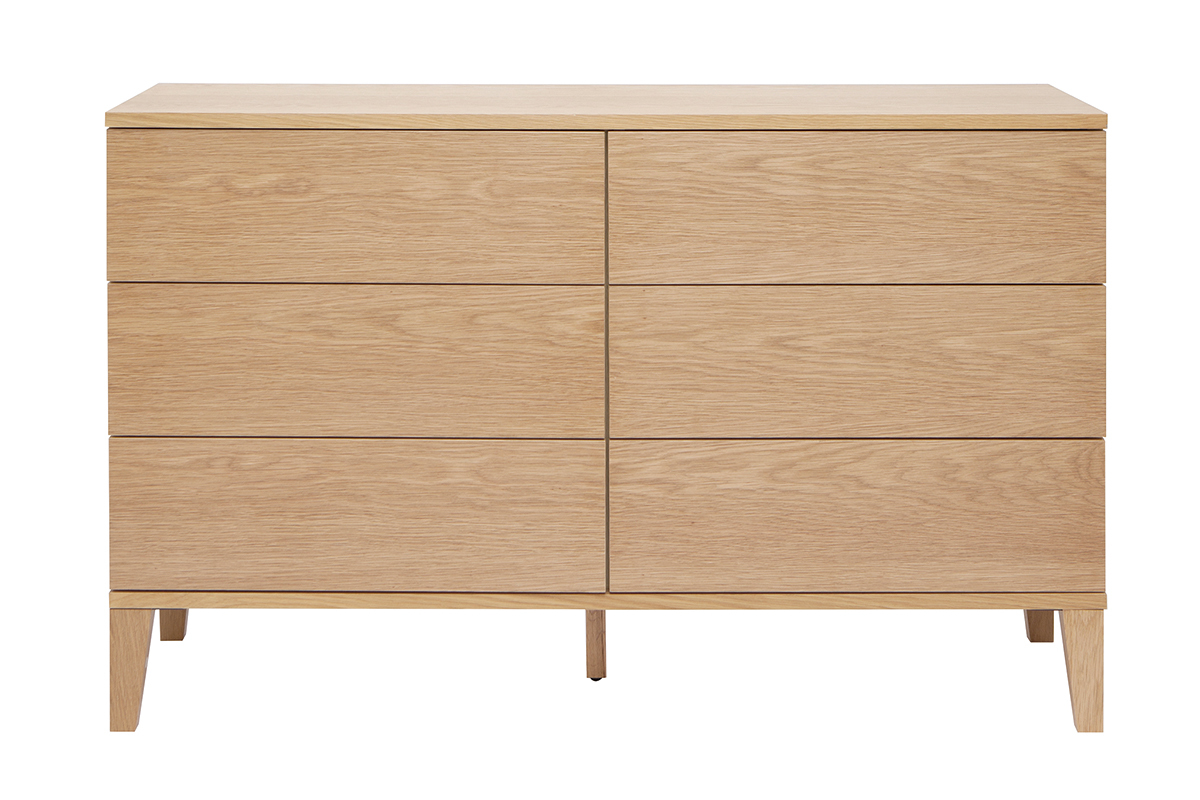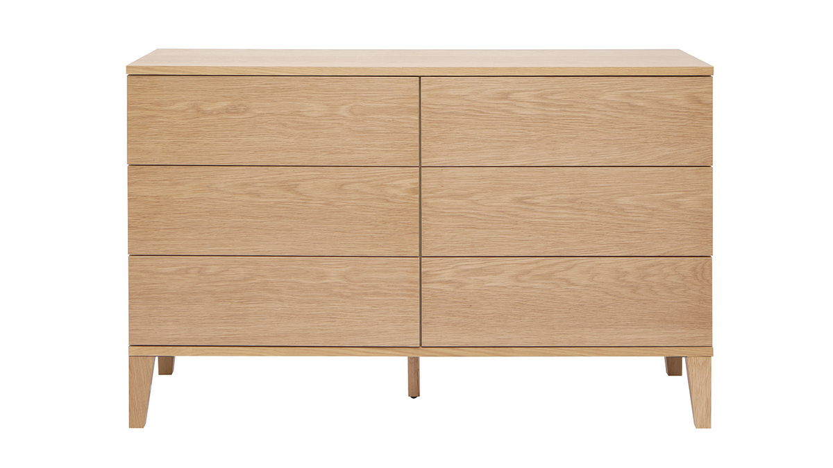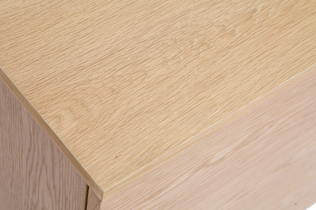 Conçue en panneaux de fibres de bois placage chêne, cette commode en bois clair présente un superbe aspect veiné ainsi que de jolies nuances dorées. Ses lignes nettes et essentielles mettent parfaitement en valeur la matière. Afin de nourrir et protéger le bois sans modifier son aspect naturel, un vernis transparent est apposé sur l'ensemble de la structure en chêne plaqué.