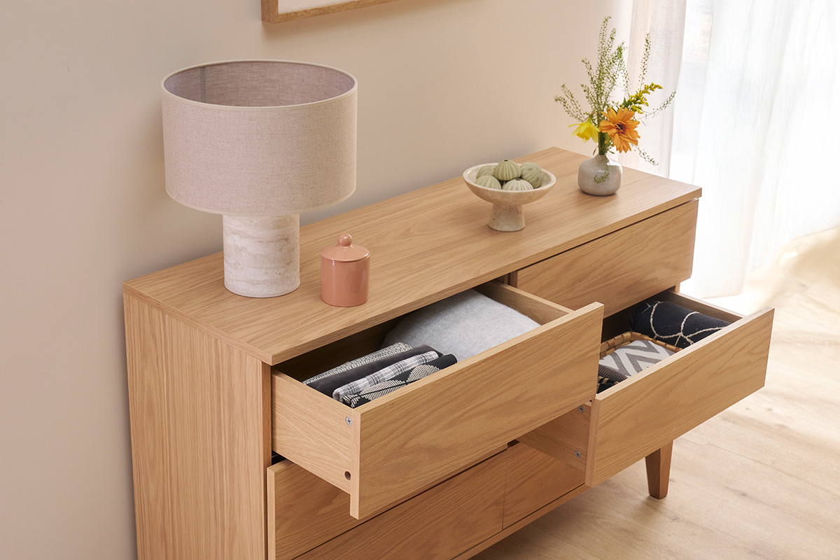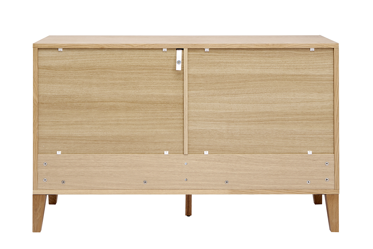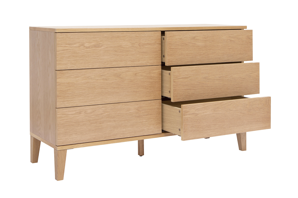 Conçue en panneaux de fibres de bois placage chêne, cette commode en bois clair présente un superbe aspect veiné ainsi que de jolies nuances dorées. Ses lignes nettes et essentielles mettent parfaitement en valeur la matière. Afin de nourrir et protéger le bois sans modifier son aspect naturel, un vernis transparent est apposé sur l'ensemble de la structure en chêne plaqué.
