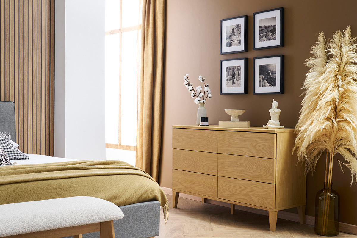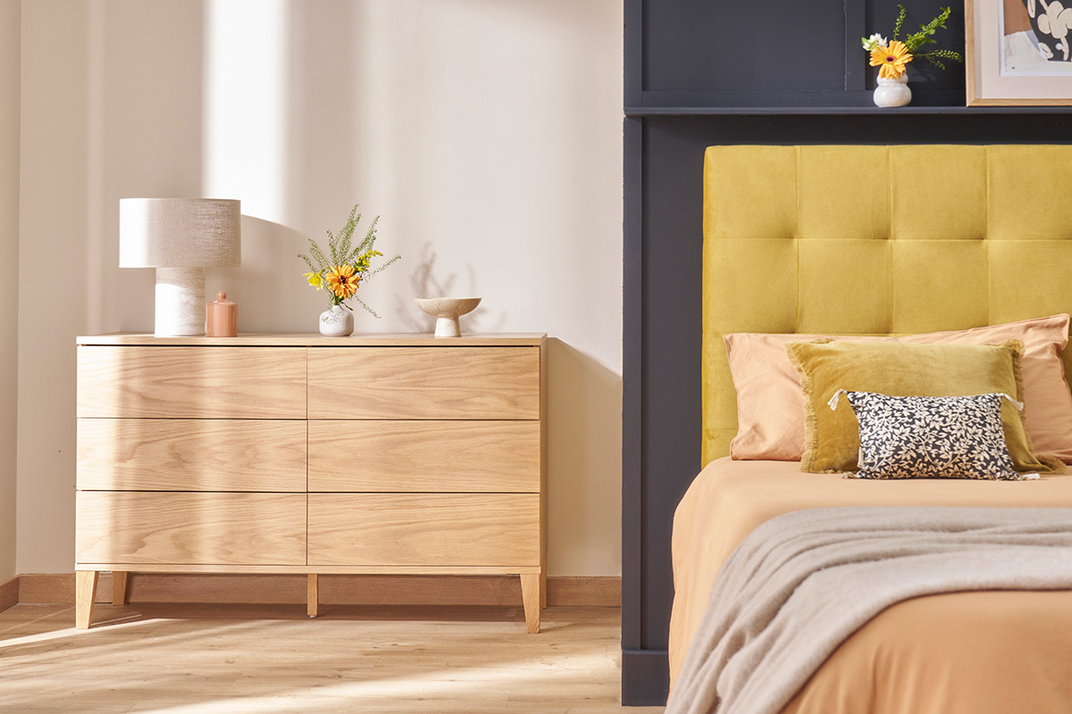 Composez une chambre sur mesure en associant la commode 6 tiroirs FREDDY à une table de chevet assortie.