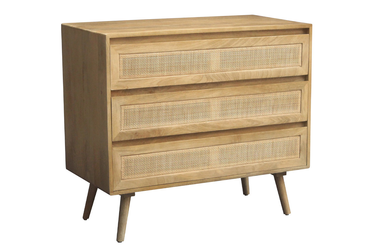 Exercice d'équilibre loin de tout superflu, ce modèle de commode 3 tiroirs en bois et cannage rotin signe des lignes classiques et des volumes minimalistes. Une simplicité qui s'exprime aussi dans le choix des matériaux. Retour en vogue dans nos intérieurs, le cannage rotin habille les façades des tiroirs et s'associe à merveille à la structure en manguier massif, une essence de bois exotique dont les reflets blonds réchauffent l'ambiance. Voilà une commode déco en bois massif qui répond à un désir de naturel et d'authenticité dans la maisonnée.