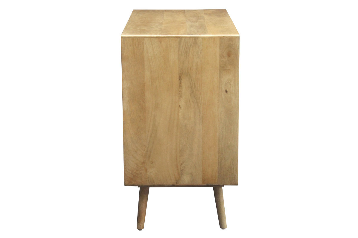 Avec la collection ACANGE, mon idée était de trouver un équilibre juste entre plein et vide, entre la présence solide du bois et la finesse du cannage. Les portes coulissantes apportent un rythme visuel et laissent deviner l’intérieur sans tout montrer.