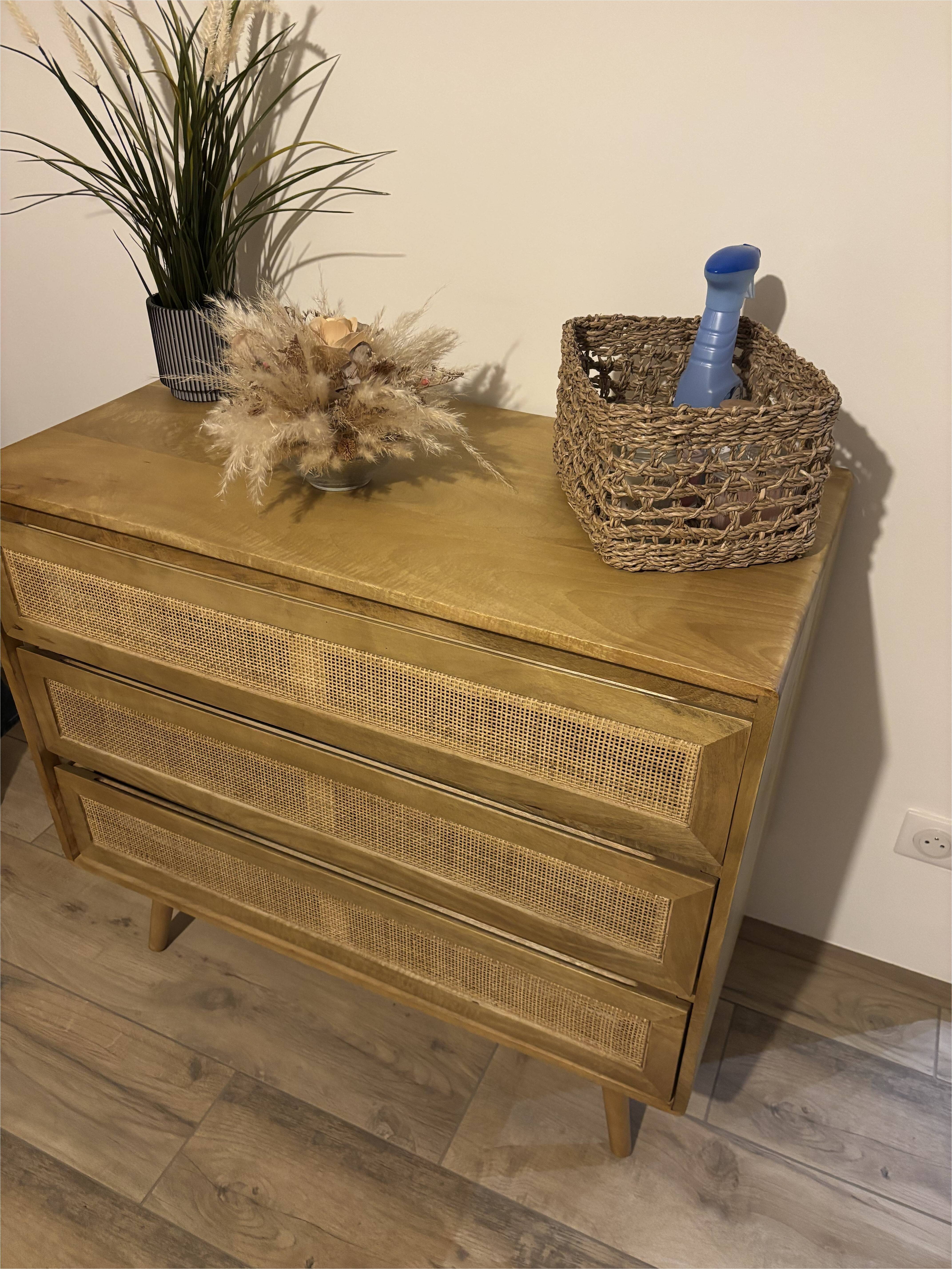Si cette commode rétro en bois et cannage coche tous les critères pour créer une chambre cocooning et chaleureuse, elle excelle également côté fonctionnalité. Même si vous n'êtes pas du matin, boostez votre bonne humeur dès le réveil, avec un espace nuit bien apprêté ! Grâce aux trois tiroirs (dimensions intérieures L83 x P36 x H12.5 cm), fini les vêtements qui jonchent le sol ou les livres au pied du lit. Joker des pièces où chaque m², avec ses dimensions L90 x P45 x H80 cm, cette petite commode à tiroirs bois et cannage invite à trier et organiser au carré ses favoris, sans encombrer ni gêner à la circulation.