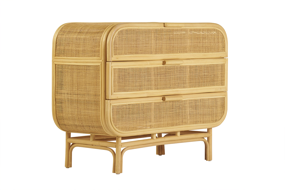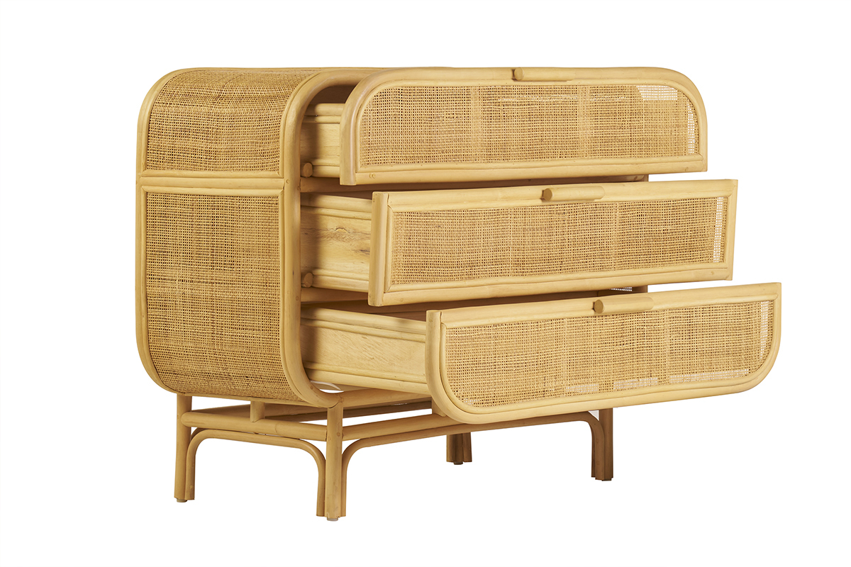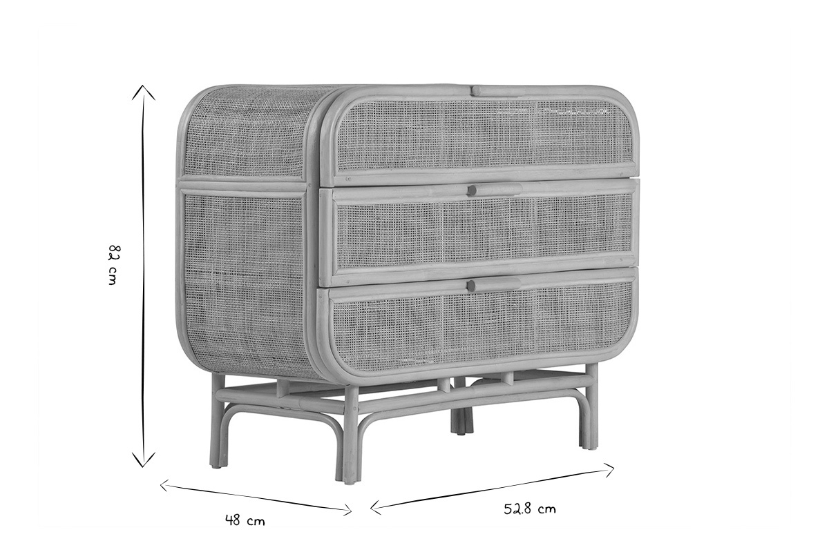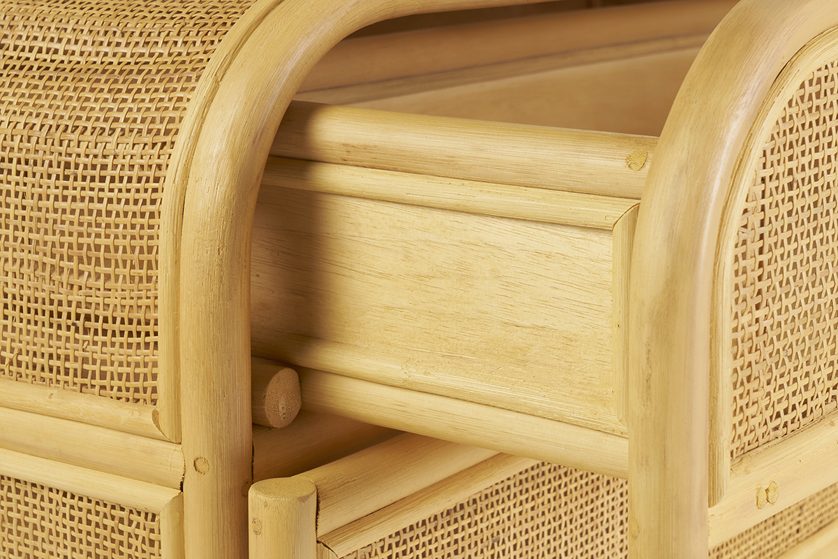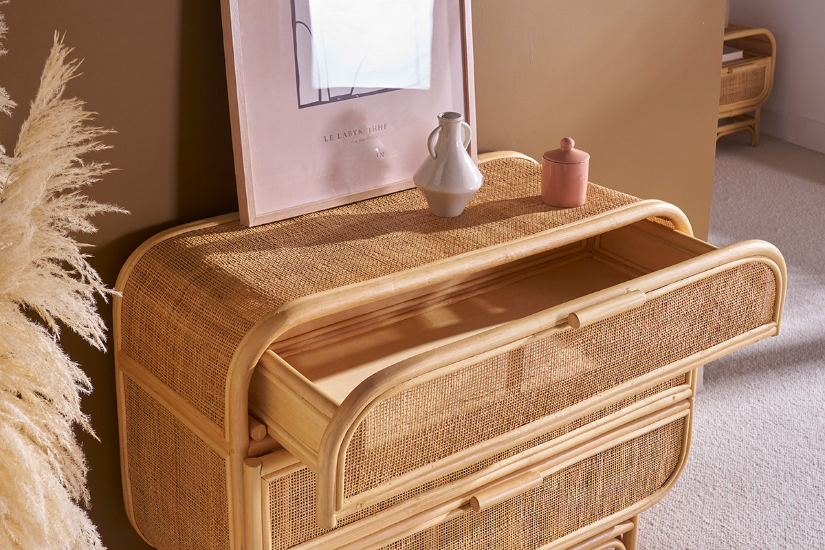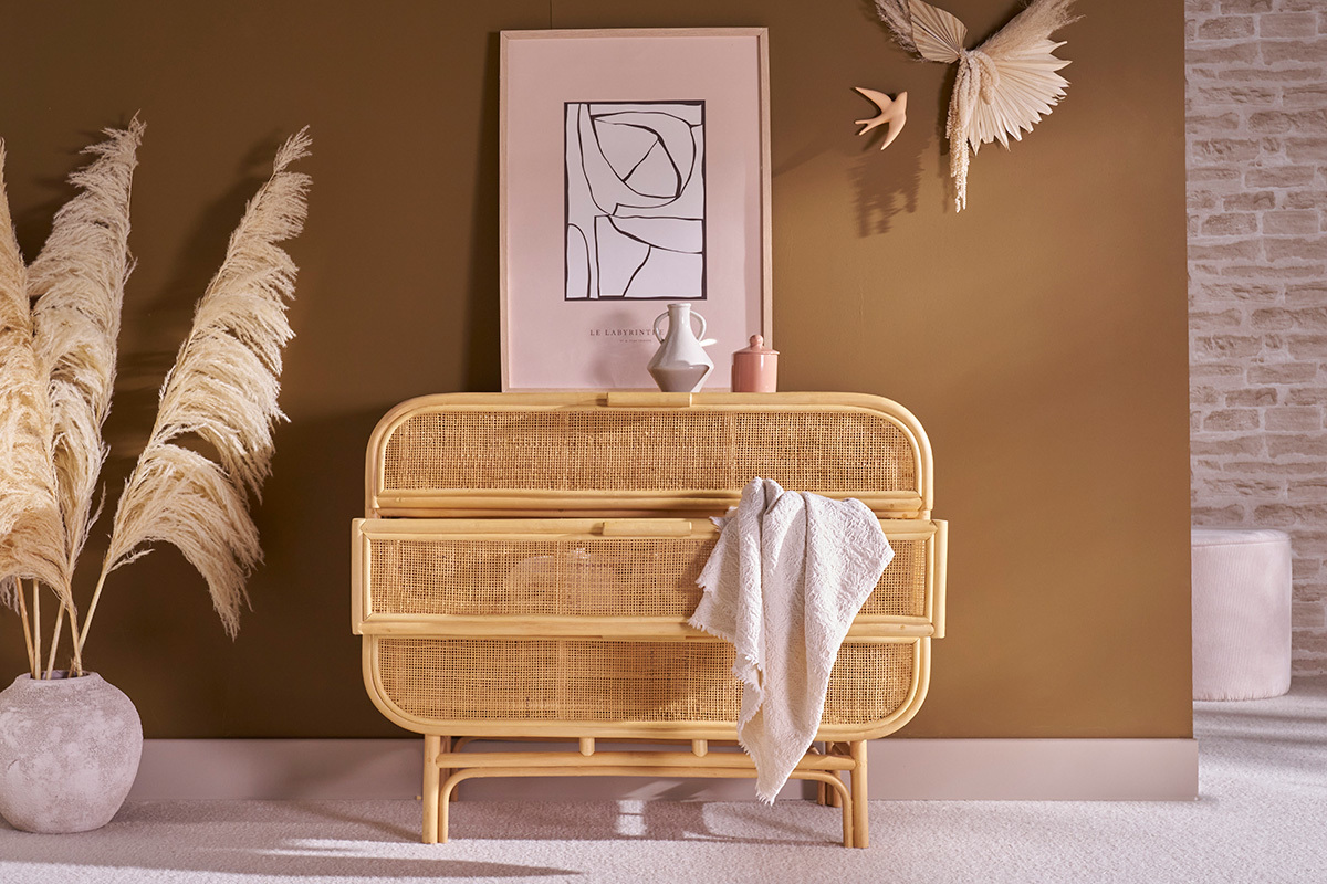 Fabriquée en rotin, cette commode bénéficie d’une structure robuste et légère, assurant à la fois durabilité et praticité. Le rotin, reconnu pour sa résistance et son aspect authentique, confère à ce meuble une allure intemporelle qui traverse les époques sans perdre de son charme. Sa finition soignée apporte une texture chaleureuse à votre décoration.