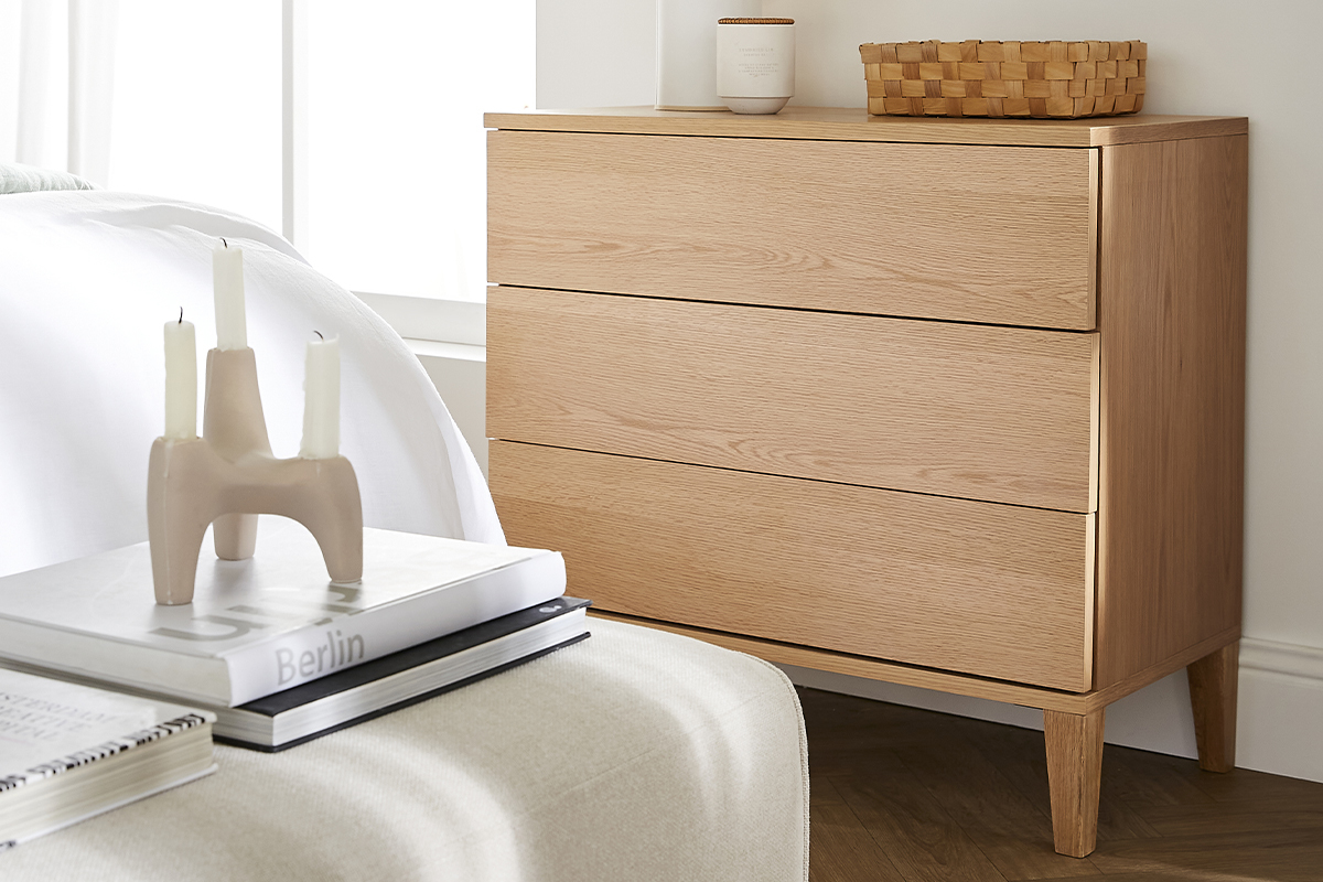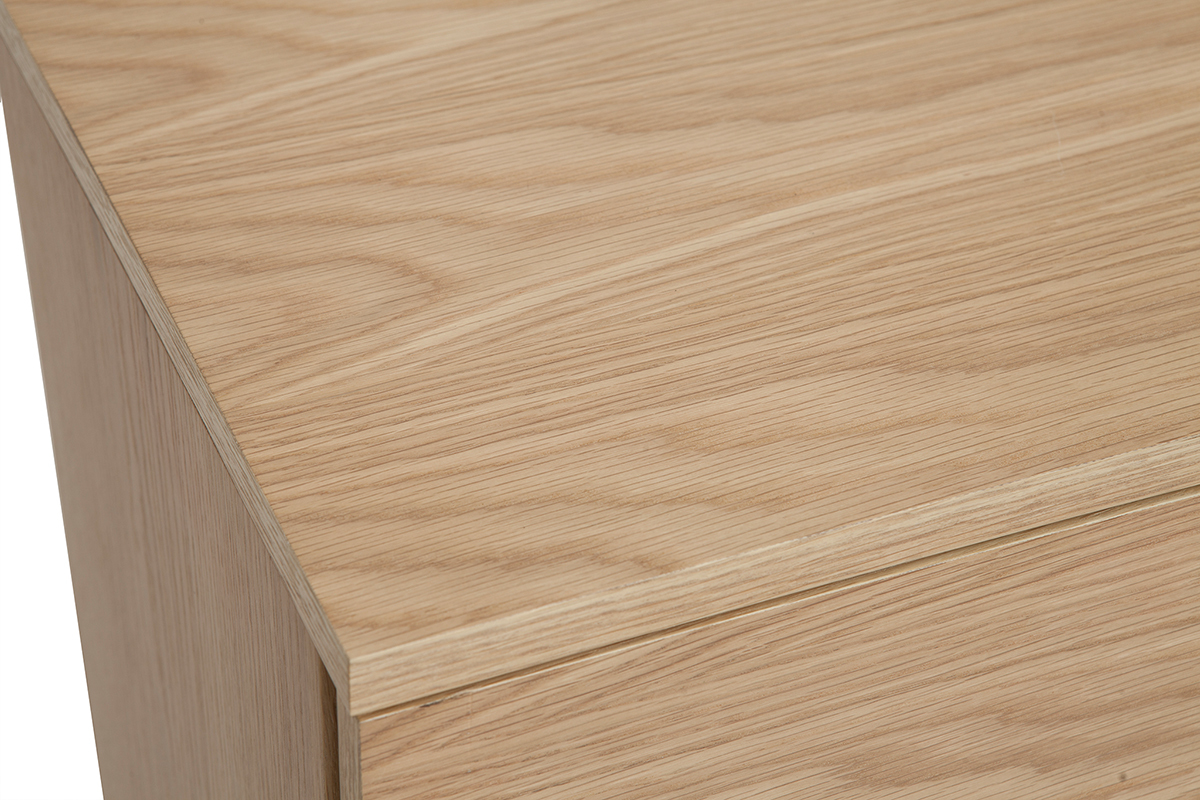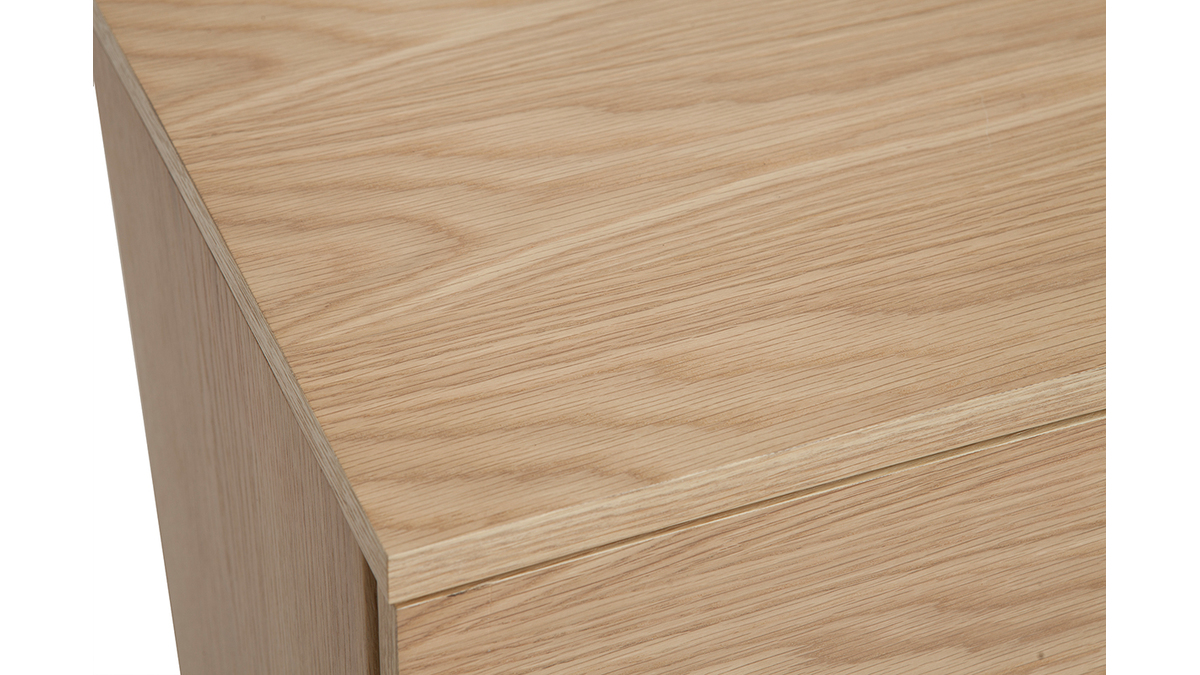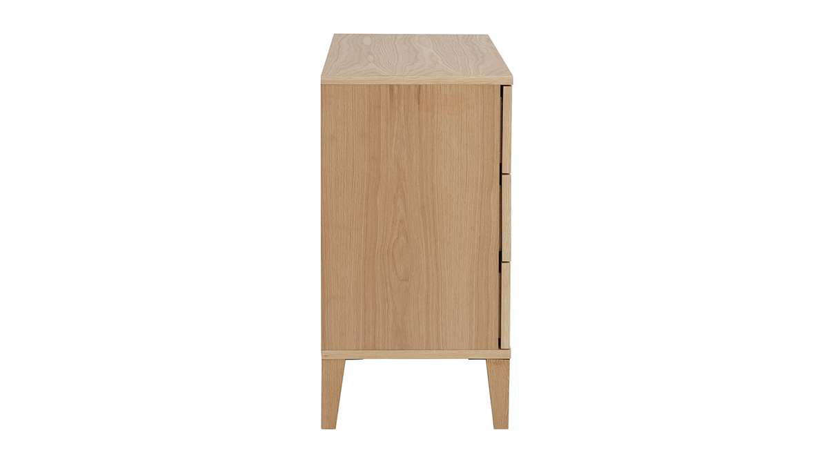 Au premier coup d'oeil, cette commode en bois clair donne le ton d'une pièce de mobilier scandinave ultra chaleureuse. Une structure en panneaux de fibres de bois placage chêne, des pieds en chêne massif : voici un meuble de rangement qui mise sur un total look bois pour réchauffer votre décoration d'intérieur avec style !
