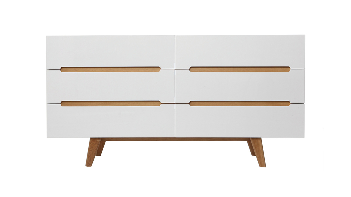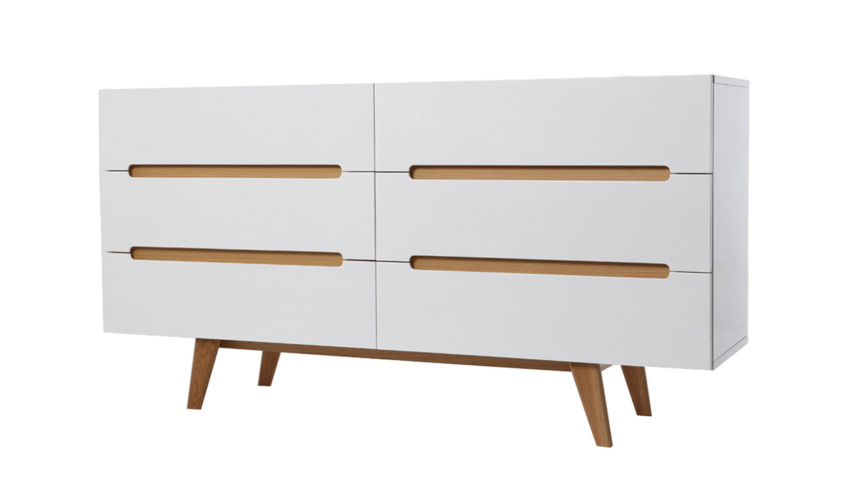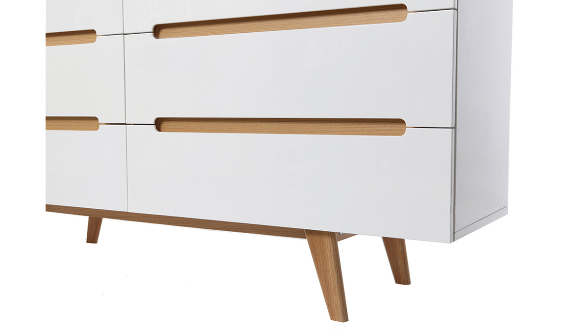 Conçue en panneaux de fibres de bois, cette commode blanche aux détails en bois clair se veut résolument robuste. Elle pourra vous accompagner sur une longue période. Dotée de finitions parfaites, cette commode blanc brillant dispose d'un pietement bois en frêne massif et de découpes également en frêne en guise de poignées. Sans aucun doute vous succomberez au charme de celle ci.