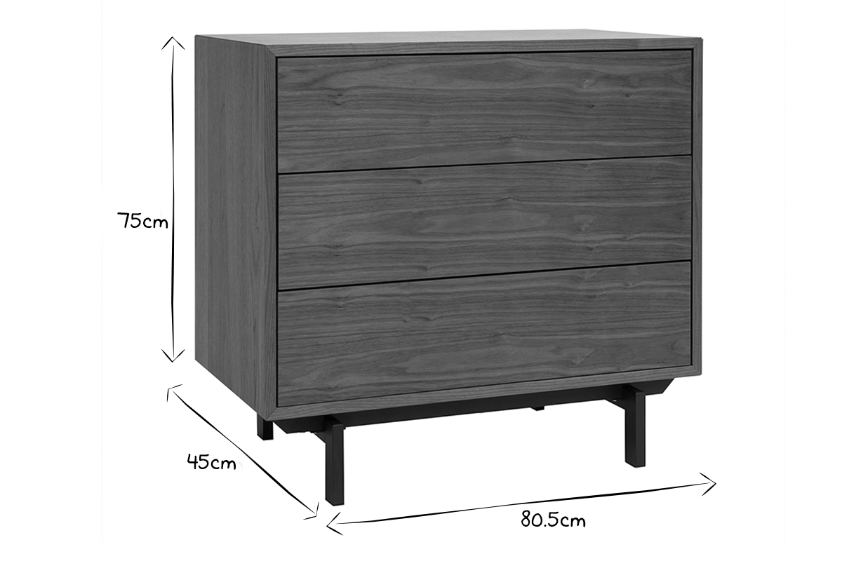 Avec ses dimensins L80.5 x P45 x H75 cm, cette petite commode basse permet d'ajouter des espaces de rangement facilement dans toutes vos pièces de vie, même dans une petite chambre ! Avec ses trois tiroirs (L72.2 x P38.3 x H12.6 cm), cette commode en bois foncé et métal noir deviendra sans aucun doute votre nouvel allié pour garder votre intérieur ordonné. Les indispensables de votre garde-robe seront ainsi parfaitement organisés !