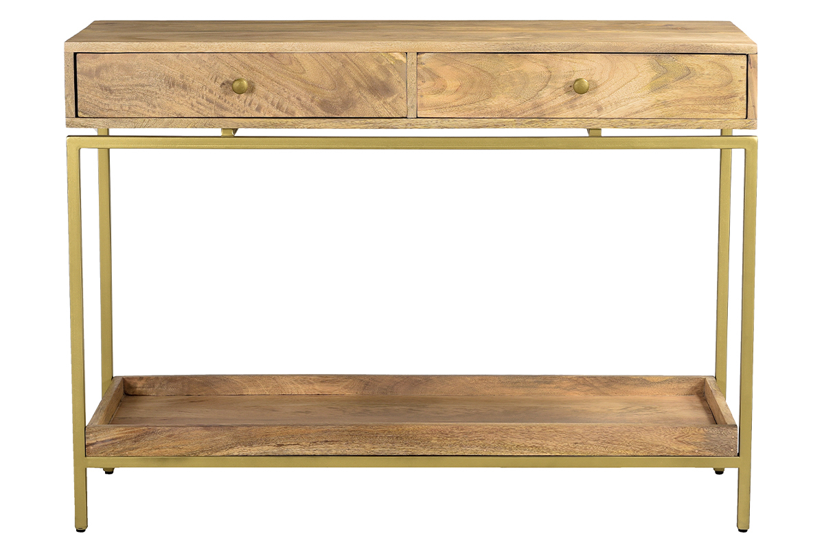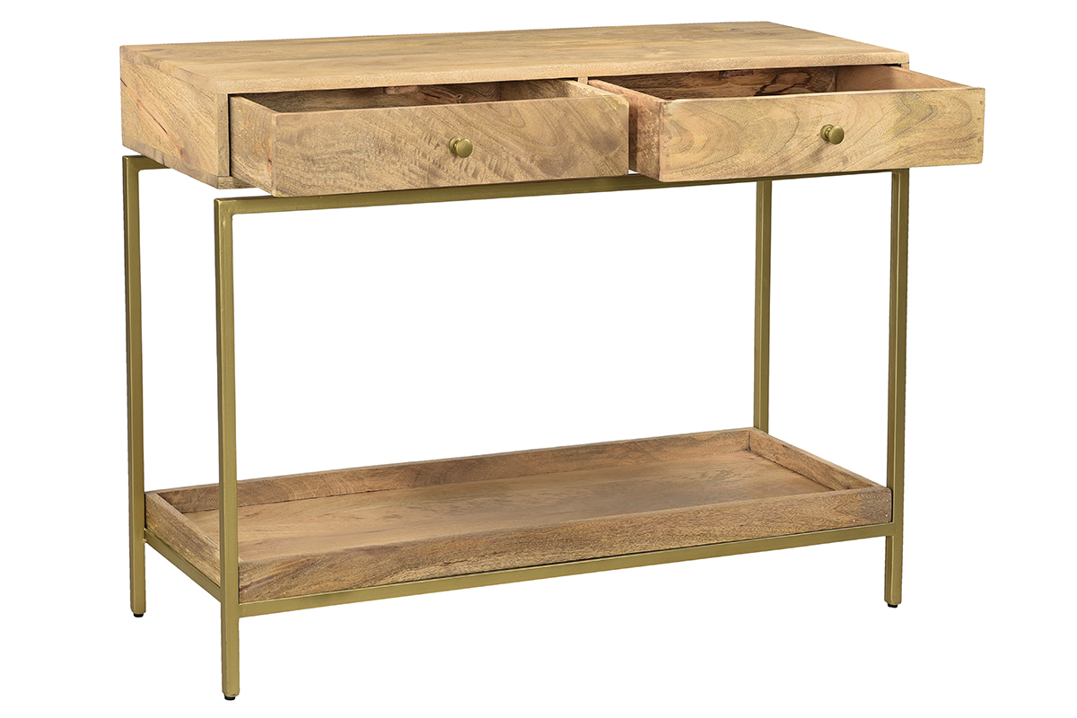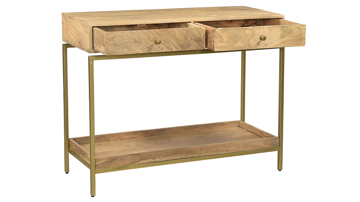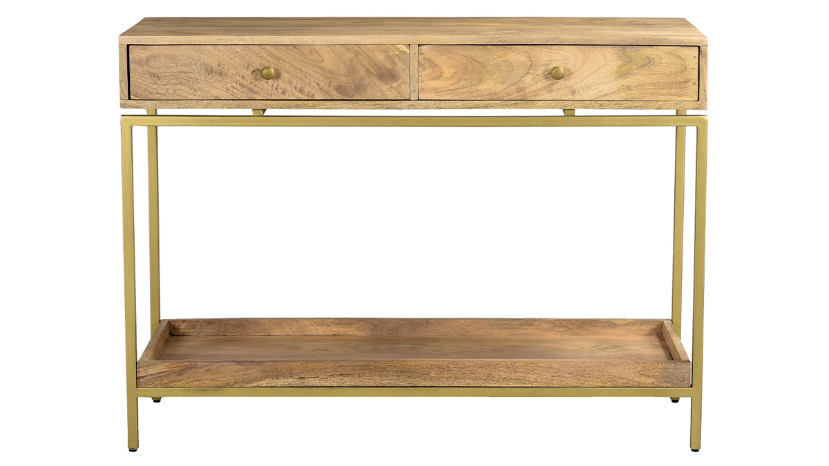 La console OCTAVIE offre un superbe mariage de matières. Avec un caisson et un plateau en manguier massif, une essence de bois au grain unique, elle bouscule les codes en mêlant cette matière naturelle à une structure et des poignées en métal doré. Grâce à ce contraste aussi étonnant qu'élégant, cette console avec rangements révélera toute la splendeur de votre intérieur.