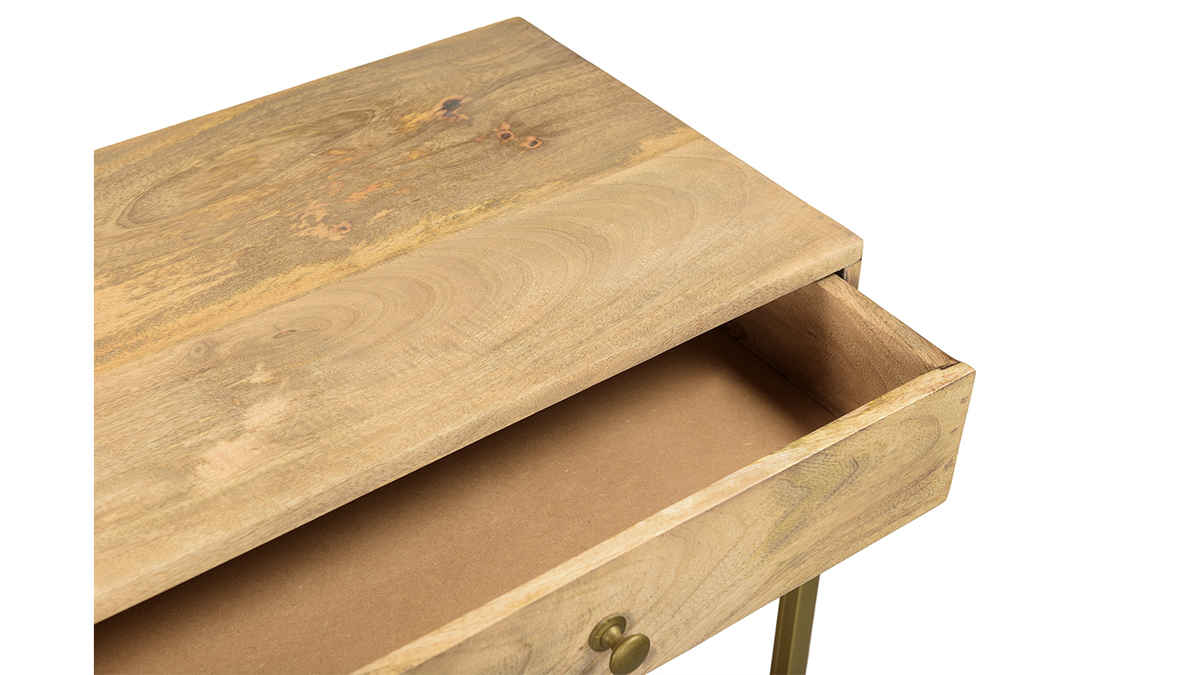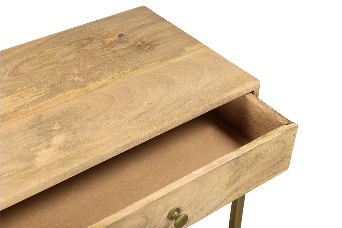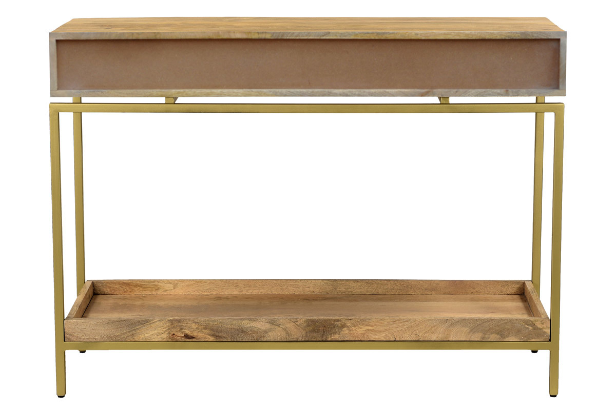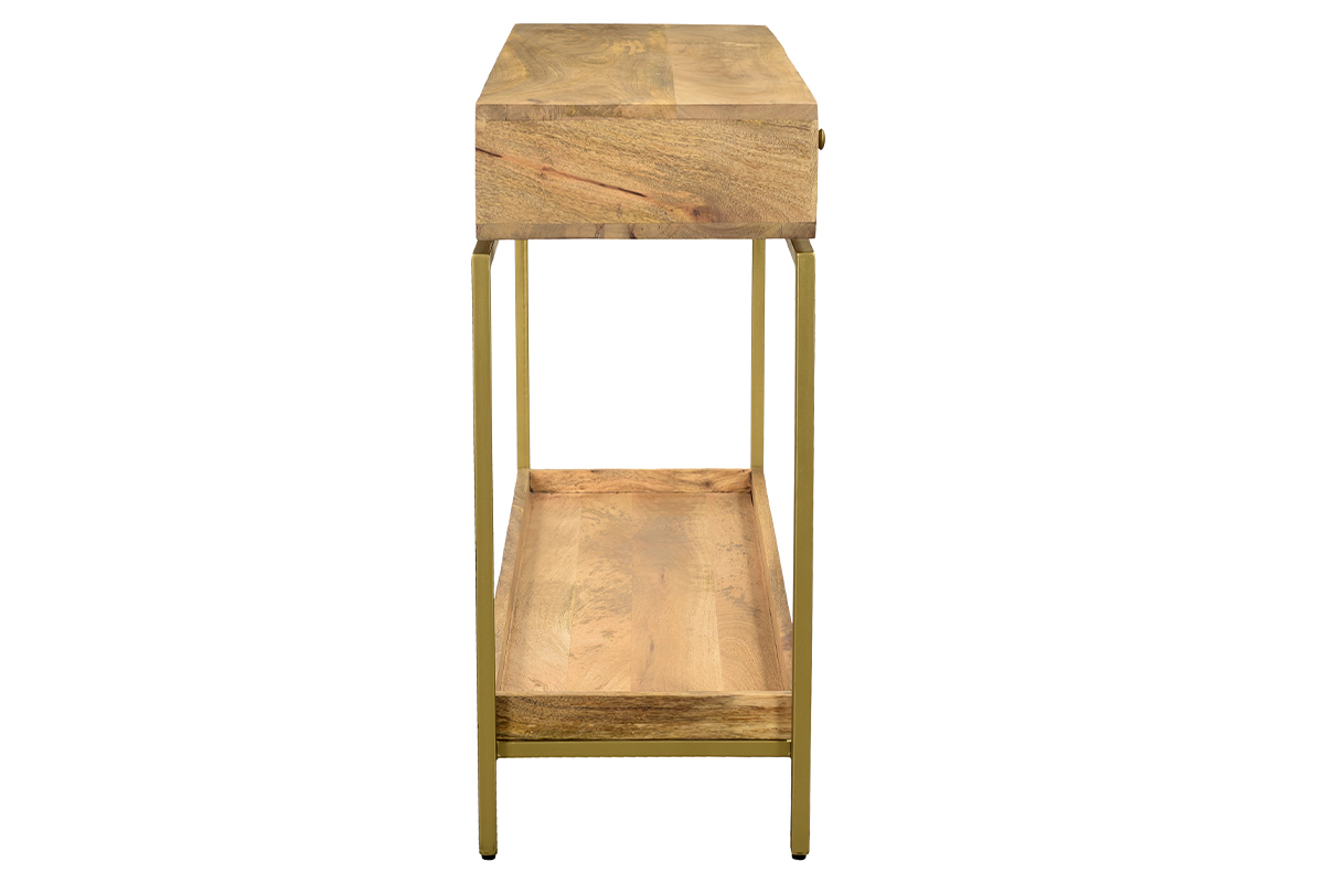 La console OCTAVIE offre un superbe mariage de matières. Avec un caisson et un plateau en manguier massif, une essence de bois au grain unique, elle bouscule les codes en mêlant cette matière naturelle à une structure et des poignées en métal doré. Grâce à ce contraste aussi étonnant qu'élégant, cette console avec rangements révélera toute la splendeur de votre intérieur.