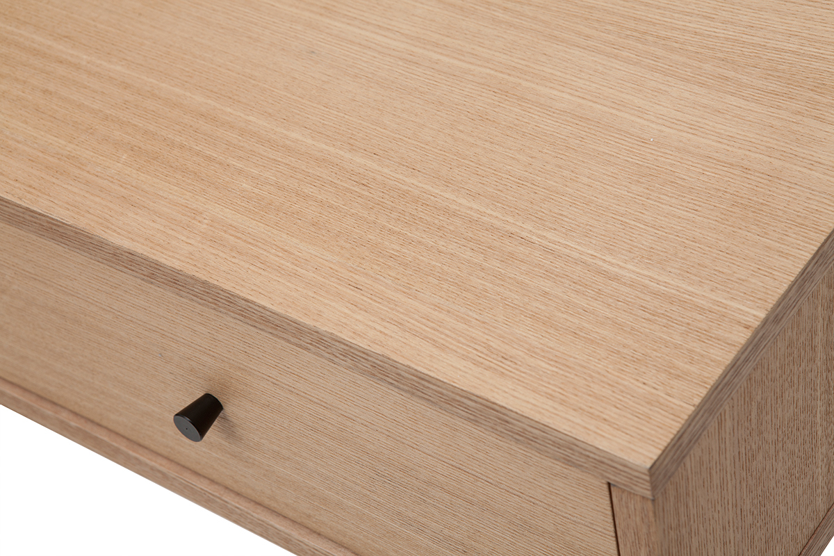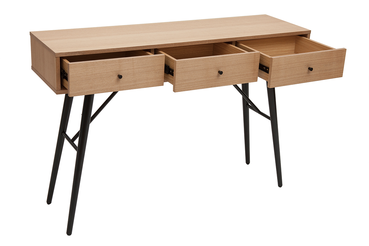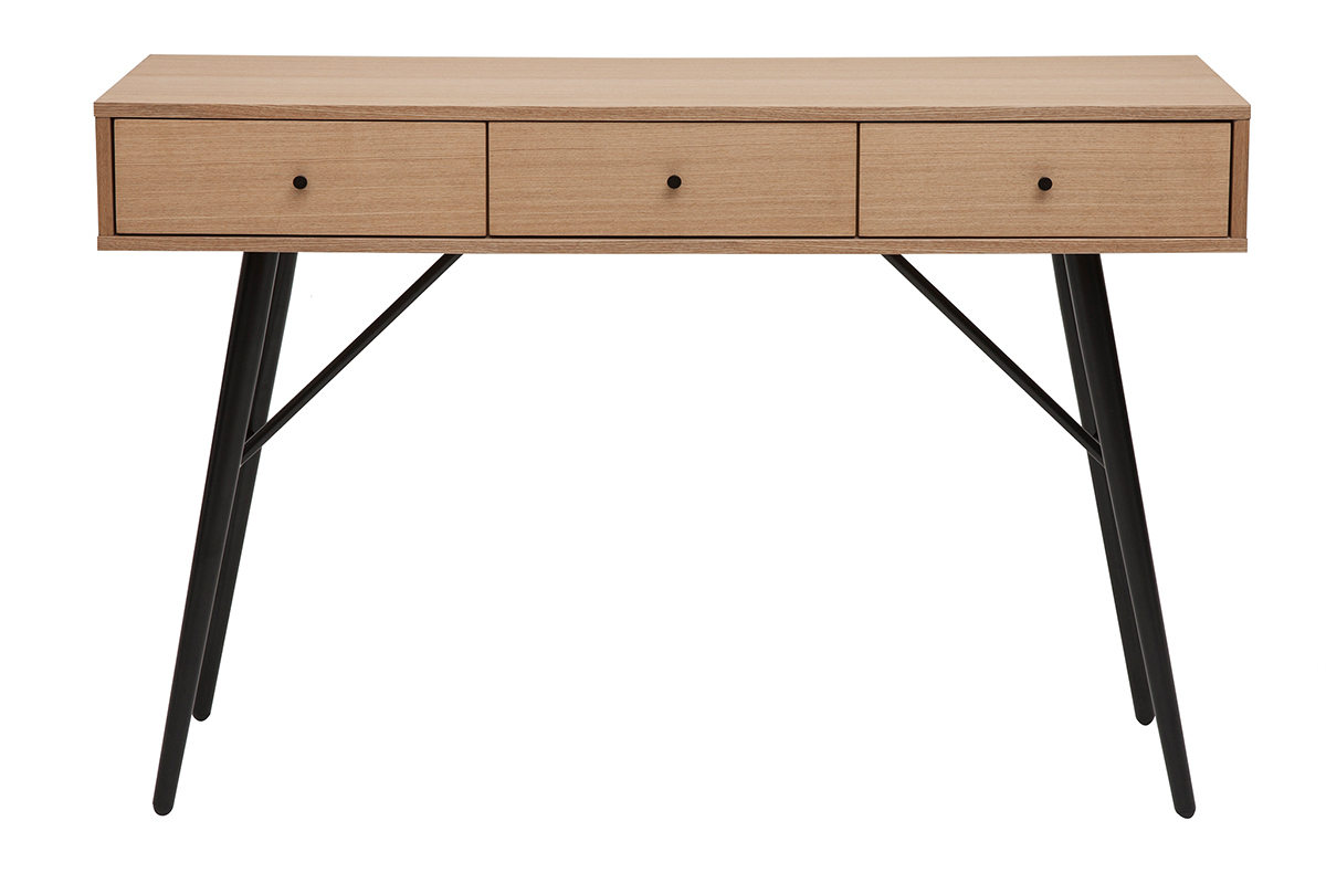 Parfait pour ranger vos clés, courriers et petits accessoires, cette table console en bois avec rangements est composée de 3 tiroirs (L32.5 x P28.7 x H8 cm) aux finitions boutons minimalistes noirs.
